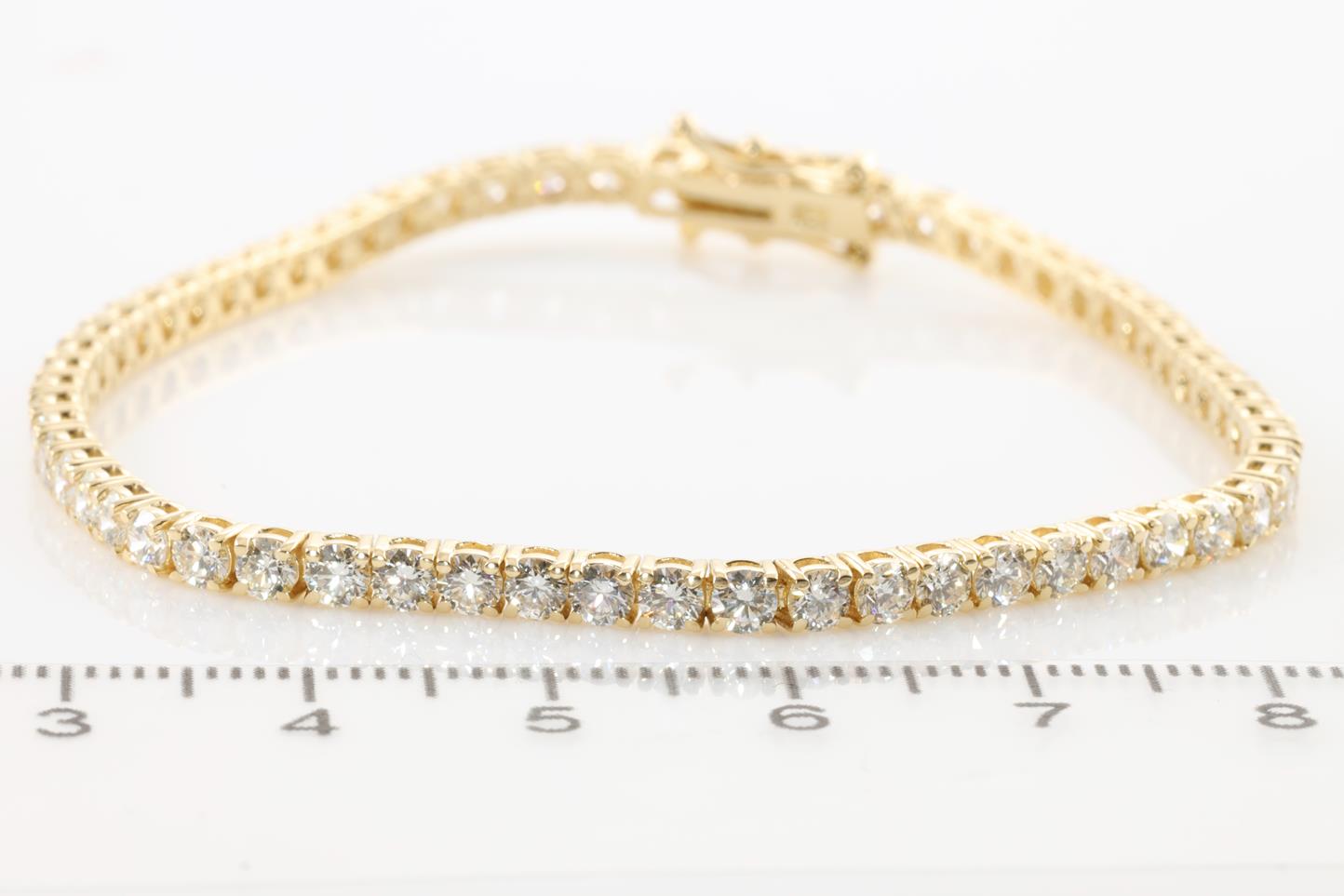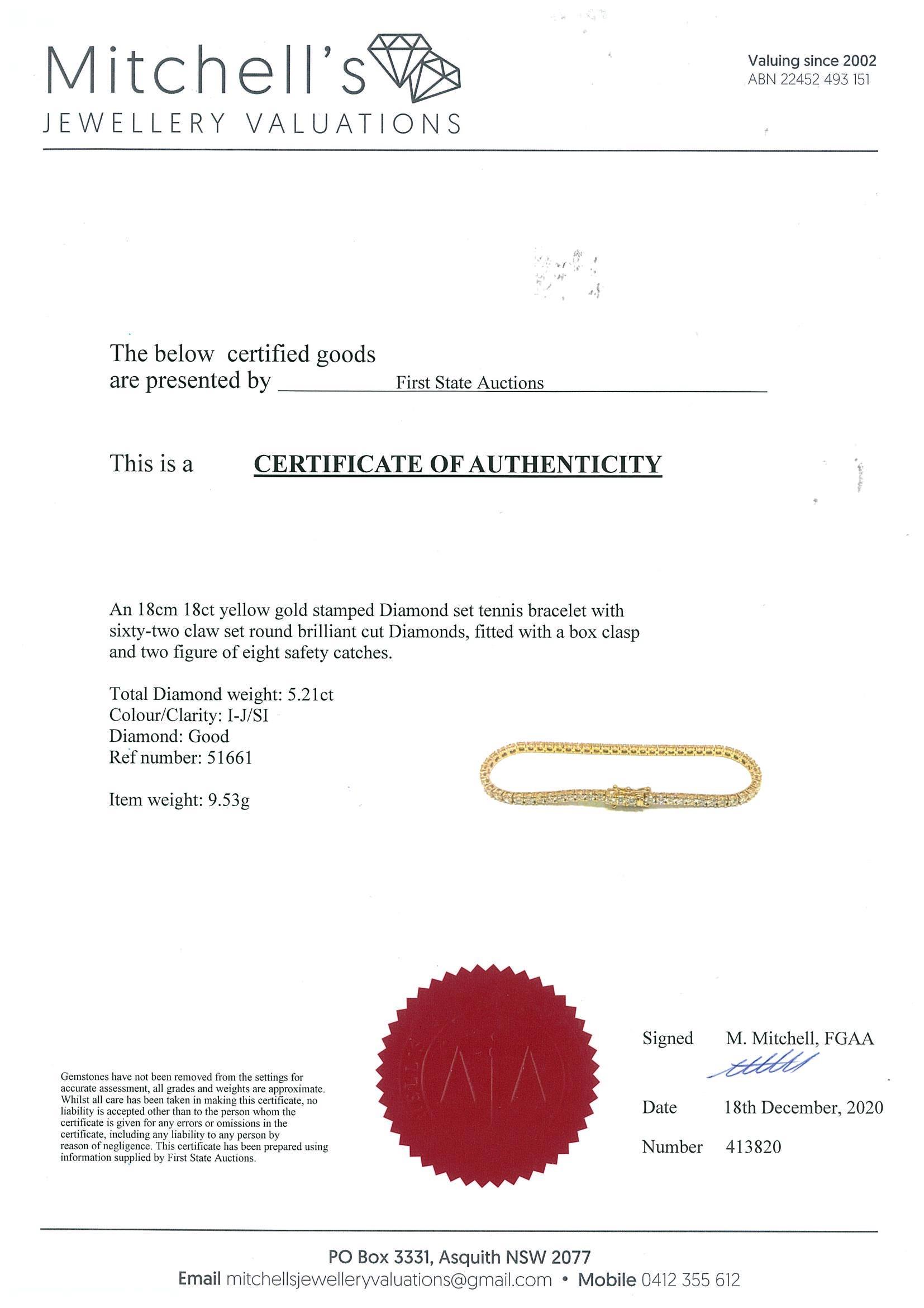 Diamond tennis bracelet with 62 round Diamonds totalling 5.21cts (Estimated grading: I-J SI). 18ct yellow gold. Length: 18cm. Weight: 9.5g. With certificate #413820 (New)
