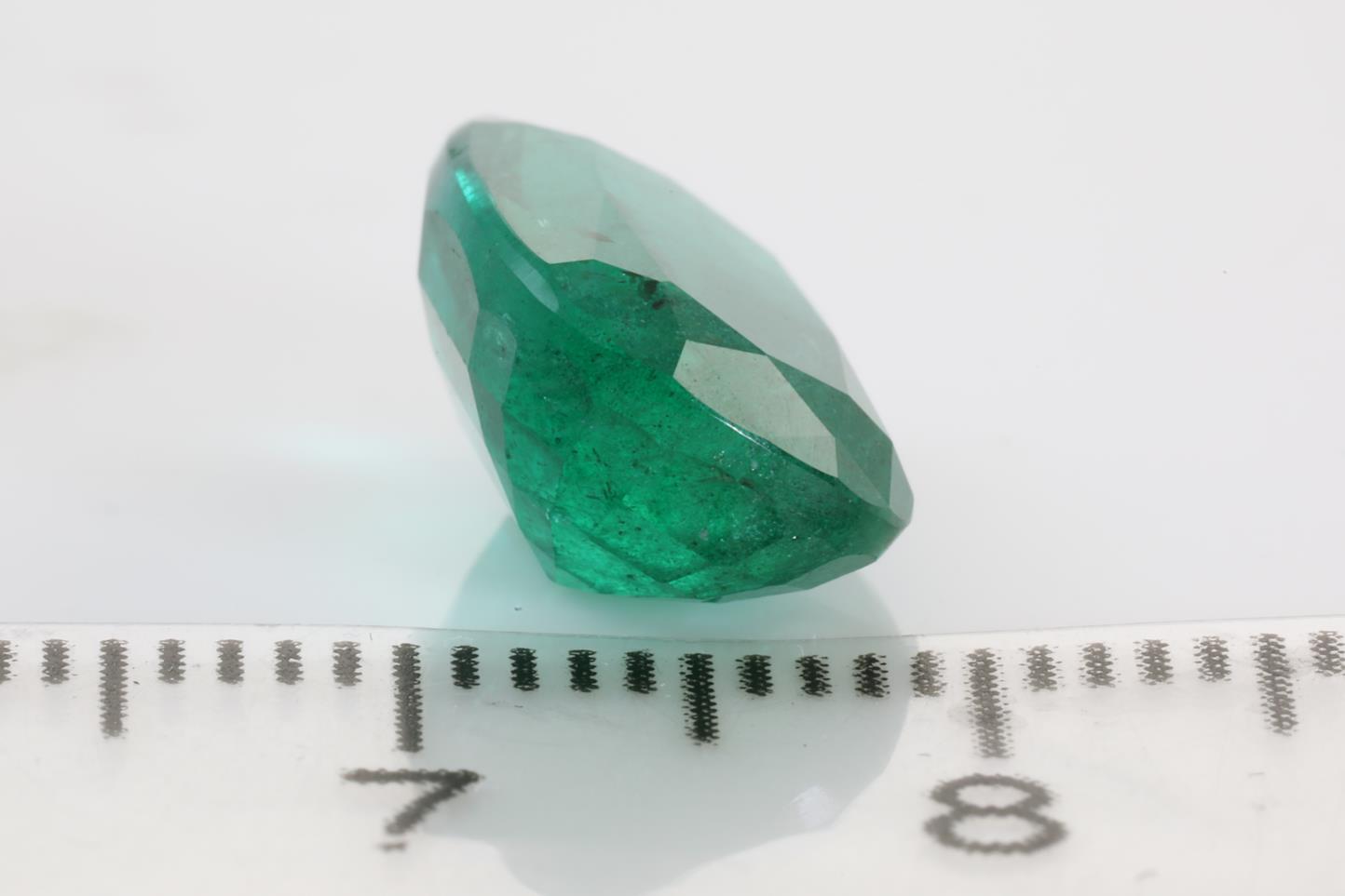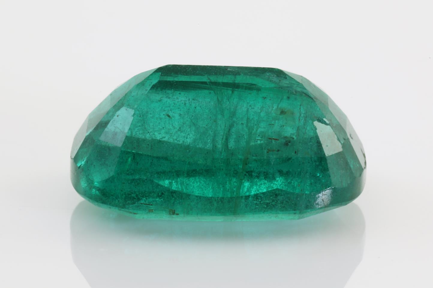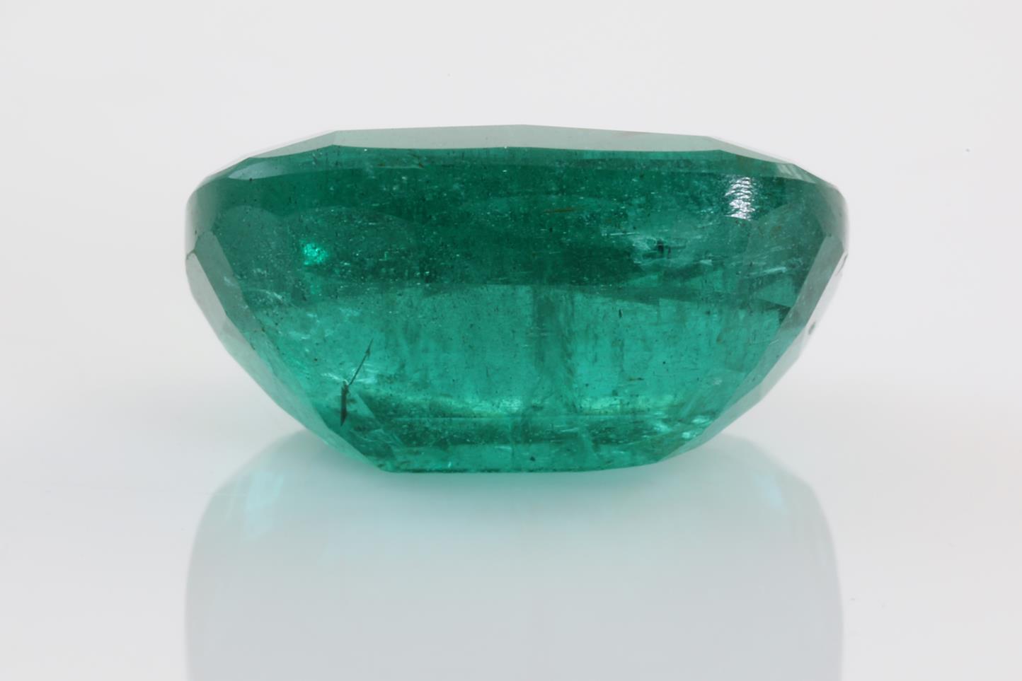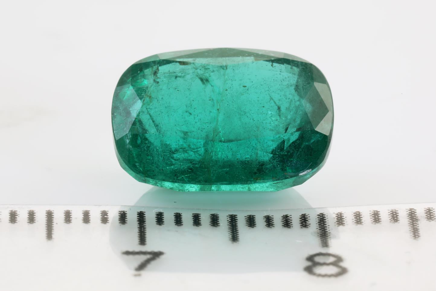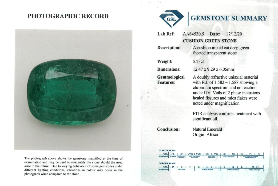 A loose cushion cut African Emerald of 5.23ct (with GSL Gemstone summary report #AA64530.5). Dimensions: 12.47 x 9.29 x 6.05mm. (New)