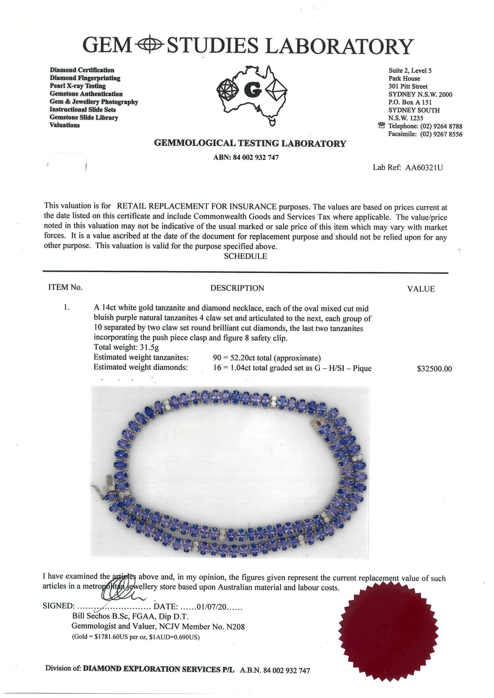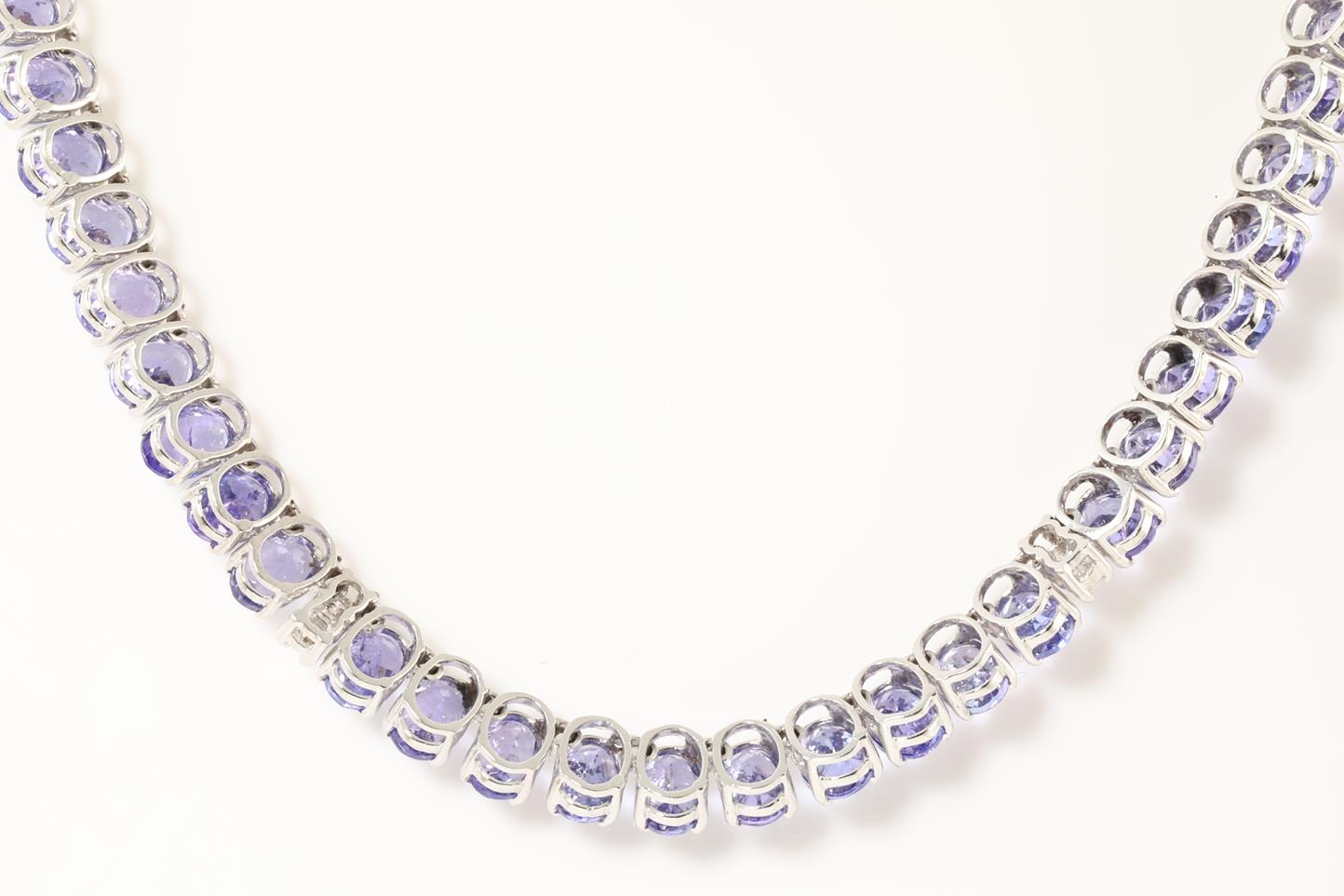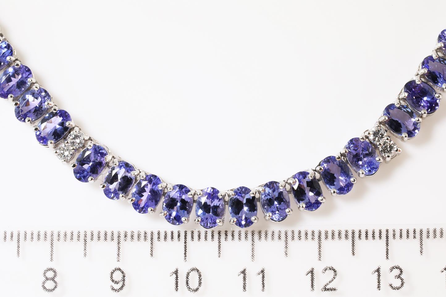 Tanzanite and Diamond necklace with round Tanzanites totalling approximately 52.20cts and round Diamonds totalling 1.04cts (Estimated grading: G-H SI-Pique). 14ct white gold. Length: 43cm. With GSL report #AA60321U). Weight: 31.5g (Pre-owned)