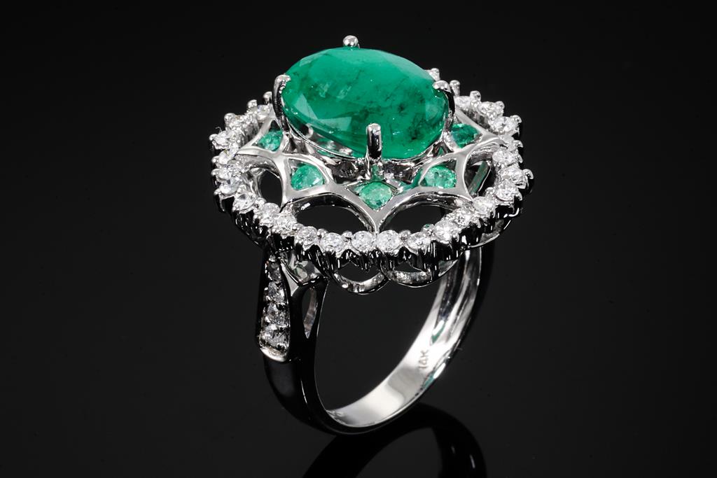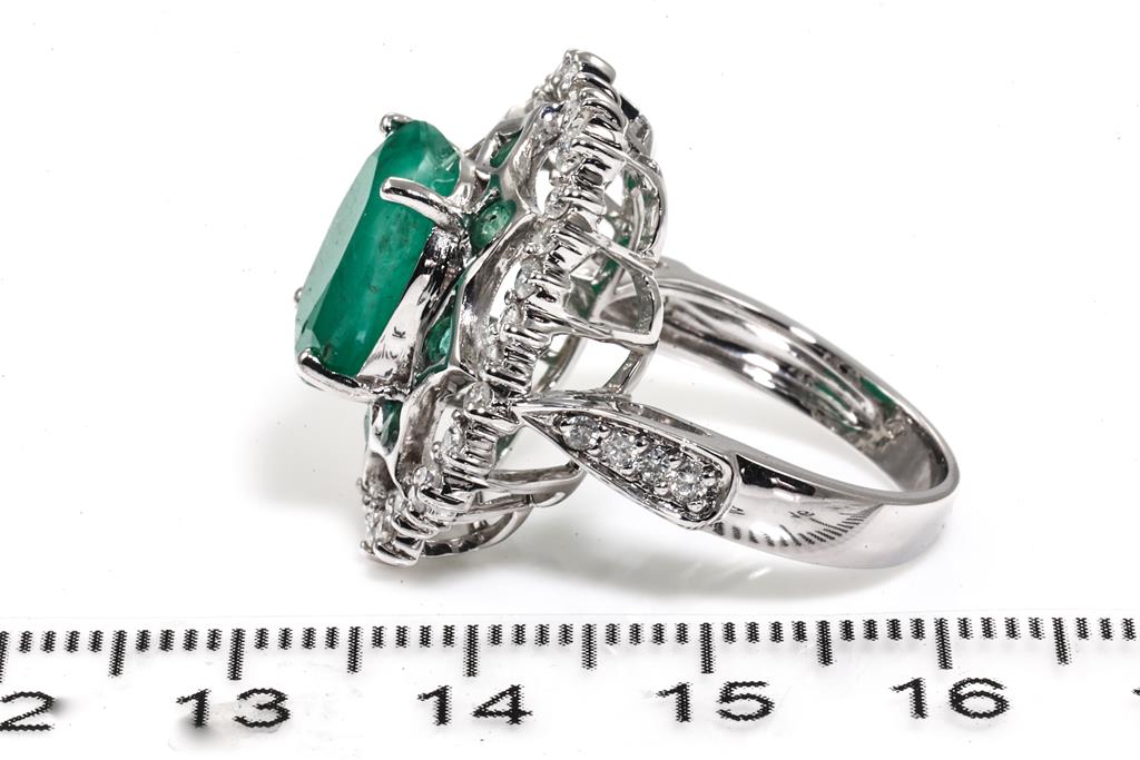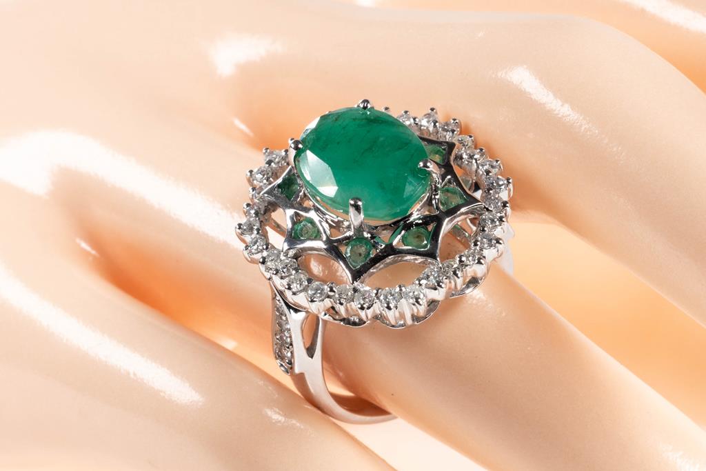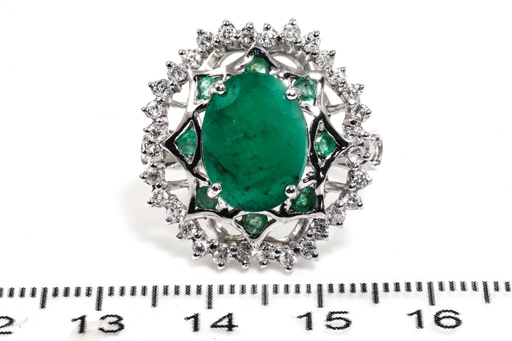 Emerald and Diamond ring with centre oval shape Emerald of approximately 5.22ct, round Emeralds totalling approximately 0.37cts and round Diamonds totalling approximately 0.76cts (Estimated grading: H-I P1-P2). 14ct white gold. Ring size N1/2. Weight 8.5g. (Pre-owned)