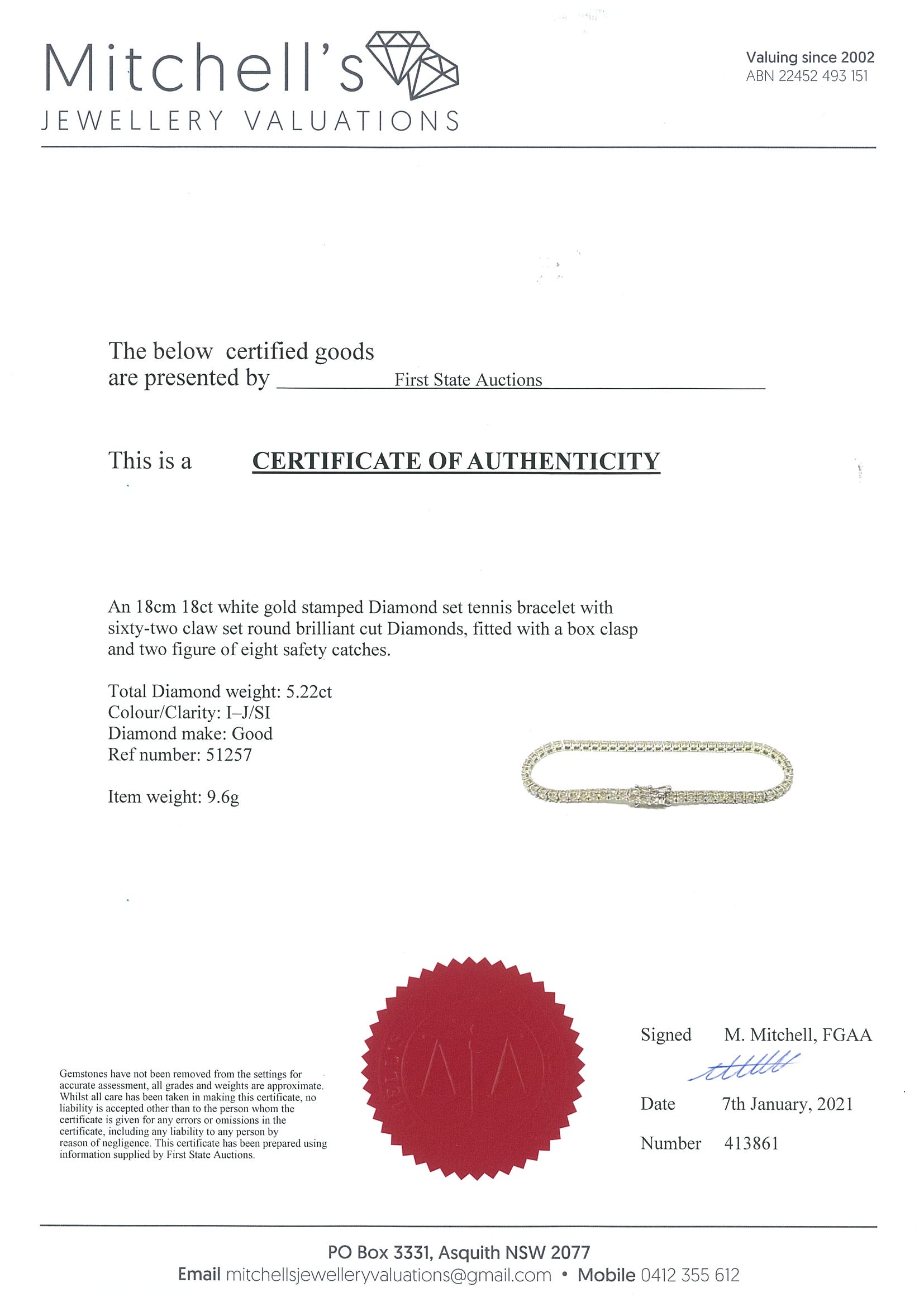 Diamond tennis bracelet with 62 round Diamonds totalling 5.22cts (Estimated grading: H-J SI). 18ct white gold. Length: 18cm Weight: 9.6g. With Certificate #413861. (New)