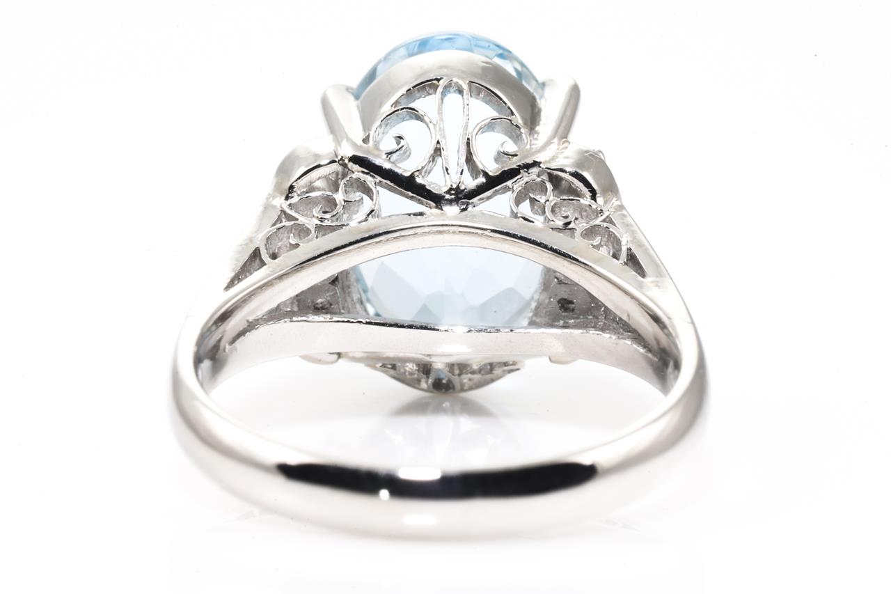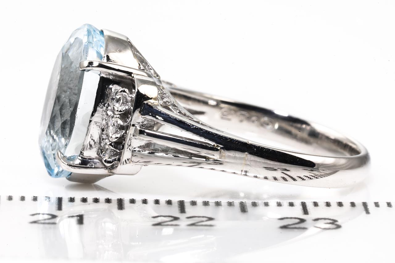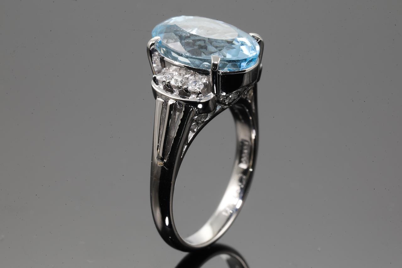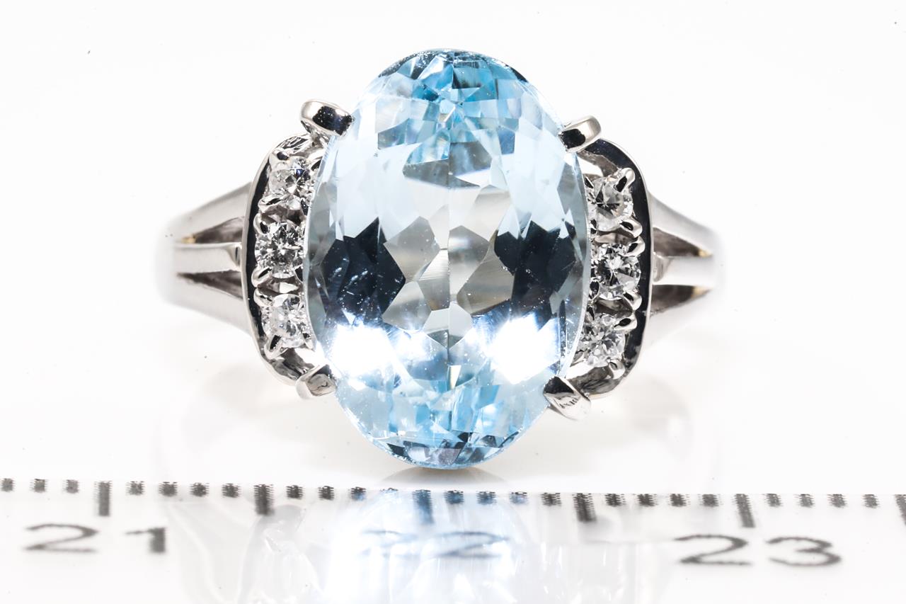 Aquamarine and Diamond ring with oval shape Aquamarine of 5.24ct and 6 Diamonds totalling 0.13cts. Platinum. Ring size L. Weight: 8.1g (Pre-owned)