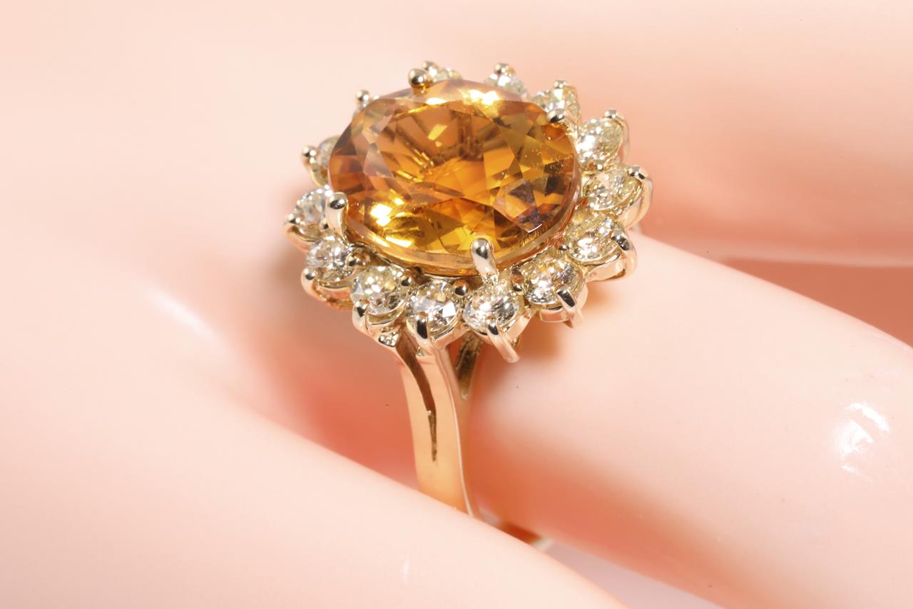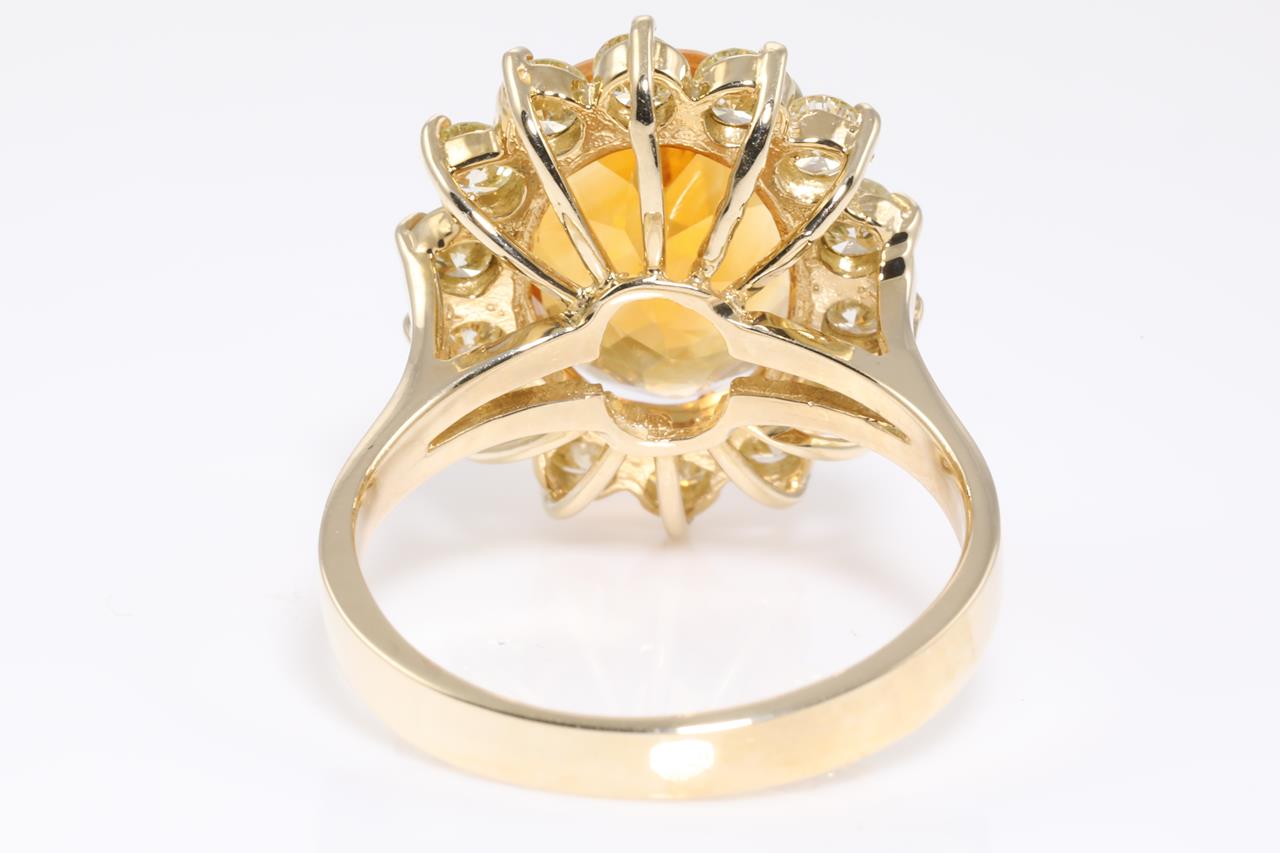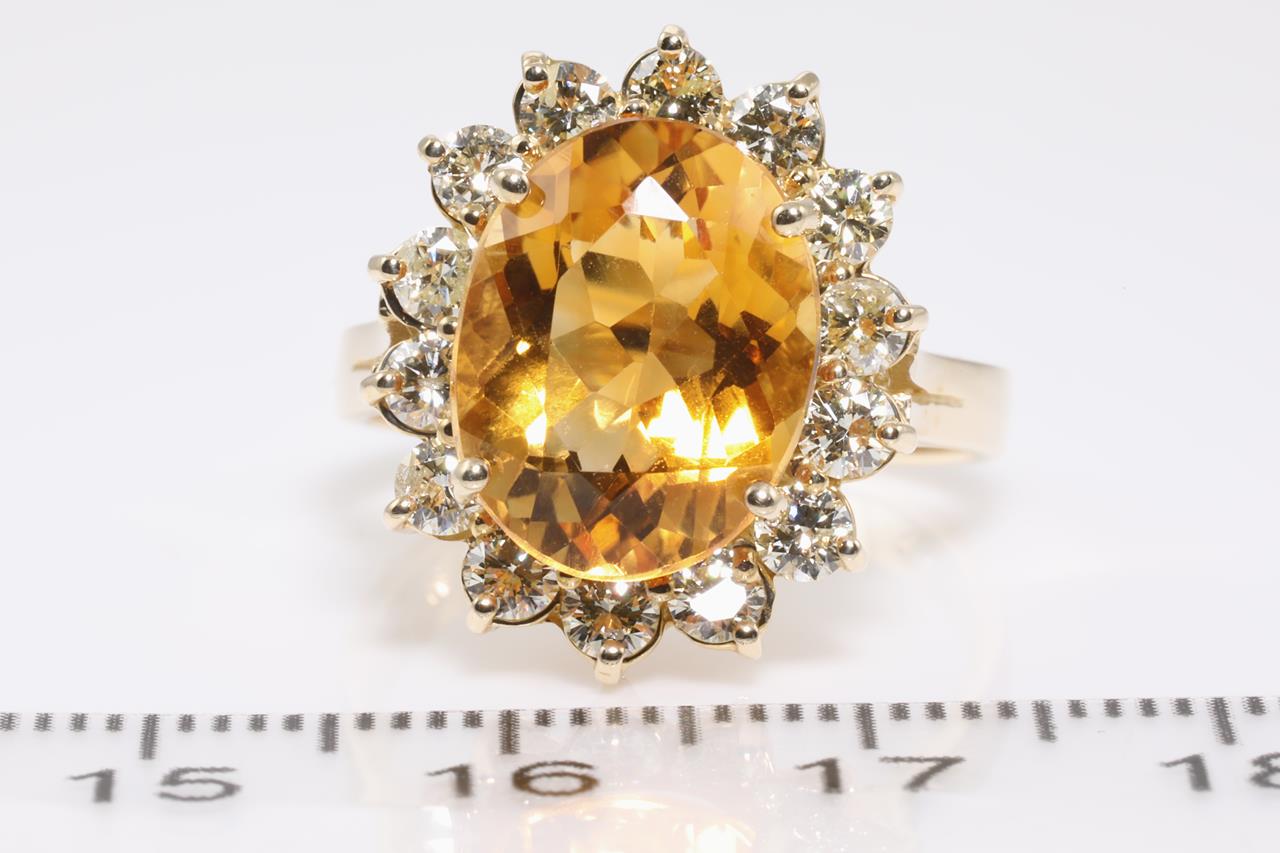 Citrine and Diamond Ring with oval cut Citrine of approximately 5.30ct and round Diamonds totalling 1.20cts approximately (Estimate grading: L SI). 14ct yellow gold. Ring size O. Weight 5.9g. (Pre-owned)