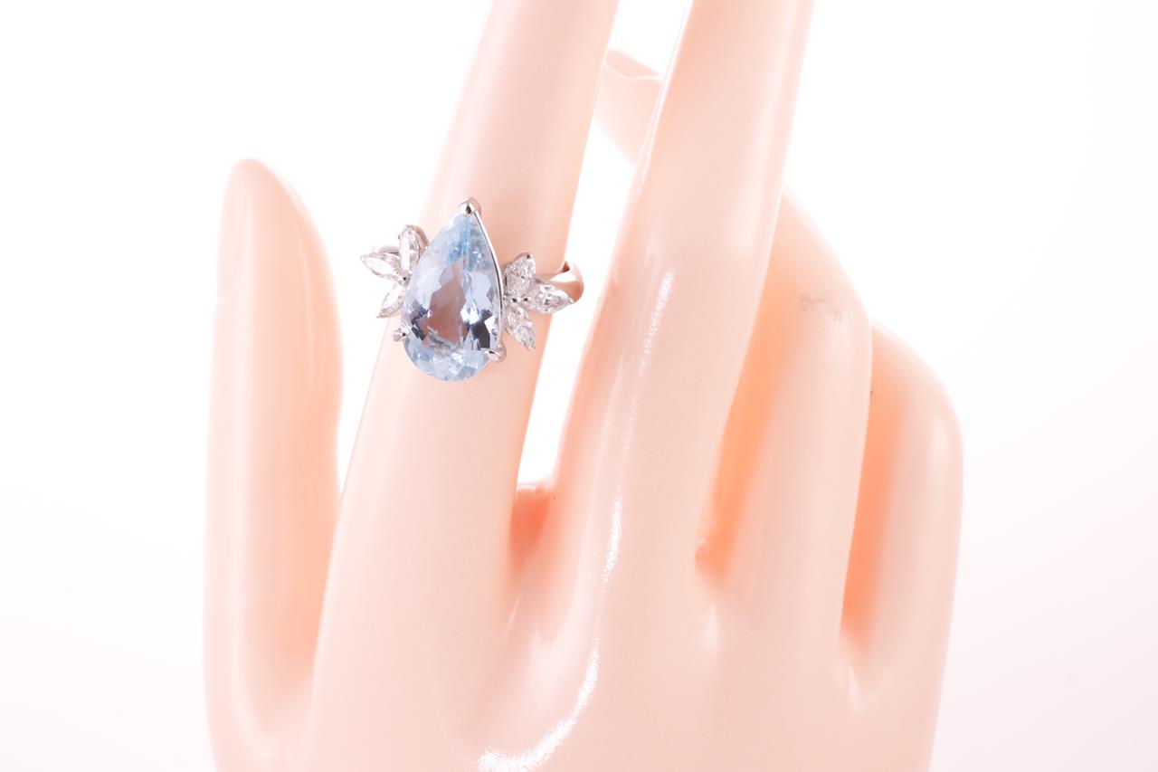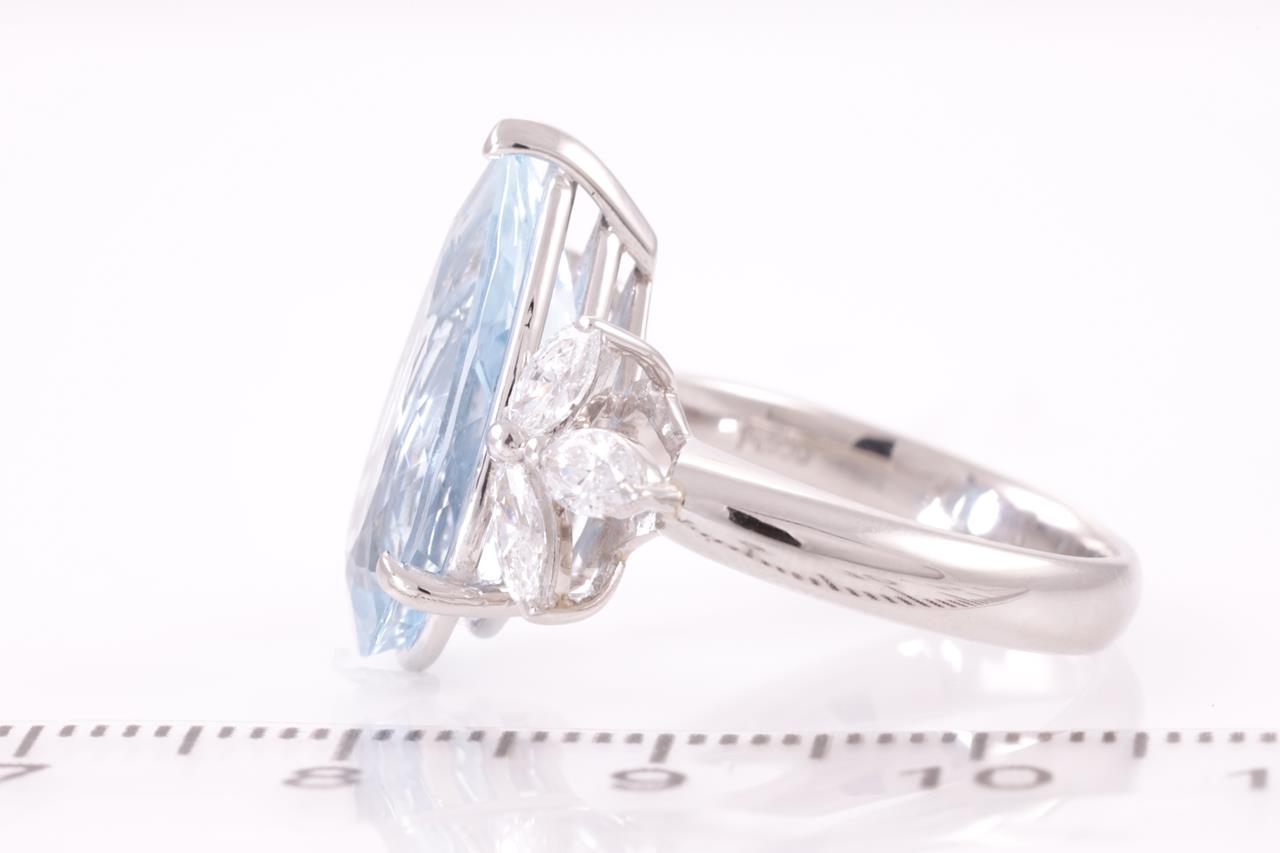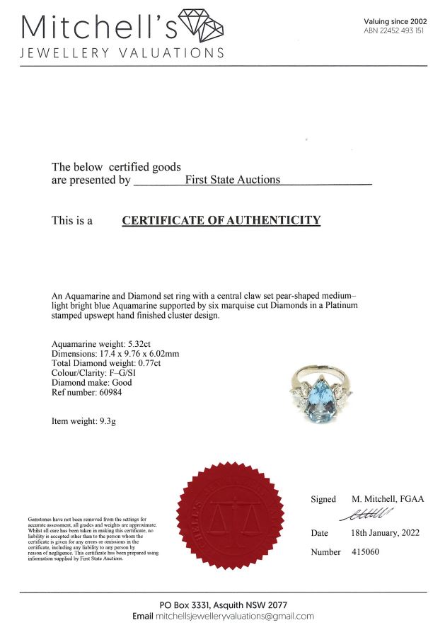 Aquamarine and Diamond ring with pear cut Aquamarine of 5.32ct and marquise cut Diamonds totalling 0.77cts (Estimated grading: F-G SI). Platinum. Ring size M - ring resizing is not recommended. Weight: 9.3g. With certificate #415060. (Pre-owned)