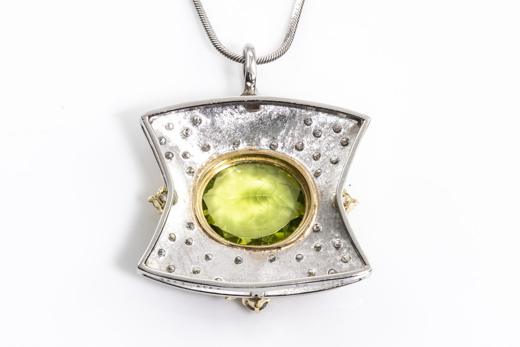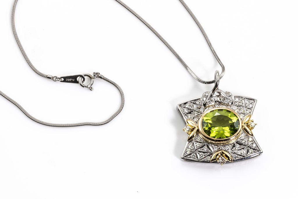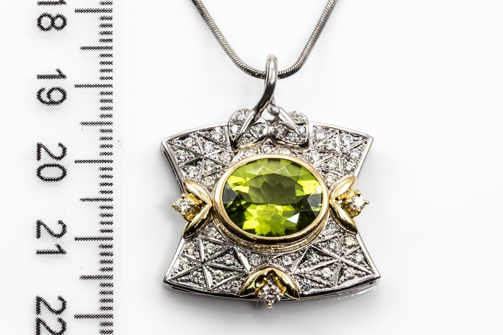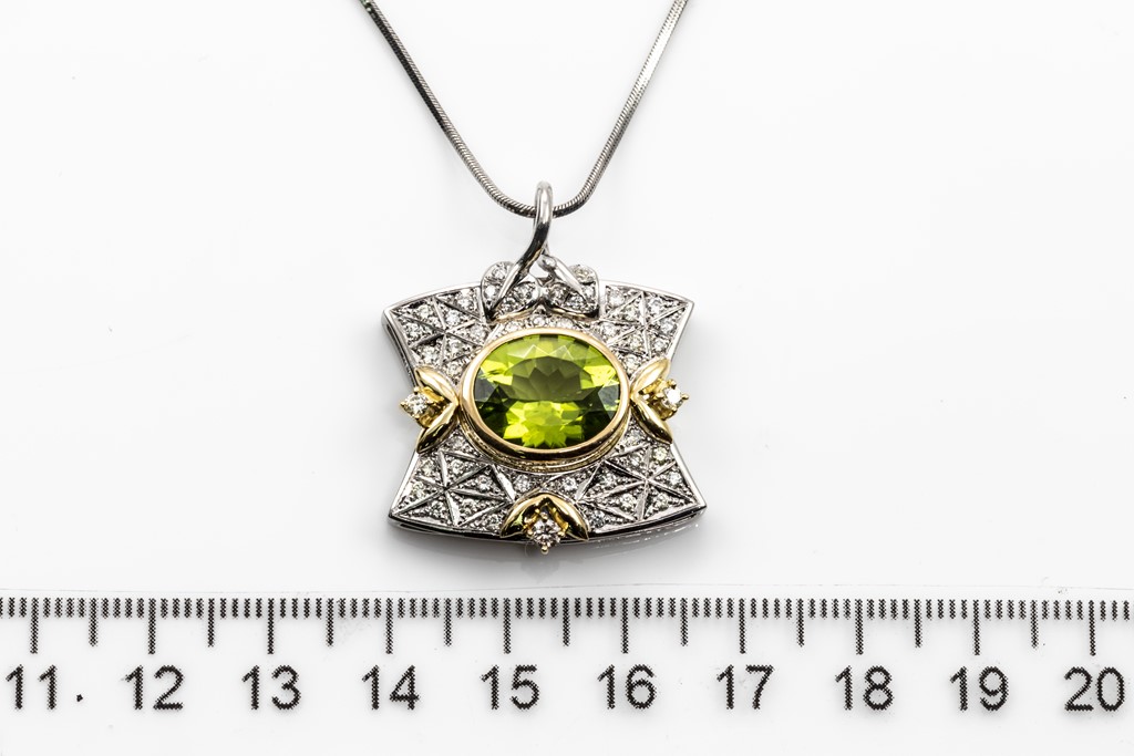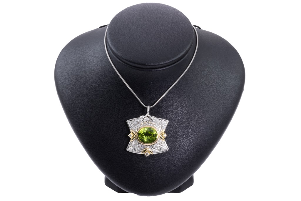 Peridot and Diamond pendant with an oval Peridot of 5.35ct and round Diamonds totalling 0.62cts (Estimated grading: H-I SI). 18ct yellow gold and platinum with platinum 41cm chain. Weight: 15.9g (Pre-owned)