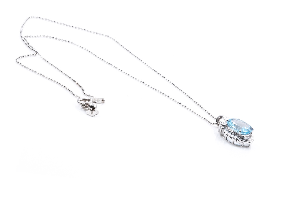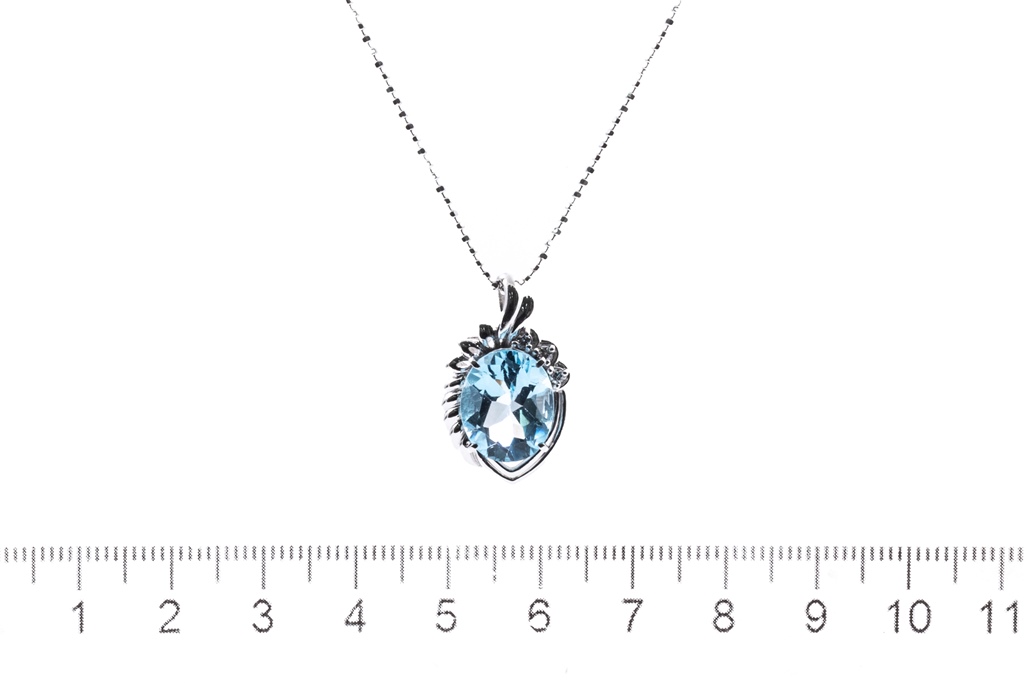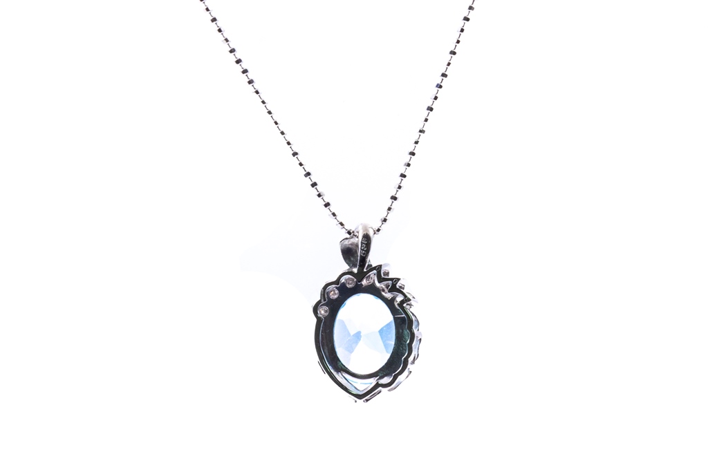 Topaz and Diamond pendant with an oval shape Topaz of 5.36ct (note minor wear marks) and Diamonds totalling 0.05cts. 18ct white gold with 45cm adjustable 18ct white gold chain. Weight: 7.9g. (Pre-owned)