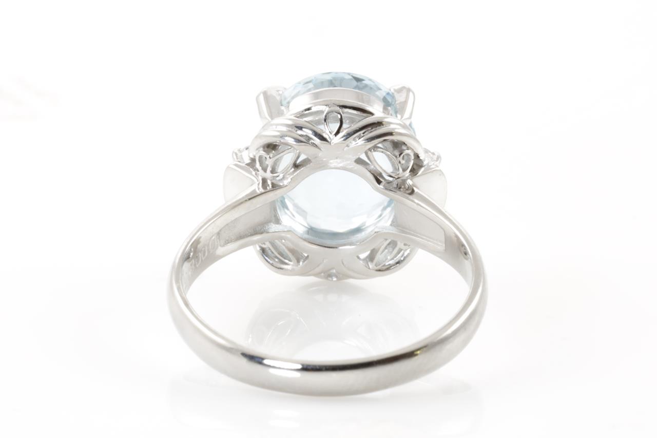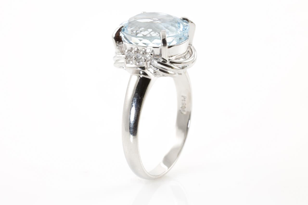 Aquamarine and Diamond ring with an oval Aquamarine of 5.38ct and Diamonds totalling 0.08cts. Platinum. Ring size P. Weight: 8.3g (Pre-owned)