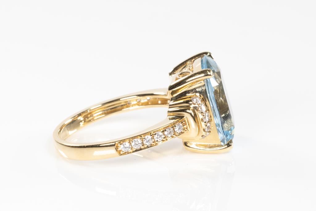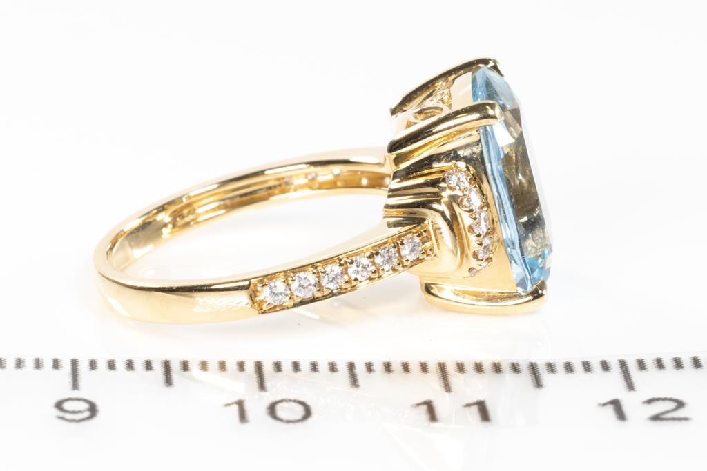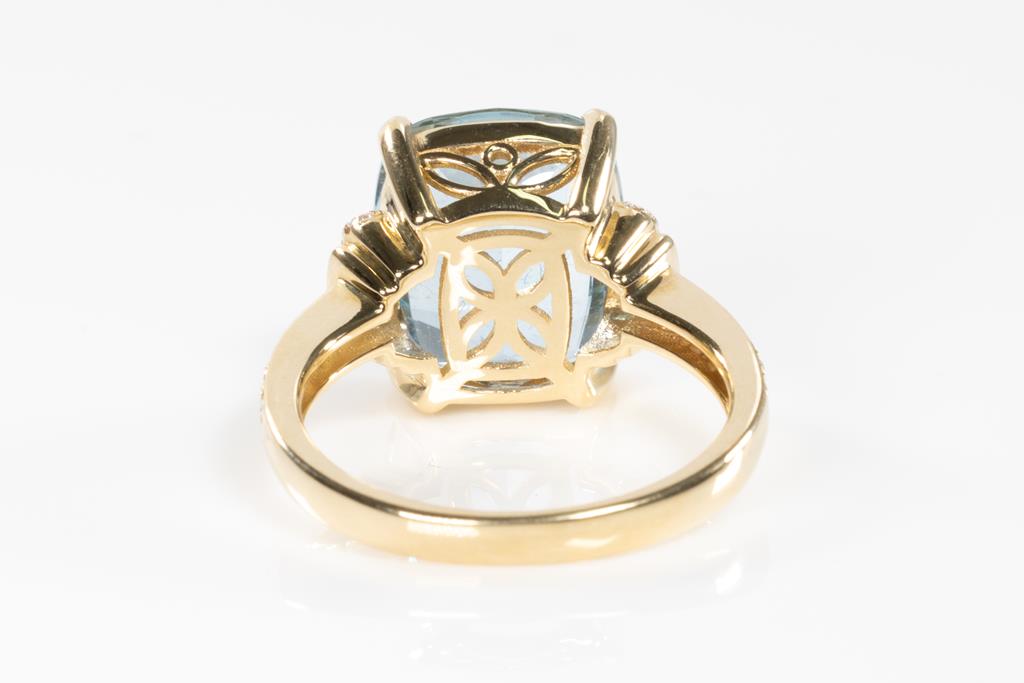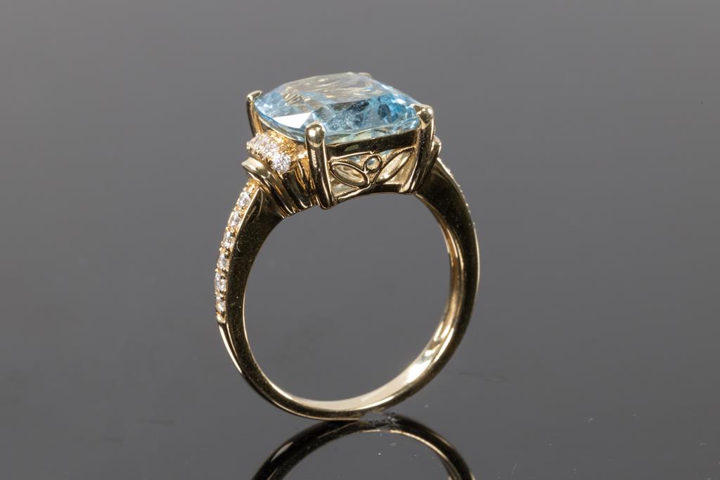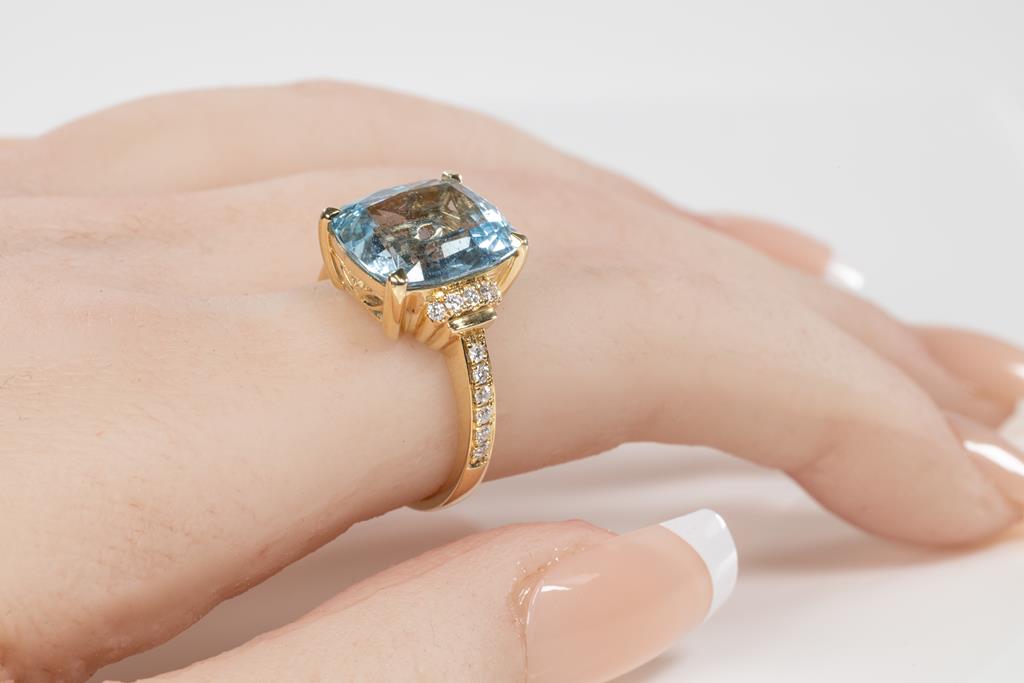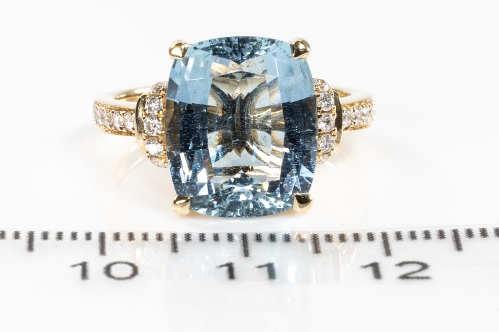 Aquamarine and Diamond ring with a cushion cut Aquamarine of 5.39ct and round Diamonds totalling 0.24cts. 14ct yellow gold. Ring size: N. Weight: 5.3g. (As New)