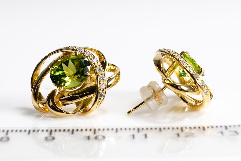 Peridot and Diamond earrings with oval shape Peridots totalling 5.40cts and round Diamonds totalling 0.32cts. (Estimated grading: G SI). 18ct yellow gold with gold & silicon backs. Weight: 11g. (Pre-owned)
