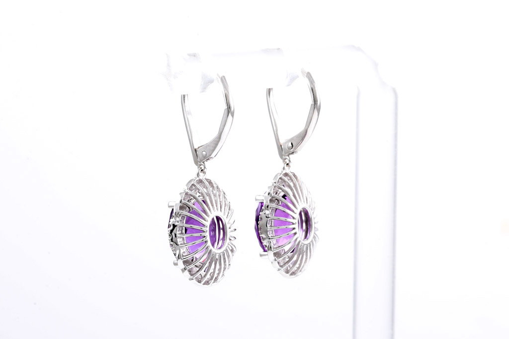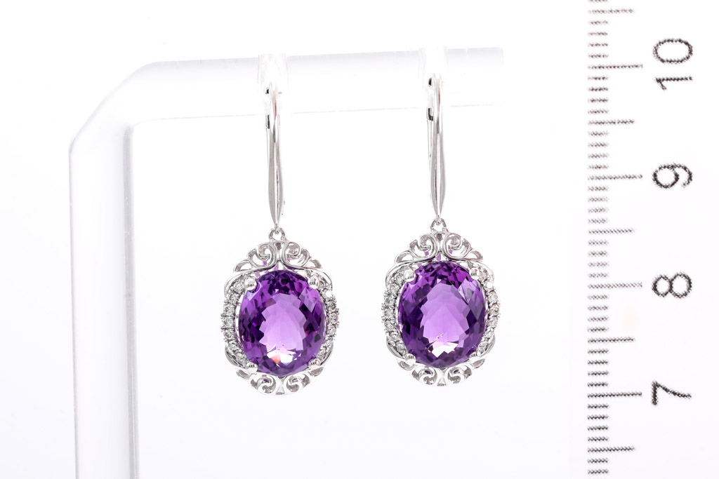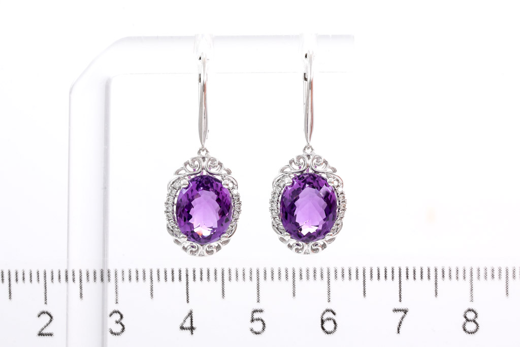 Amethyst and Diamond lever back earrings with oval checkerboard shape Amethysts totalling 5.44cts and Diamonds totalling 0.15cts. 14ct white gold. Weight: 4.4g. (New)