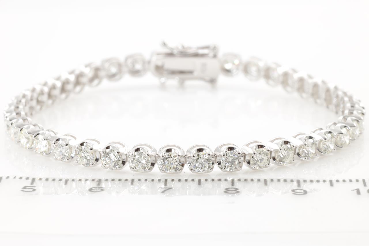 Diamond tennis bracelet with 40 round Diamonds totalling 5.45cts (Estimated grading: HIJ SI). 18ct white gold. Length: 18cm. Weight: 11.9g. With certificate #414423. (New)
