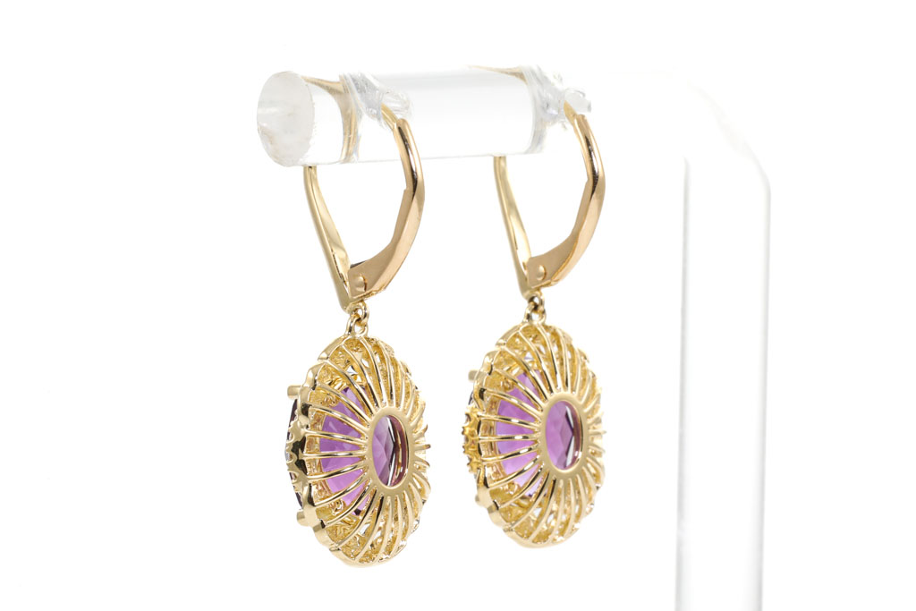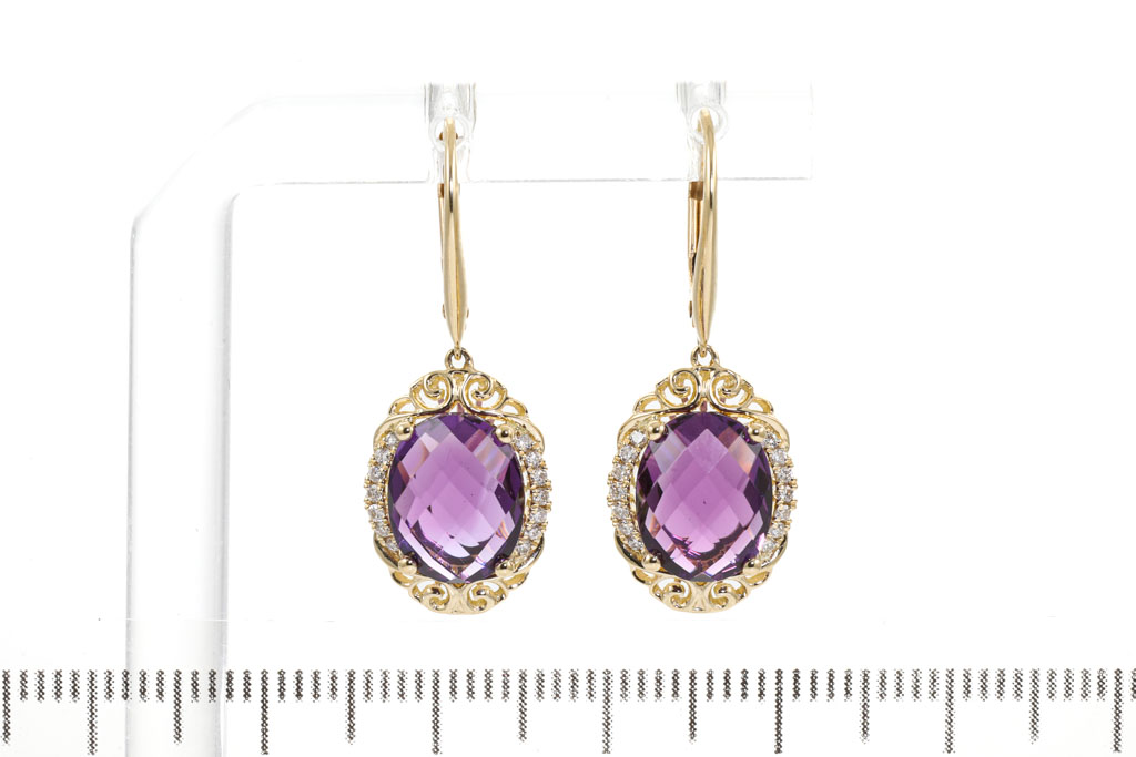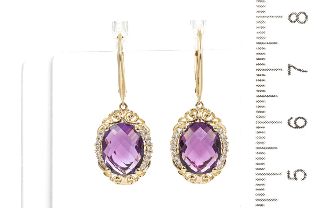 Amethyst and Diamond lever back earring with oval shape, checkerboard cut Amethysts totalling 5.49cts and Diamonds totalling 0.15cts. 14ct yellow gold. Weight: 4.3g. (New)