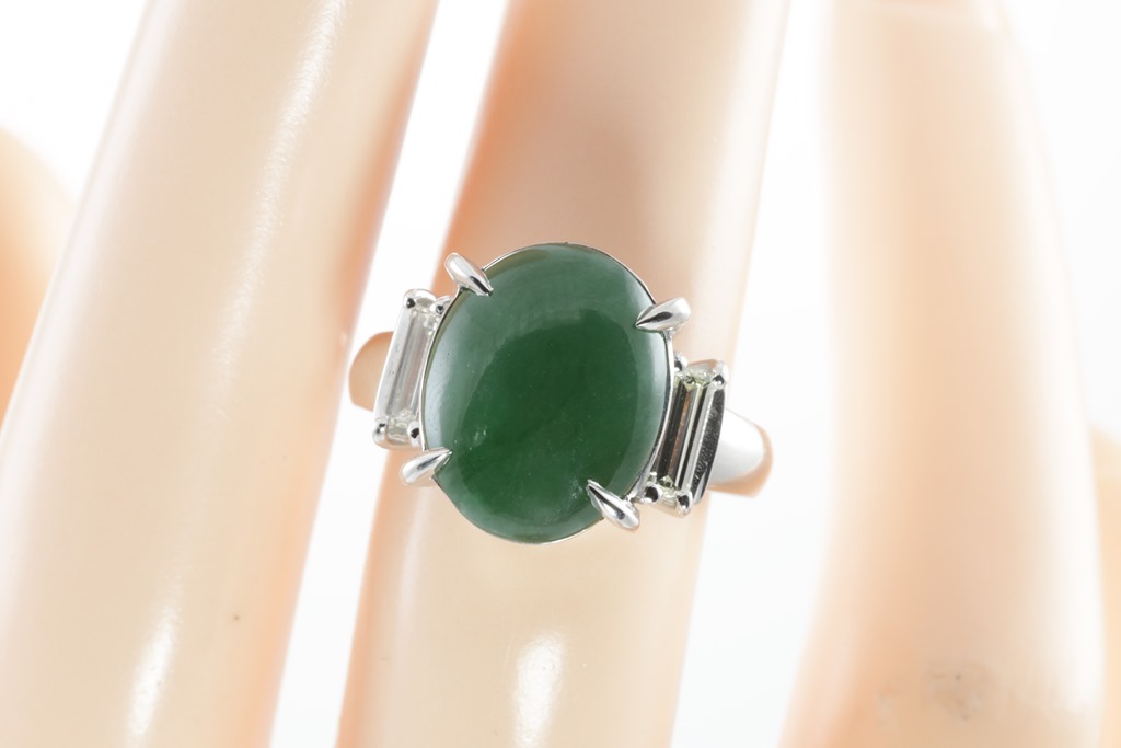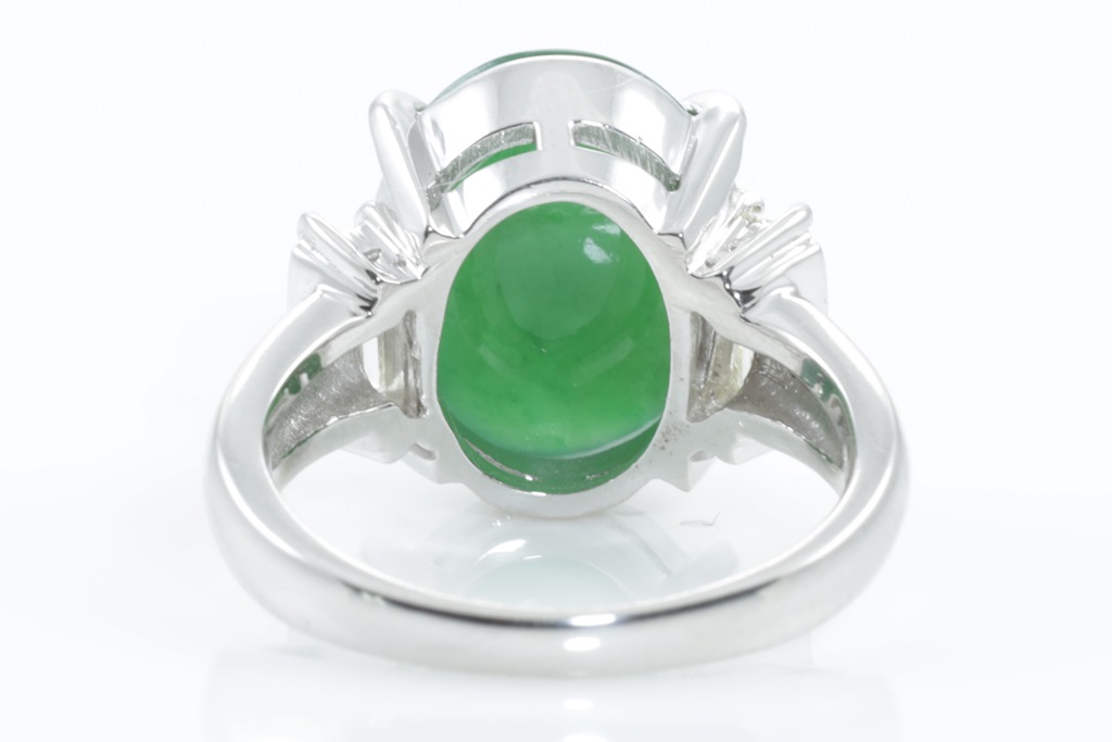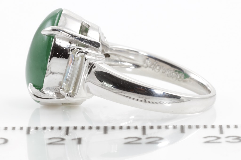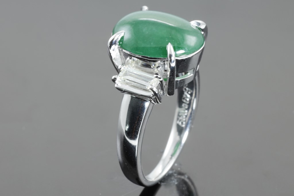 Jade and Diamond ring with centre oval cabochon cut Type A natural green Jadeite of 5.49ct and baguette cut Diamonds totalling 0.39cts (Estimated grading: I VS). Platinum. Ring size: K. Weight: 9.5g. (Pre-owned)