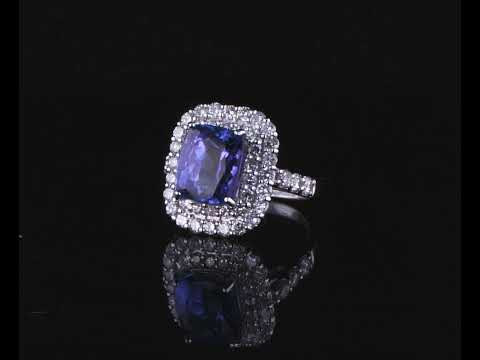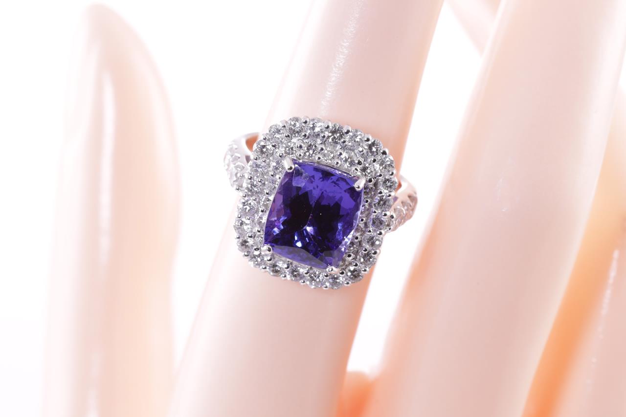 Tanzanite and Diamond ring with a cushion cut Tanzanite of 5.49ct and Diamonds totalling 1.80cts (Estimated grading: H SI). Platinum. Ring size L1/2 - can be resized up by a maximum of 3 sizes, down with ring clip. Weight: 8.8g. With certificate #415095. (Pre-owned)