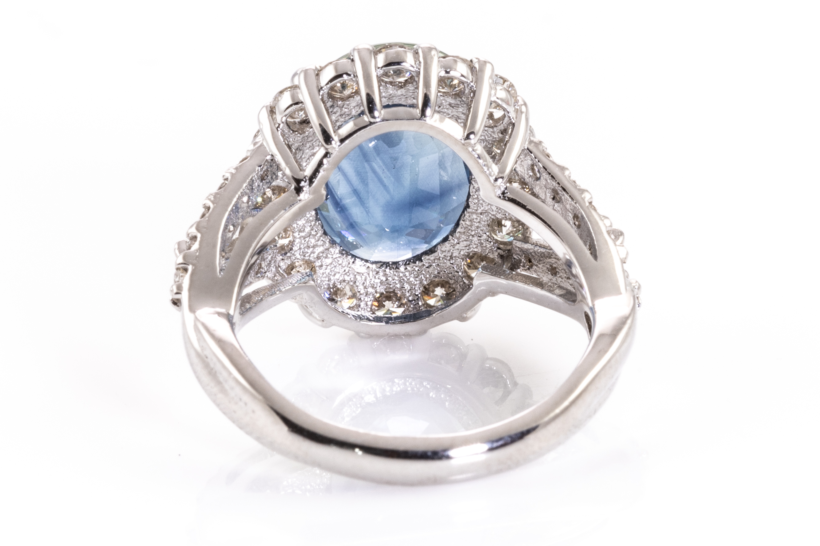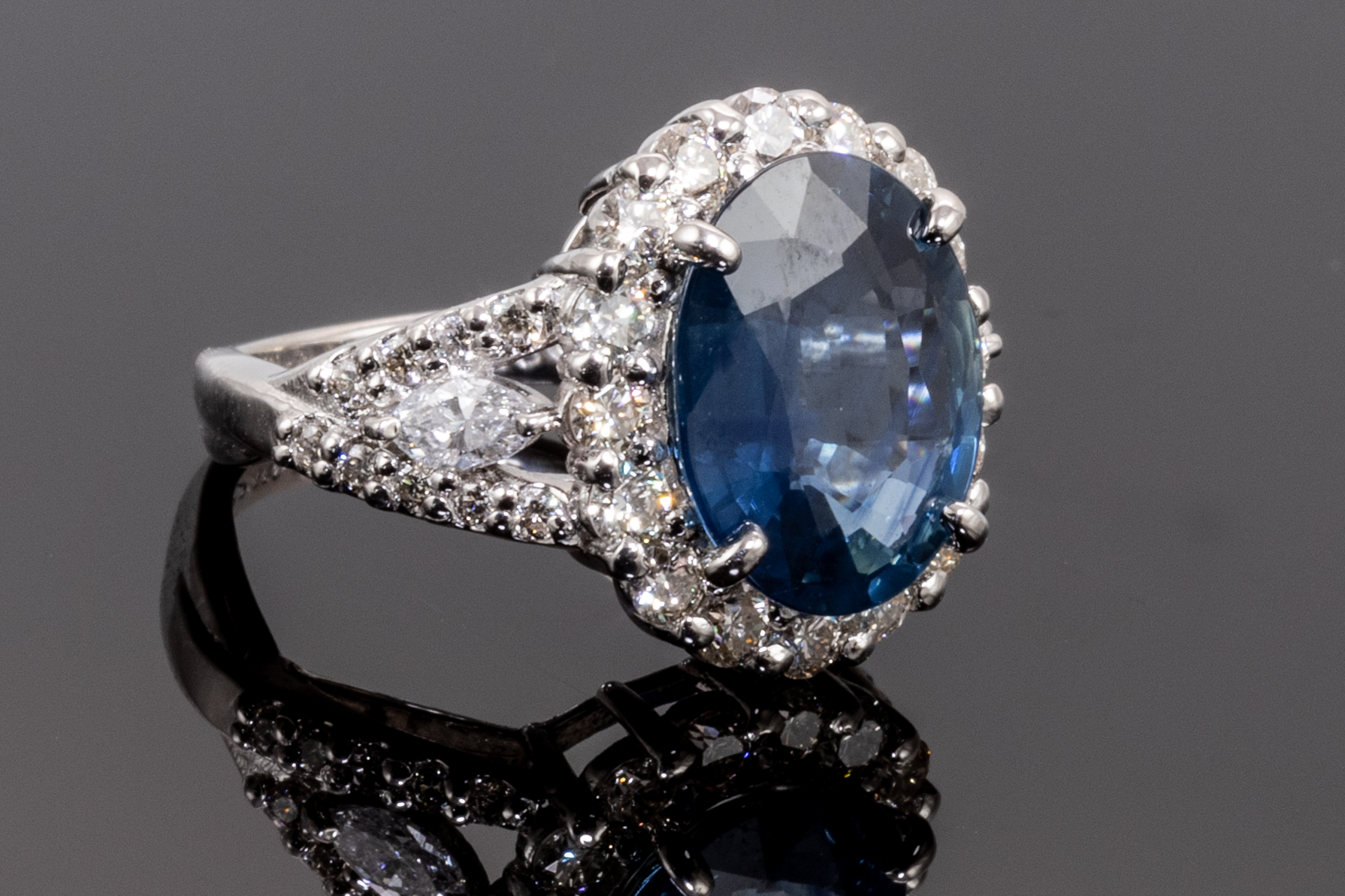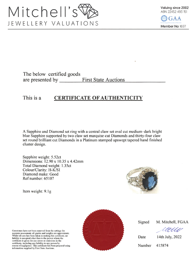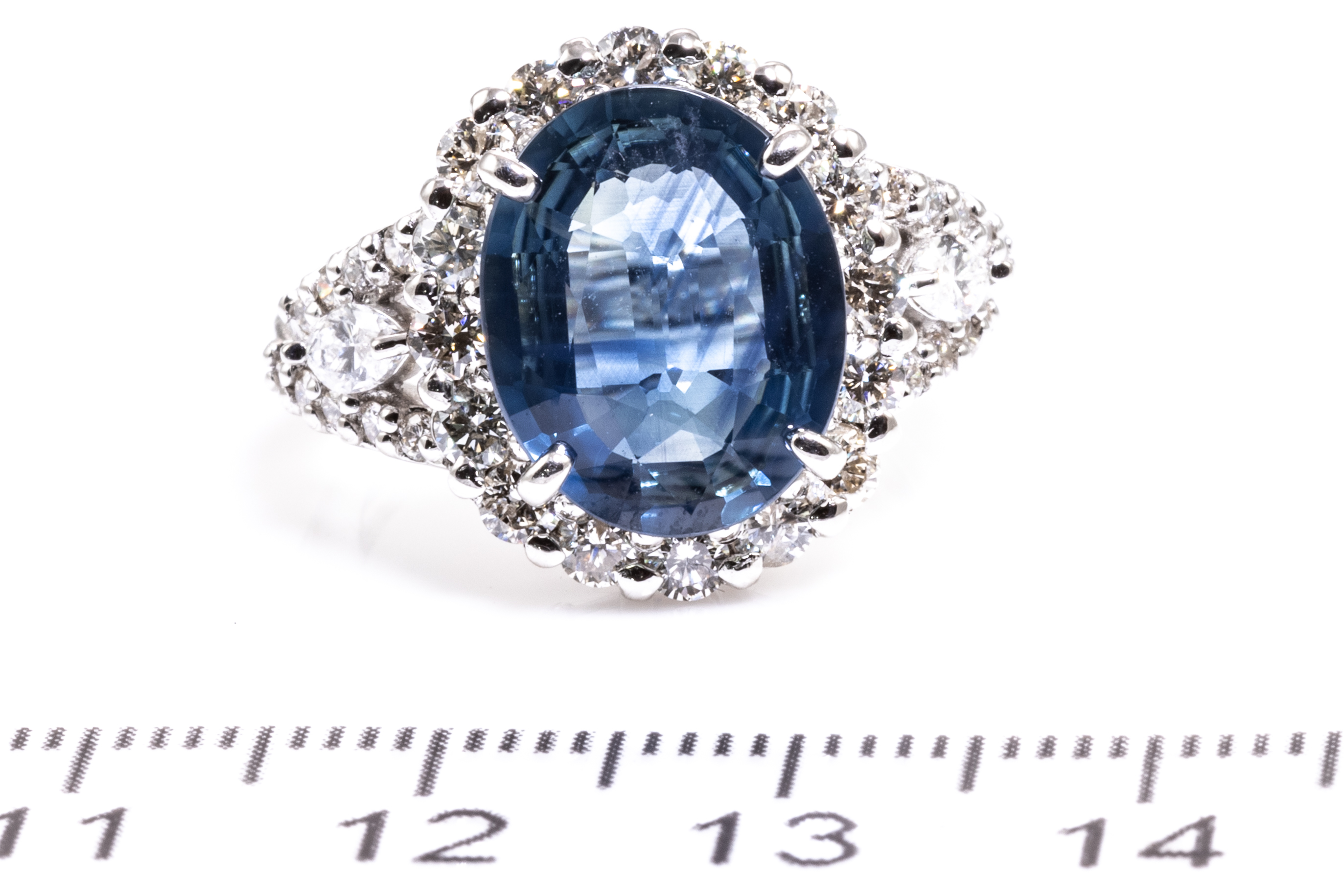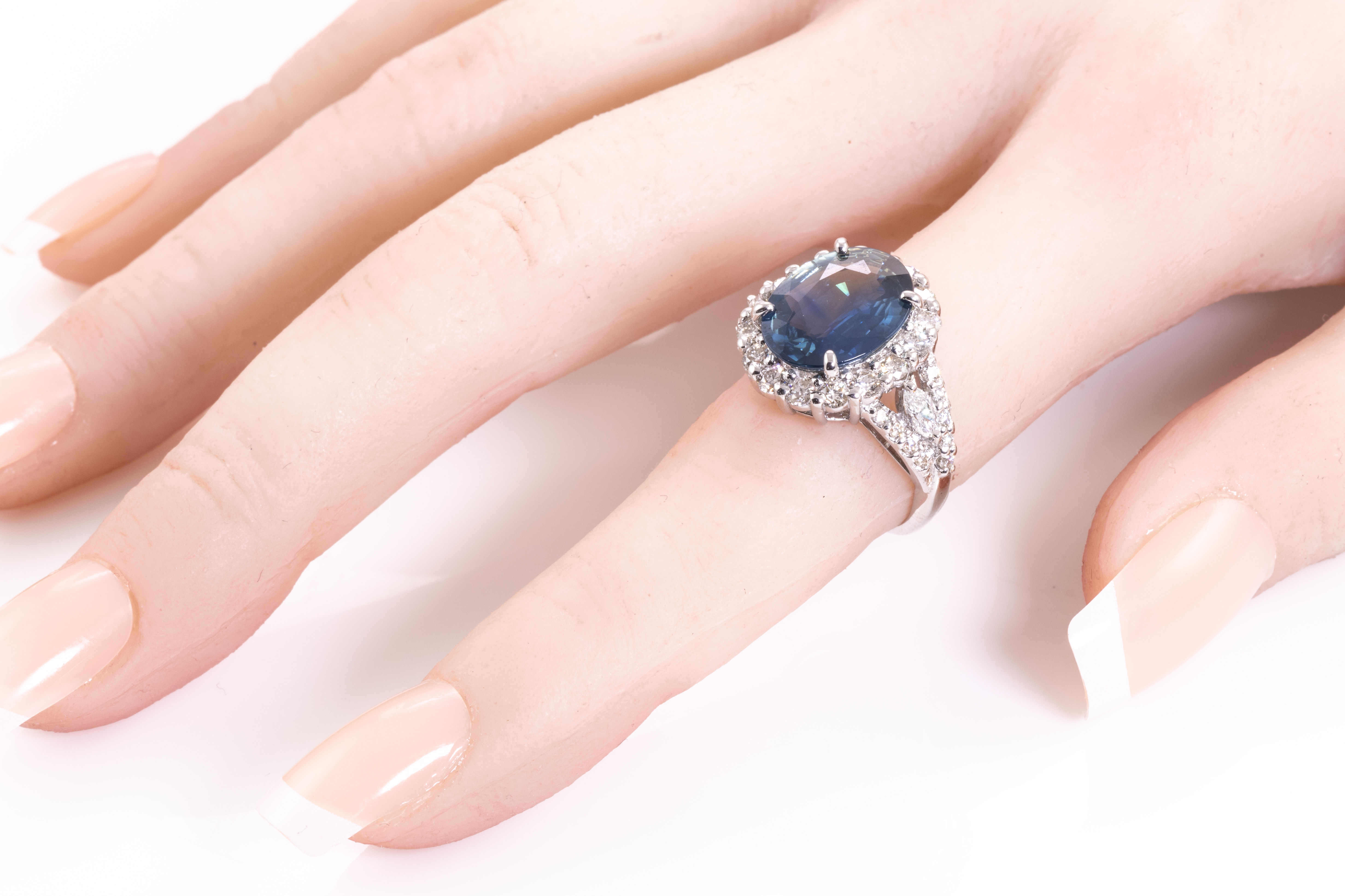 Sapphire and Diamond ring with oval blue Sapphire of 5.52ct and round & marquise cut Diamonds totalling 1.35cts (Estimated grading: H-K SI). Platinum. Ring size L. Weight: 9.1g. With Certificate #415874. (Pre-owned)