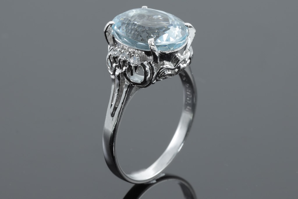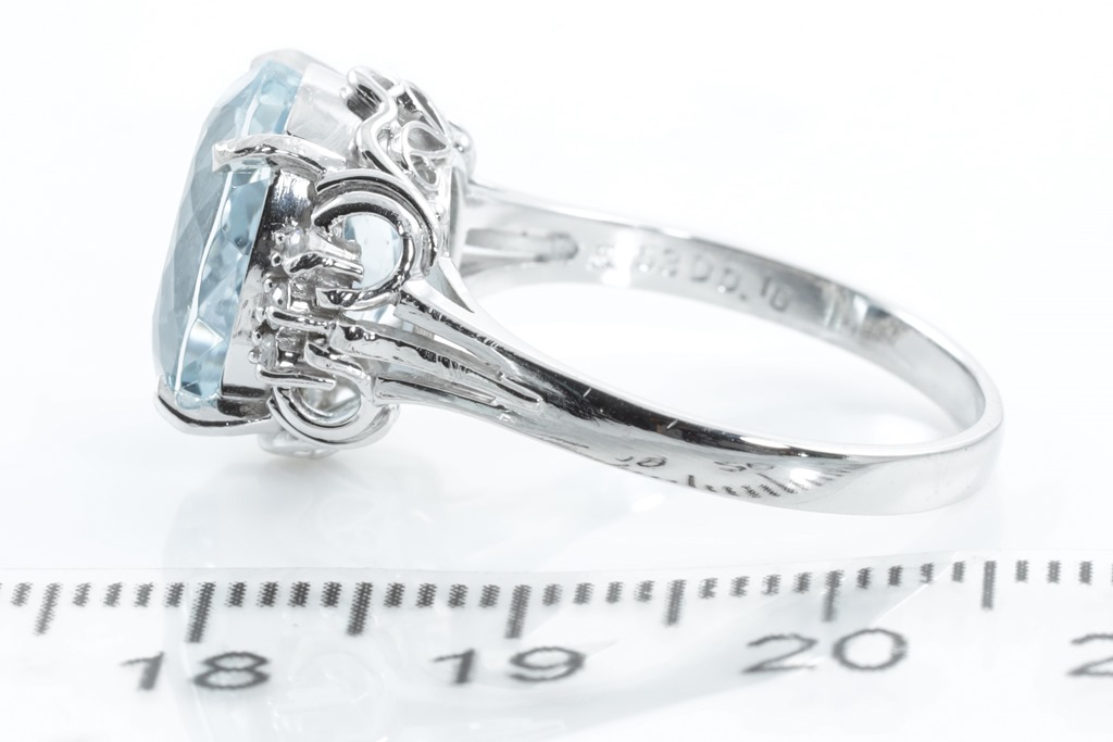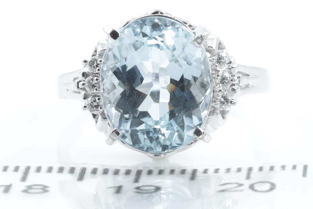 Aquamarine and Diamond Ring with an oval shape Aquamarine of 5.53ct and round Diamonds totalling 0.10cts. Platinum. Ring size P. Weight: 7g (Pre-owned)
