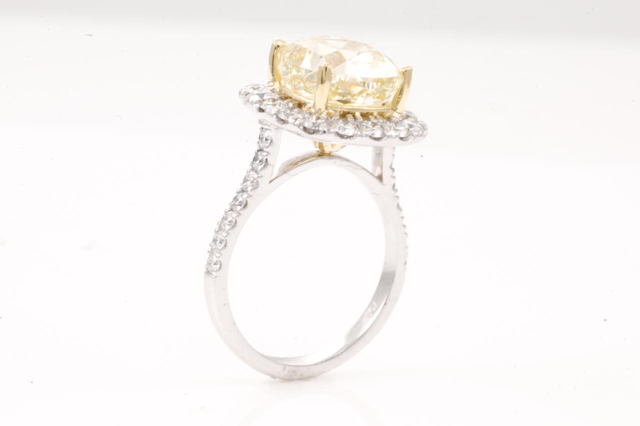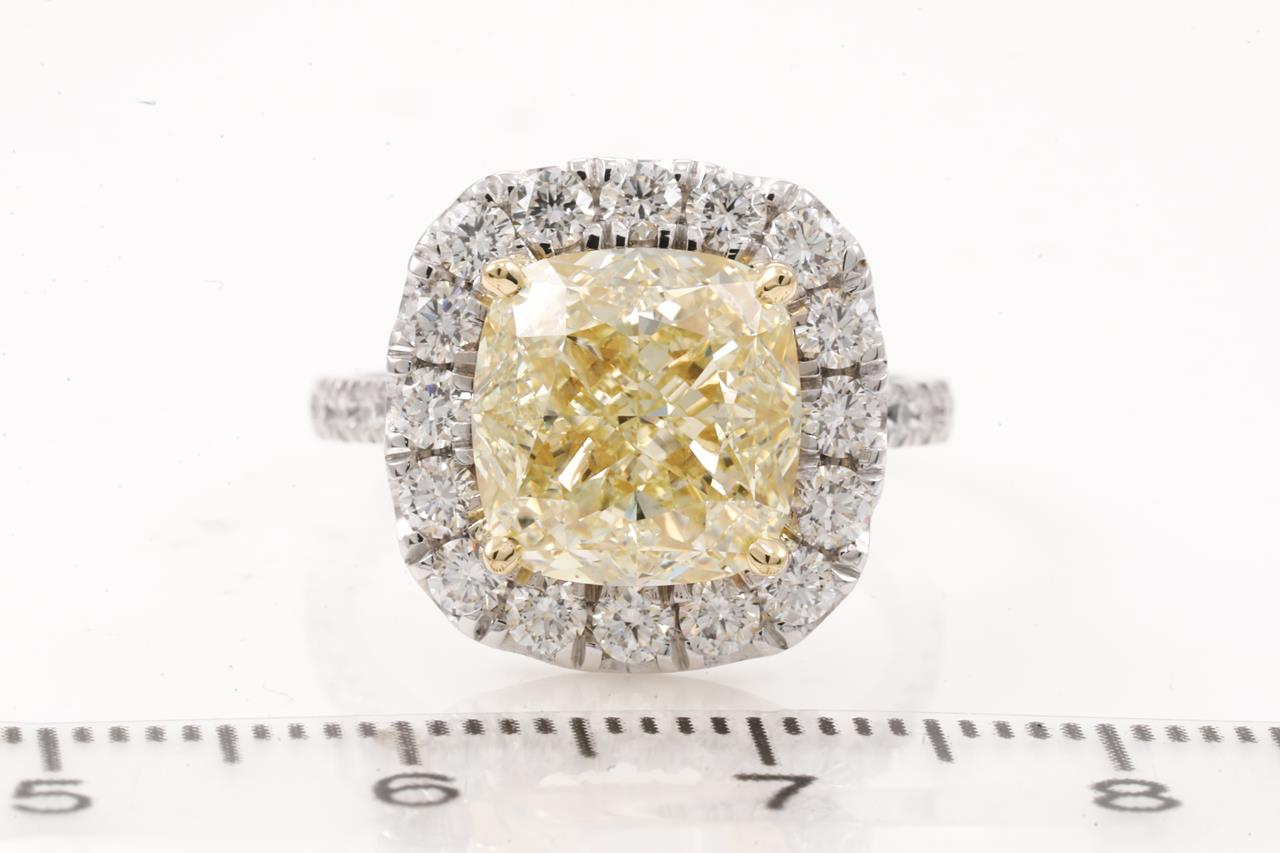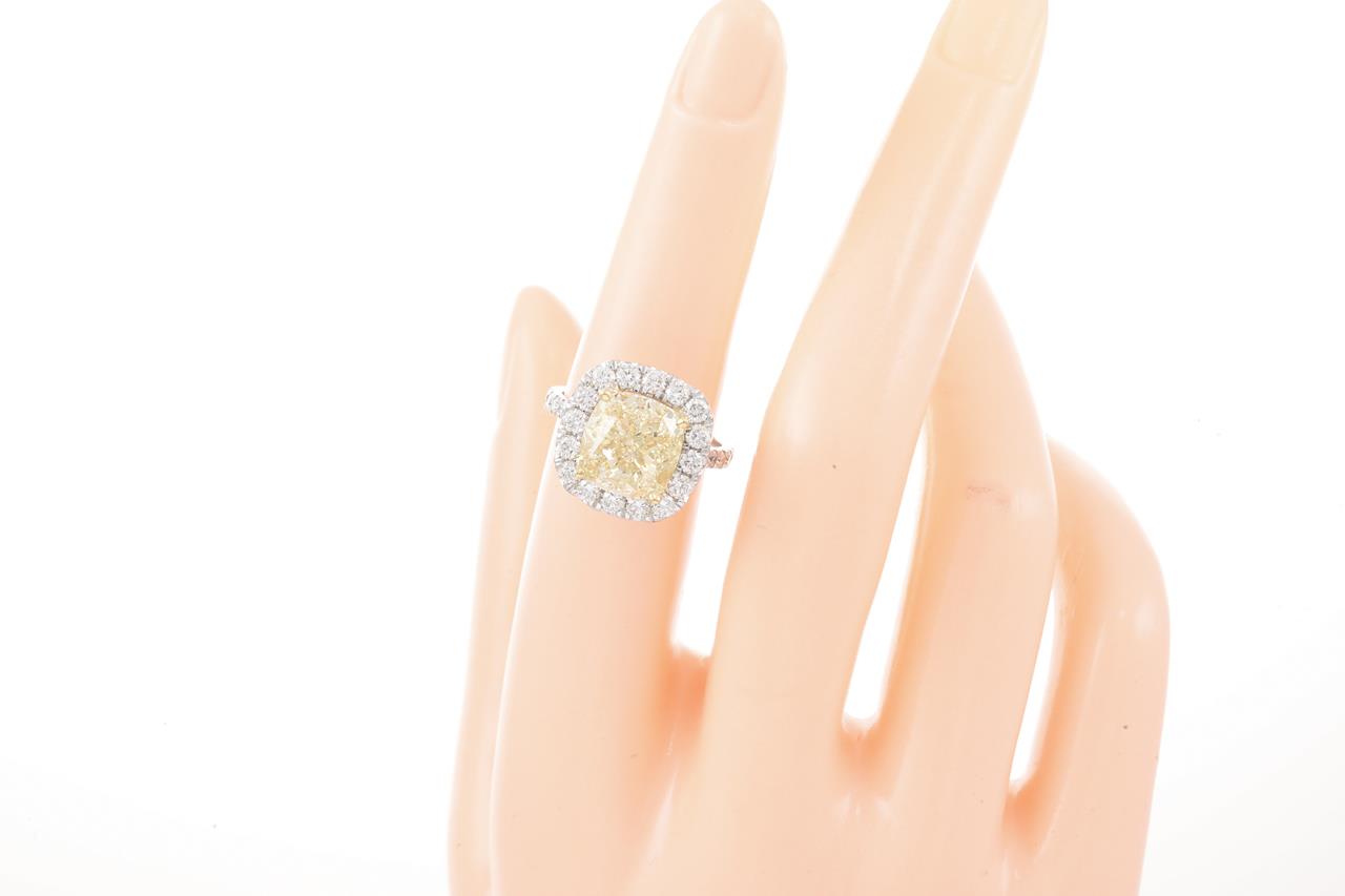 Diamond halo ring with centre cushion cut diamond of 5.53ct (with GIA report graded as Natural Fancy Light Brownish Yellow VVS2 #2211963092) and Diamonds totalling 1.10cts (Estimated grading: F-G SI). 18ct yellow and white gold. Ring size L. Weight: 6.4g (New)