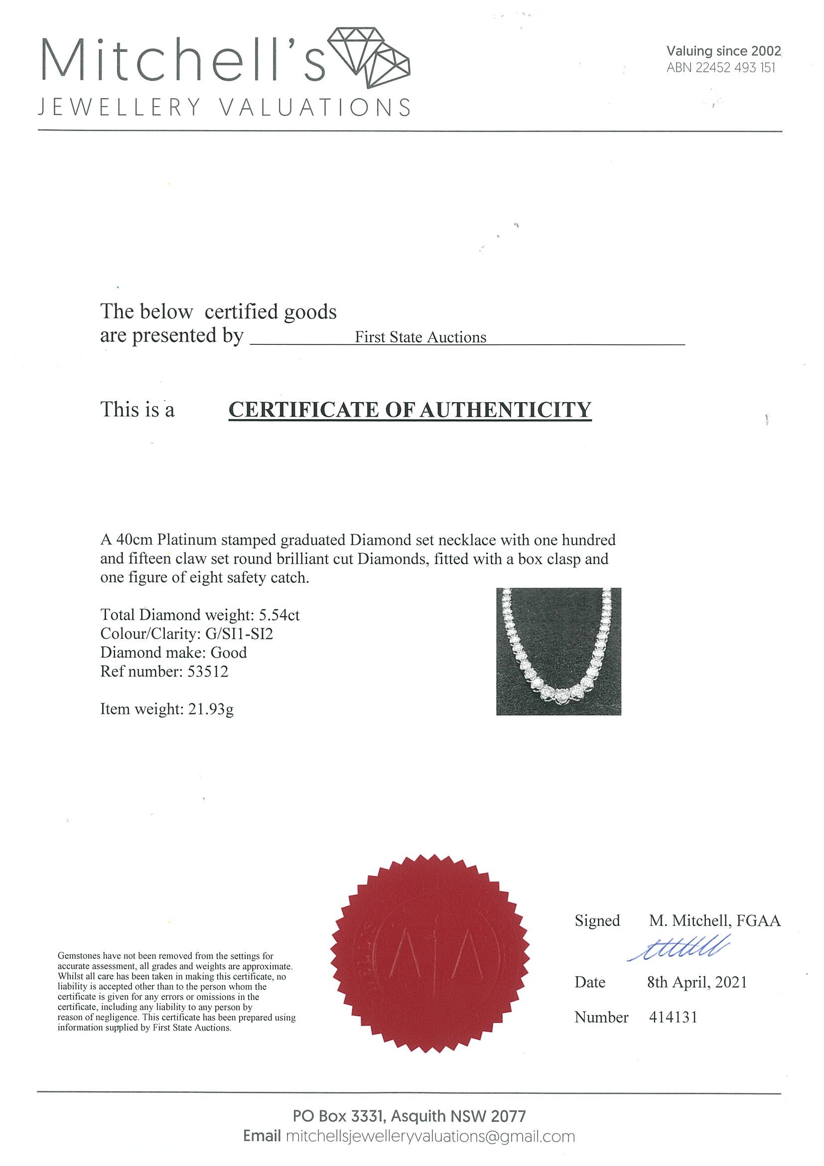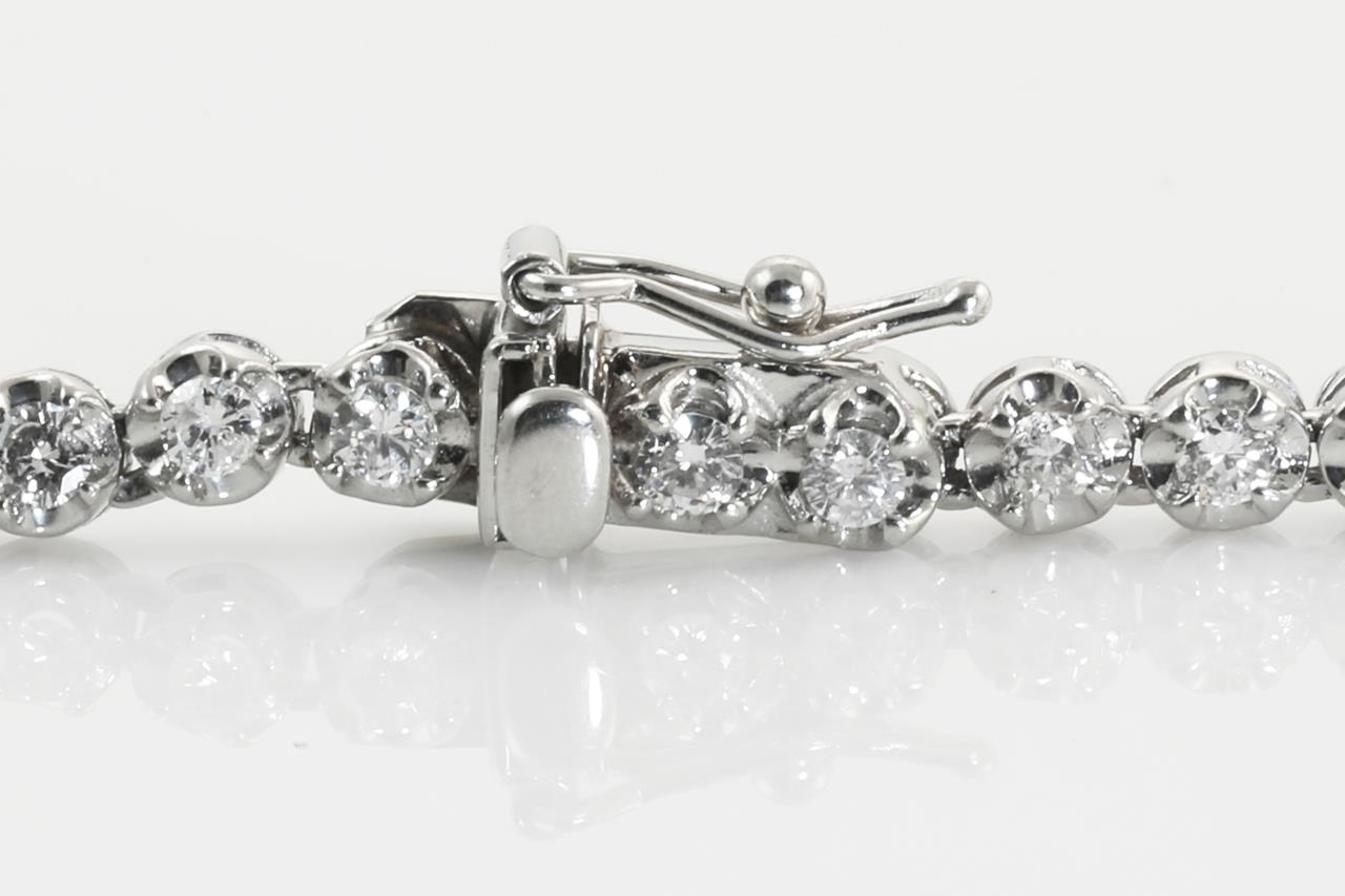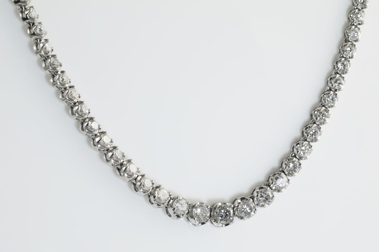 Diamond necklace with round Diamonds totalling 5.54cts (Estimated grading: G SI1-SI2). Platinum. Length: 40cm. Weight: 21.9g. With certificate #414131. (Pre-owned)