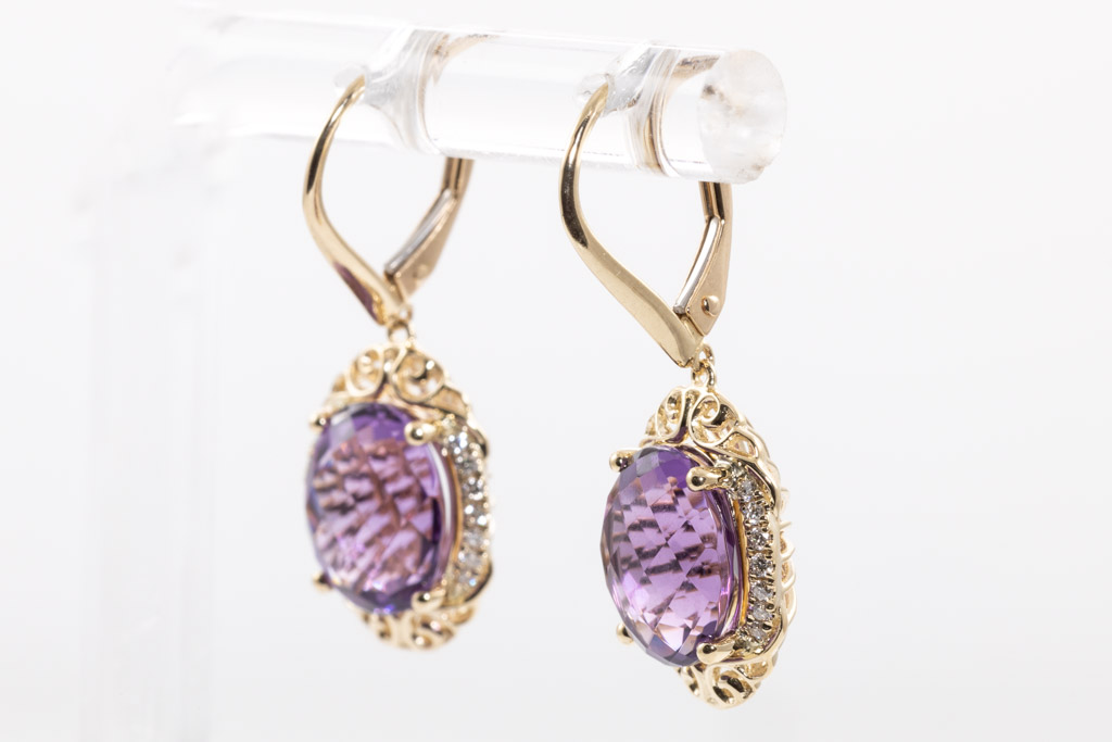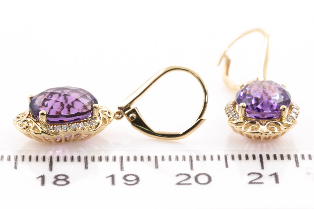 Amethyst and Diamond leverback earrings with oval shape checkerboard cut Amethysts totalling 5.55cts and round Diamonds totalling 0.15cts. 14ct yellow gold. Weight: 4.4g. (New)