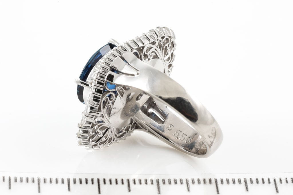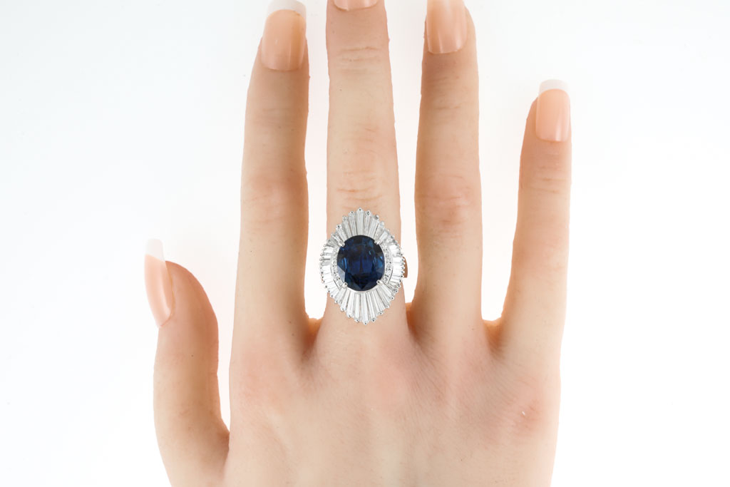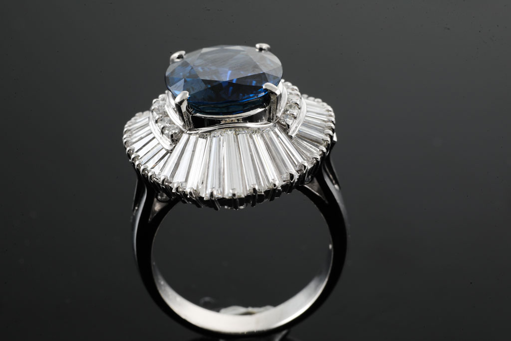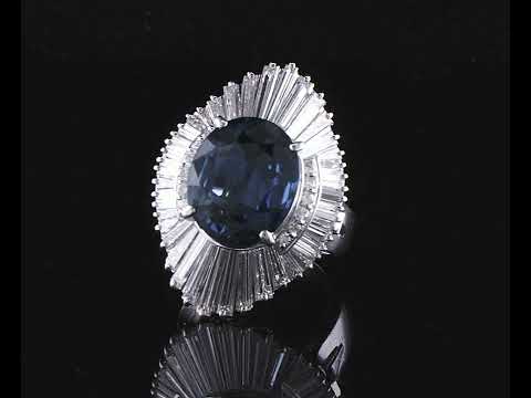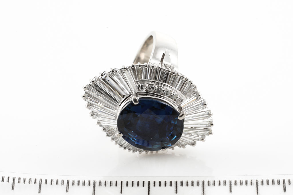 Sapphire and Diamond ring with oval shape blue Sapphire of 5.56ct and baguette cut and round Diamonds totalling 2.38cts (Estimated grading: G VS). Platinum - 900. Ring size J1/2. Weigh: 16.7g. With Certificate #417068. (Pre-owned)