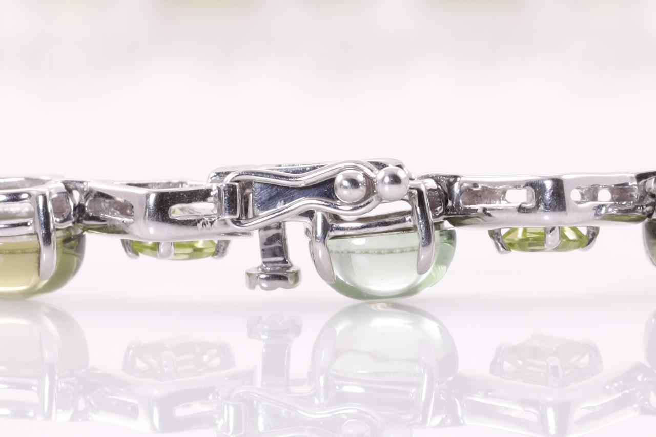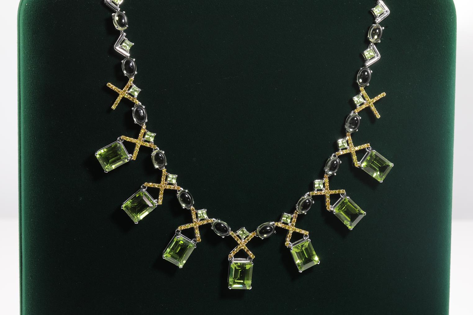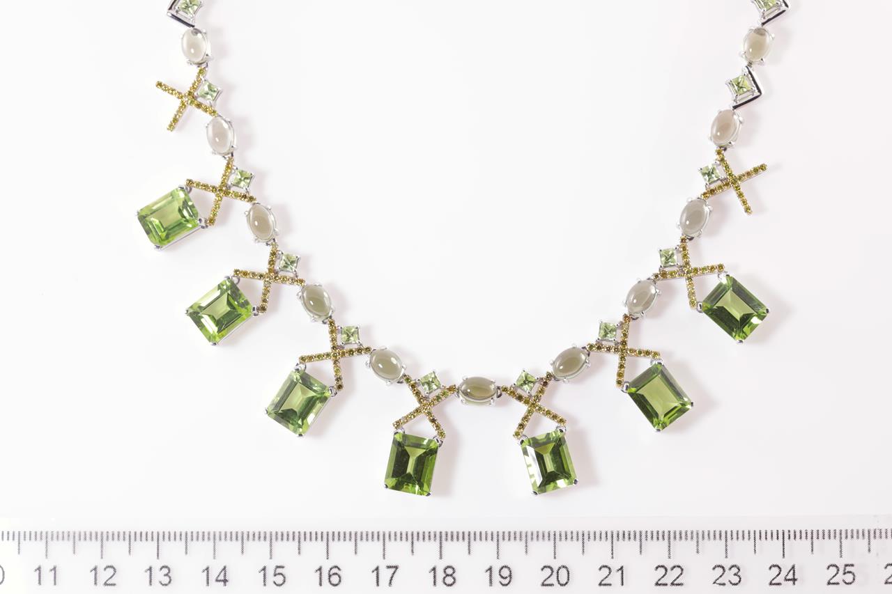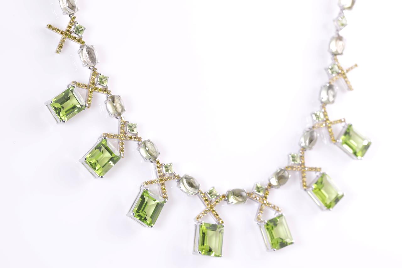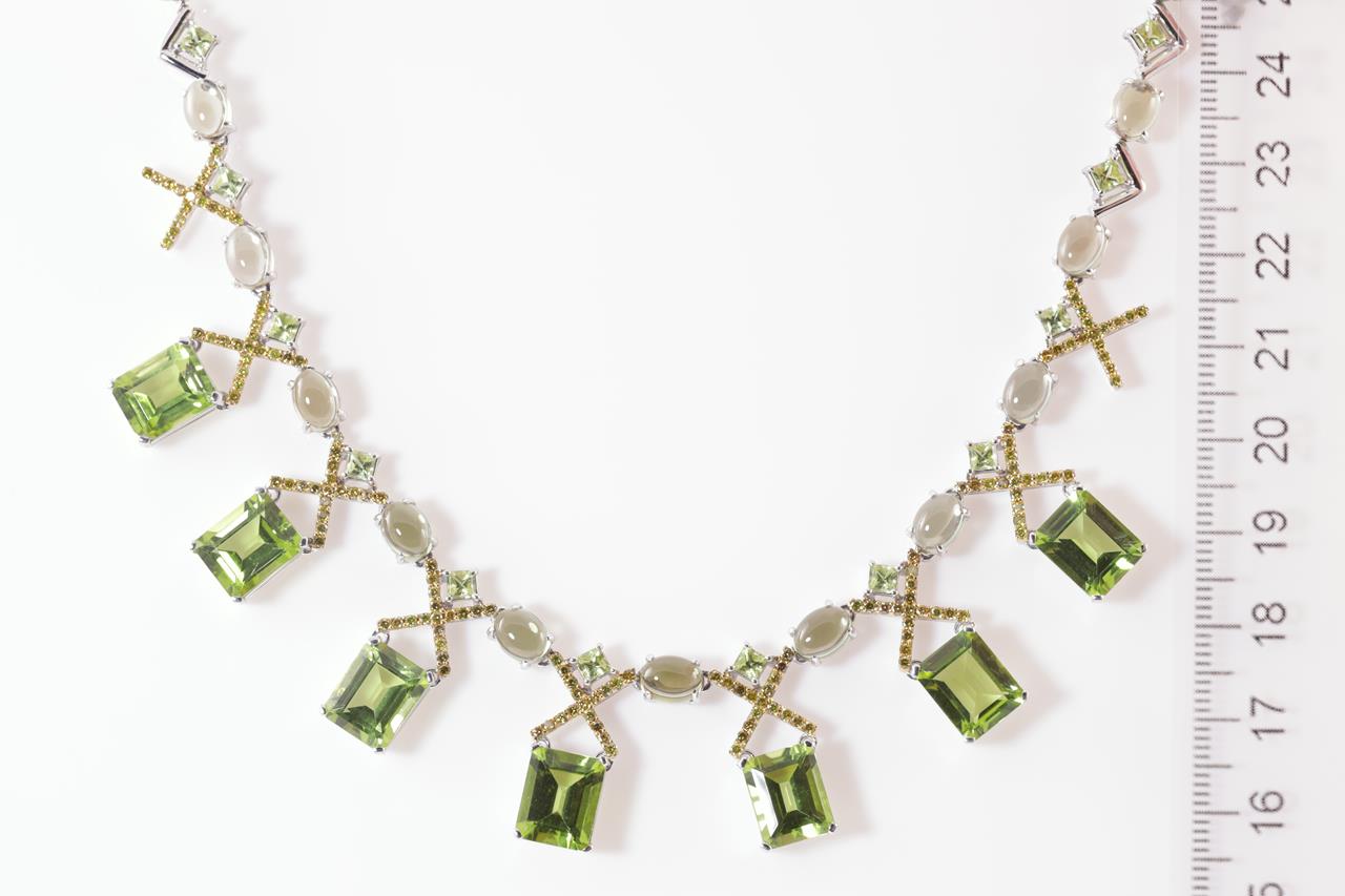 Peridot and Diamond Necklace with emerald, cabochon & princess cut Peridot totalling 55.73cts and yellow Diamonds totalling 1.60cts (Estimated grading: Fancy Yellow SI). 18ct white gold. Length: 42cm. Weight: 49.2g. With certificate #415088. (Pre-owned)