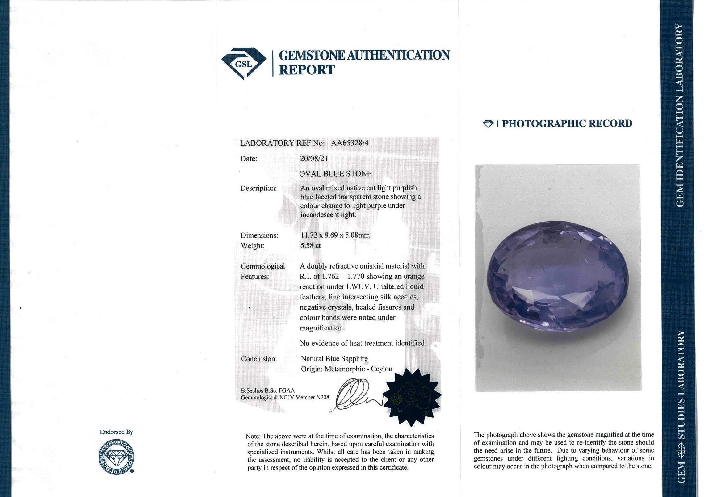 A loose blue oval shape Ceylon Sapphire of 5.58ct. Dimensions: 11.72 x 9.69 x 5.08mm. With GSL report AA65328/4. (As New)