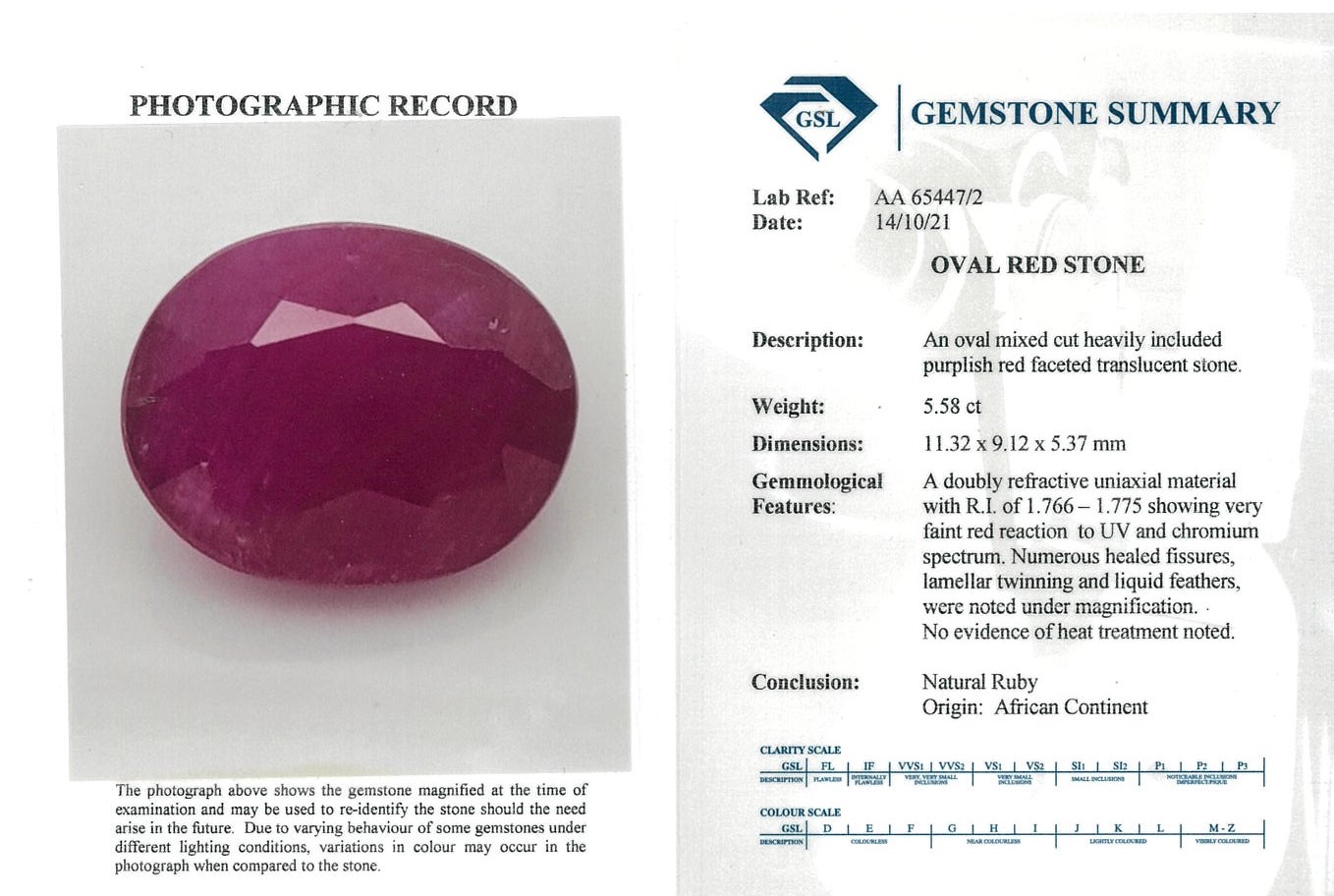 A loose oval shape unheated Ruby of 5.58ct. (With GSL Gemstone summary report #AA65447/2. Dimensions 11.32 x 9.12 x 5.37mm. (As New)