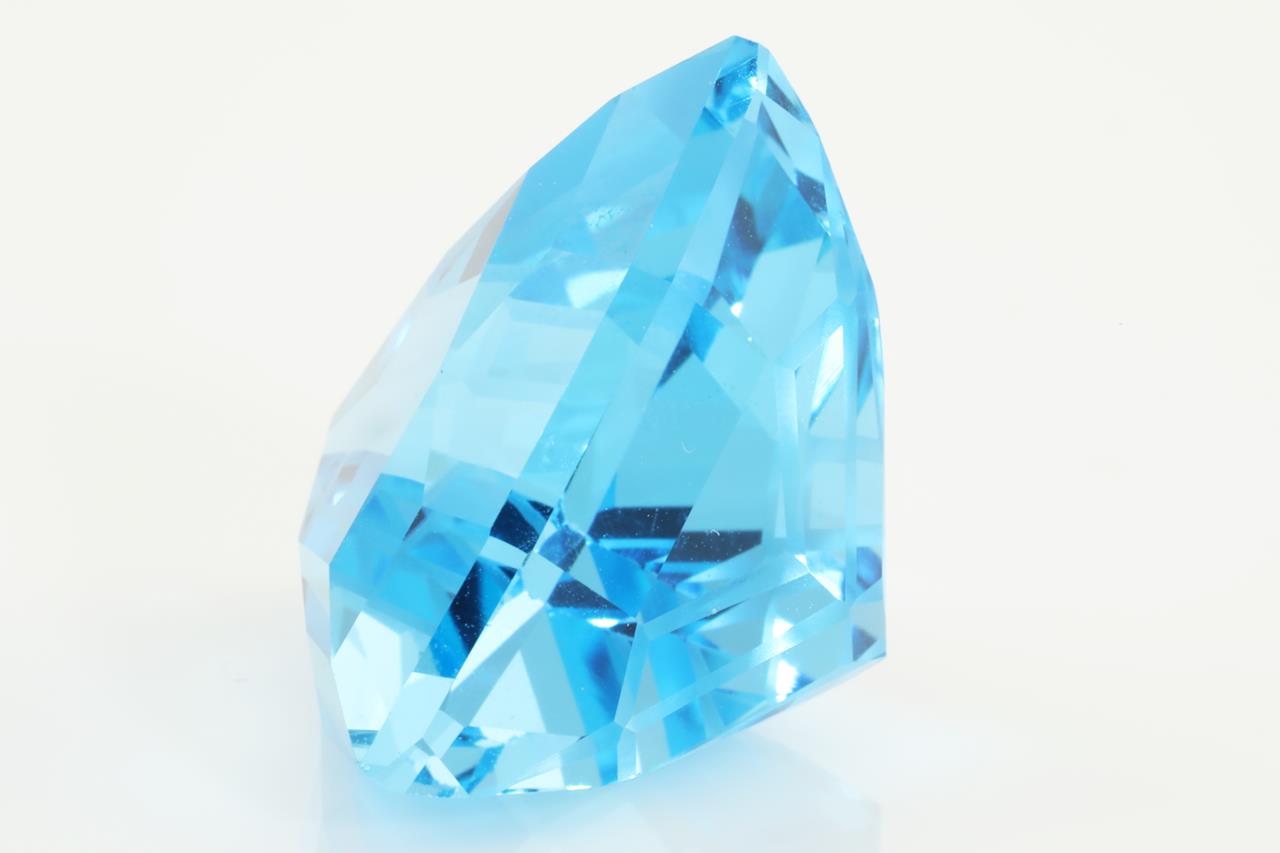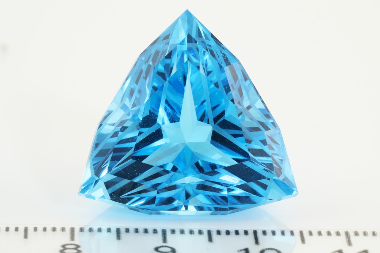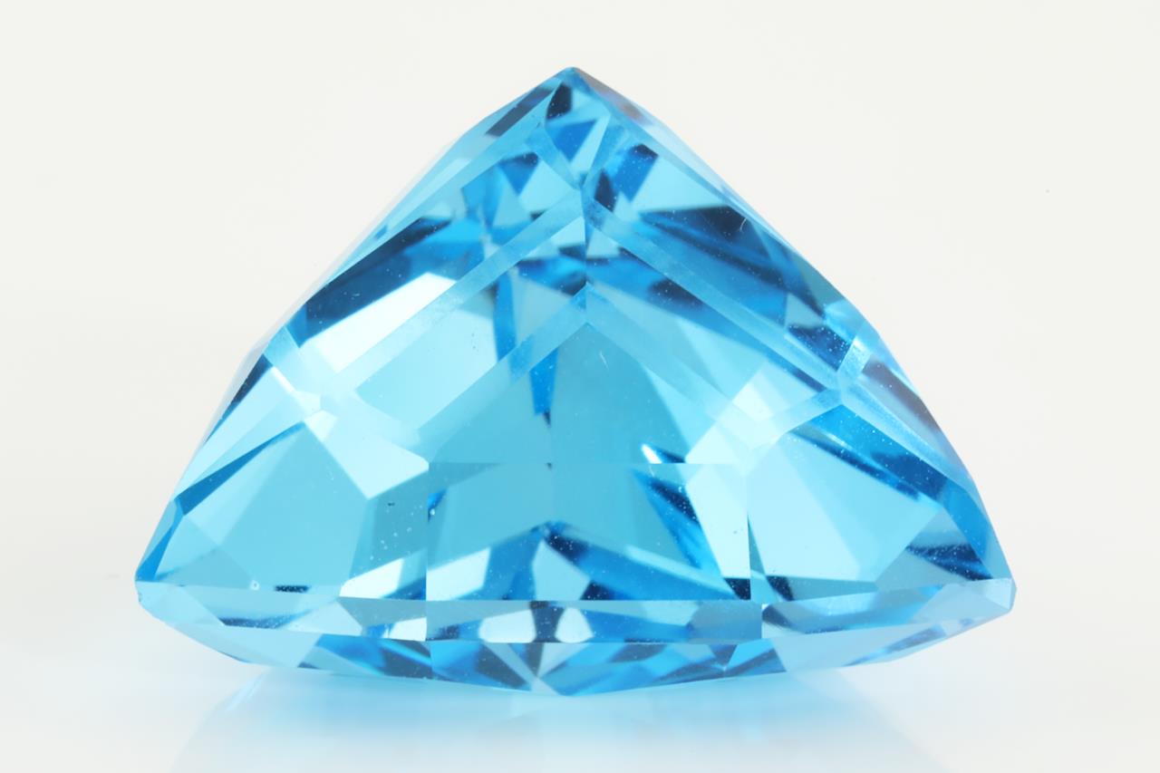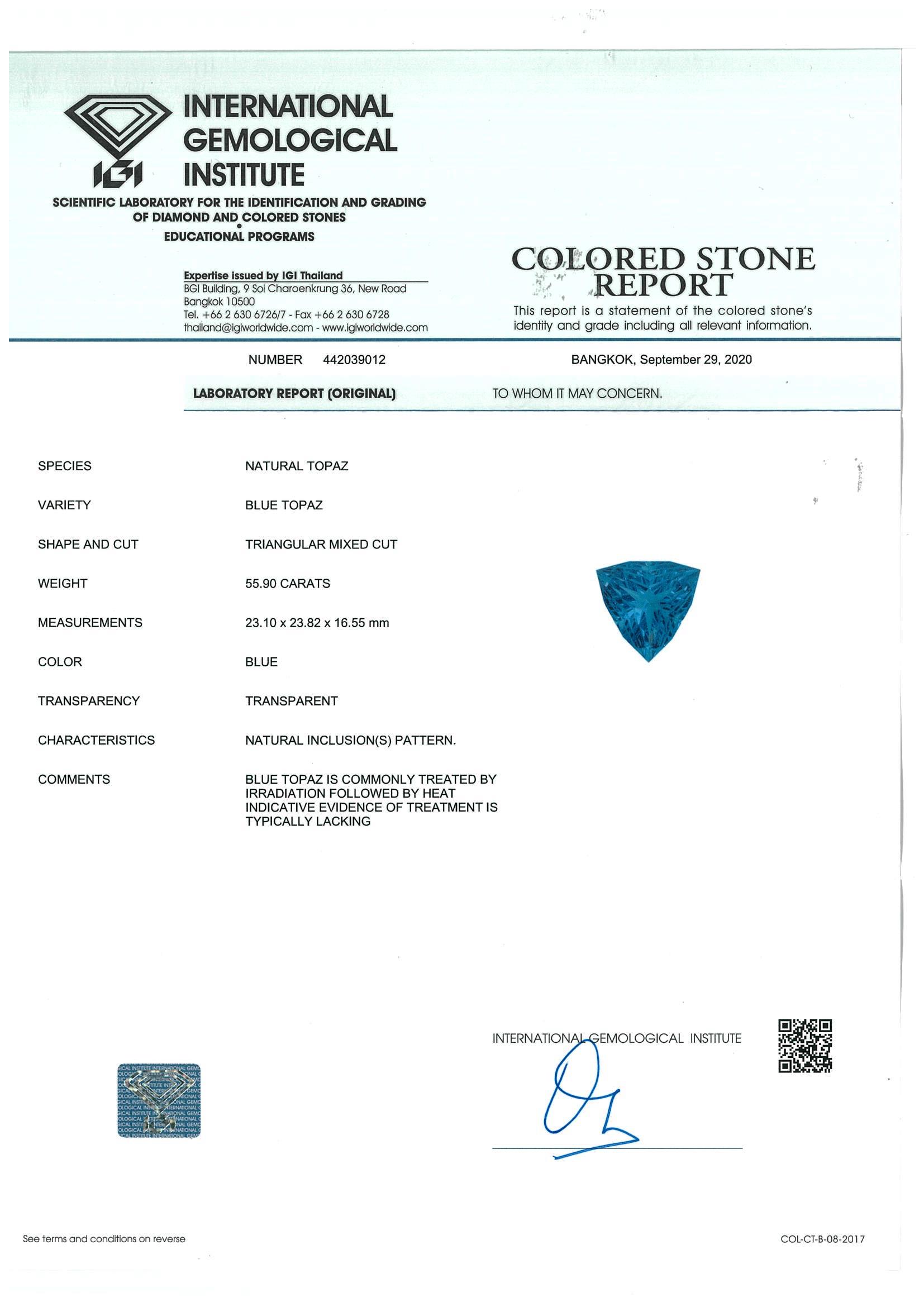 A loose triangular mixed cut Natural Blue Topaz of 55.90ct (with IGI report #442039012). Size:23.1 x 23.8 x 16.5mm. (New)