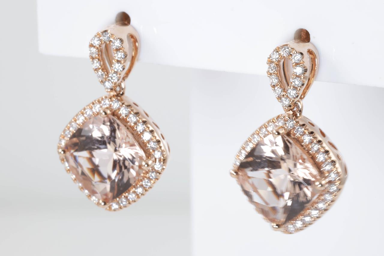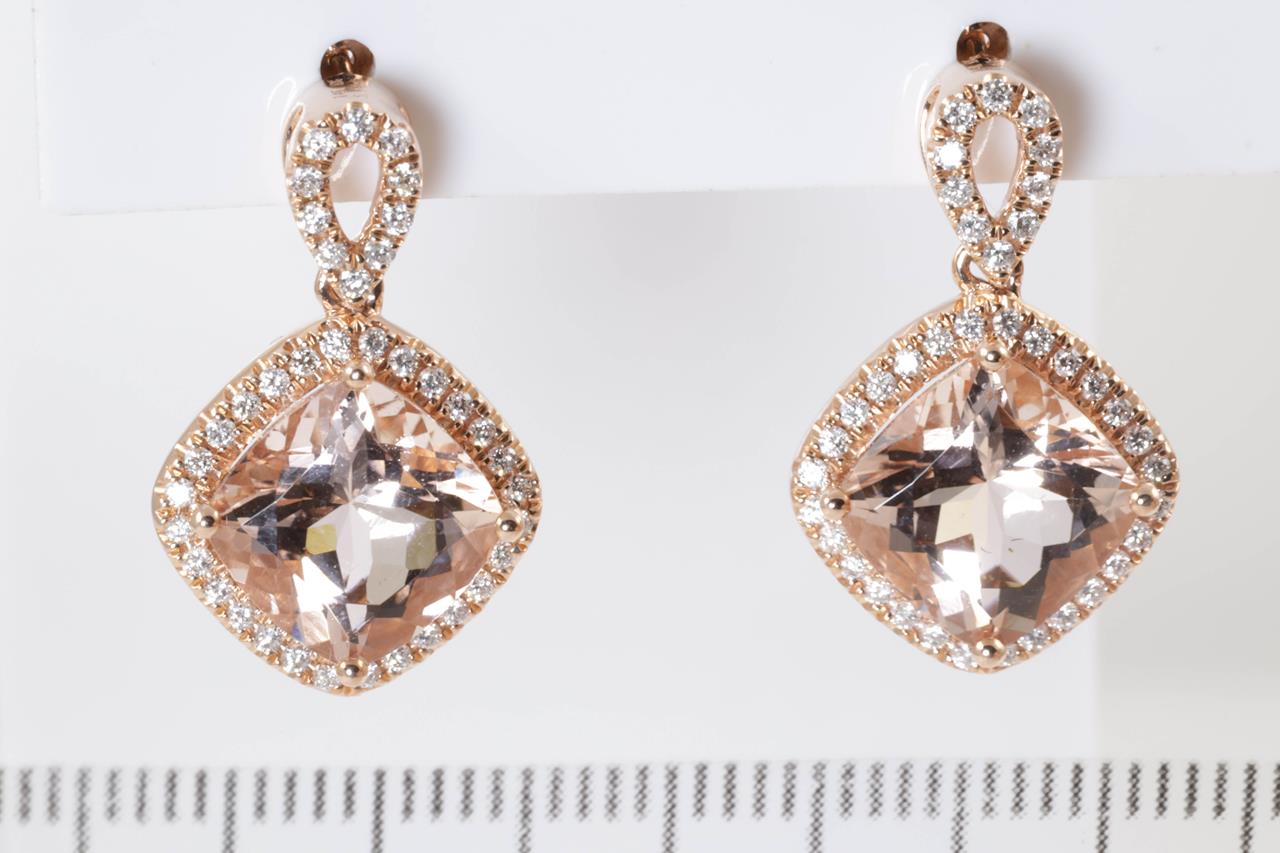 Morganite and Diamond earrings with cushion cut Morganites totalling 5.60cts and Diamonds totalling 0.42cts (Estimated grading: G SI). 14ct rose gold. Weight: 6.8g. (As new)