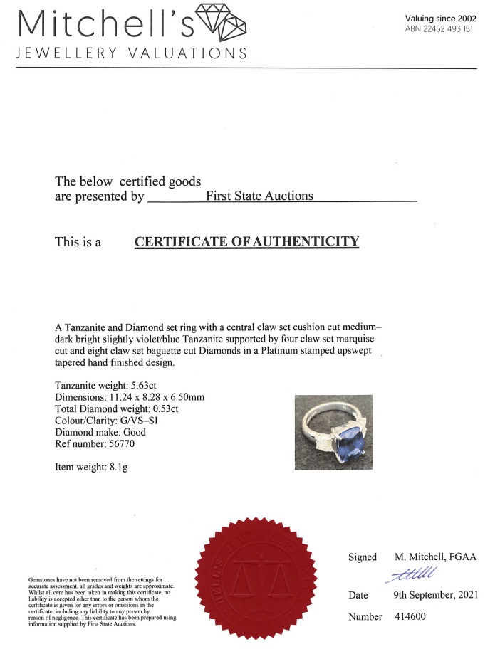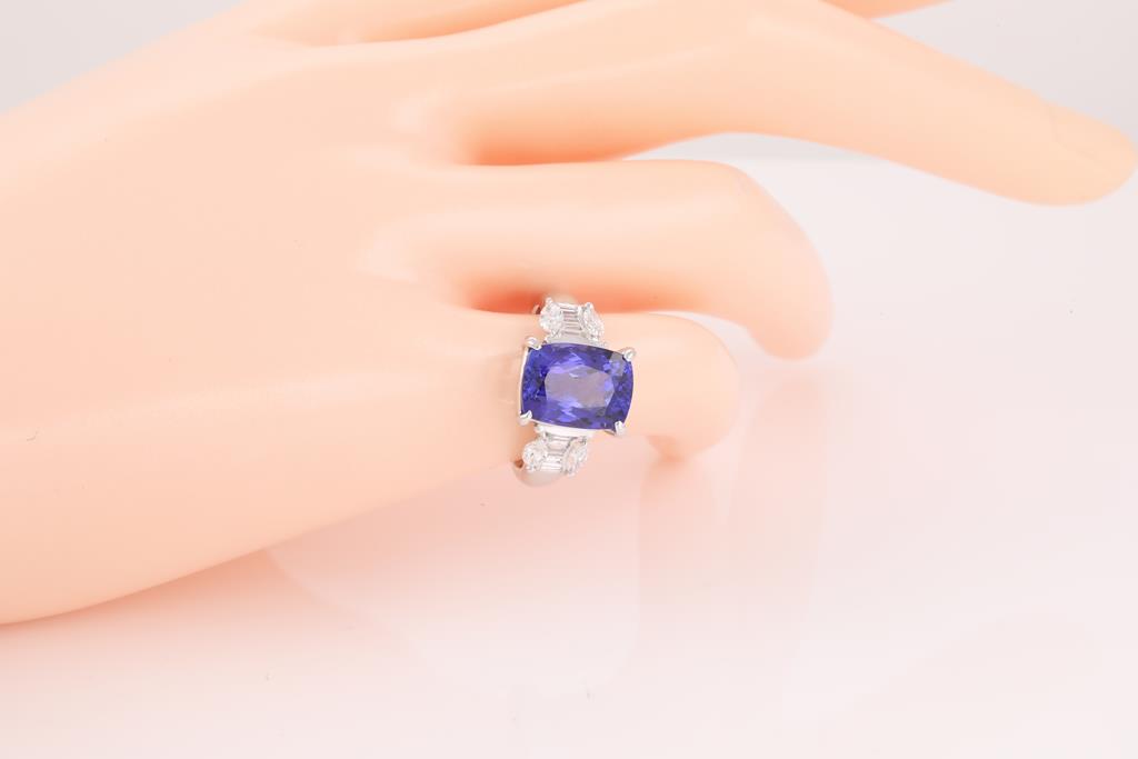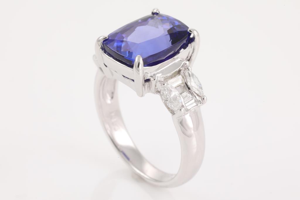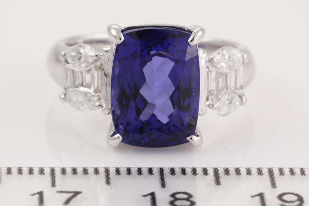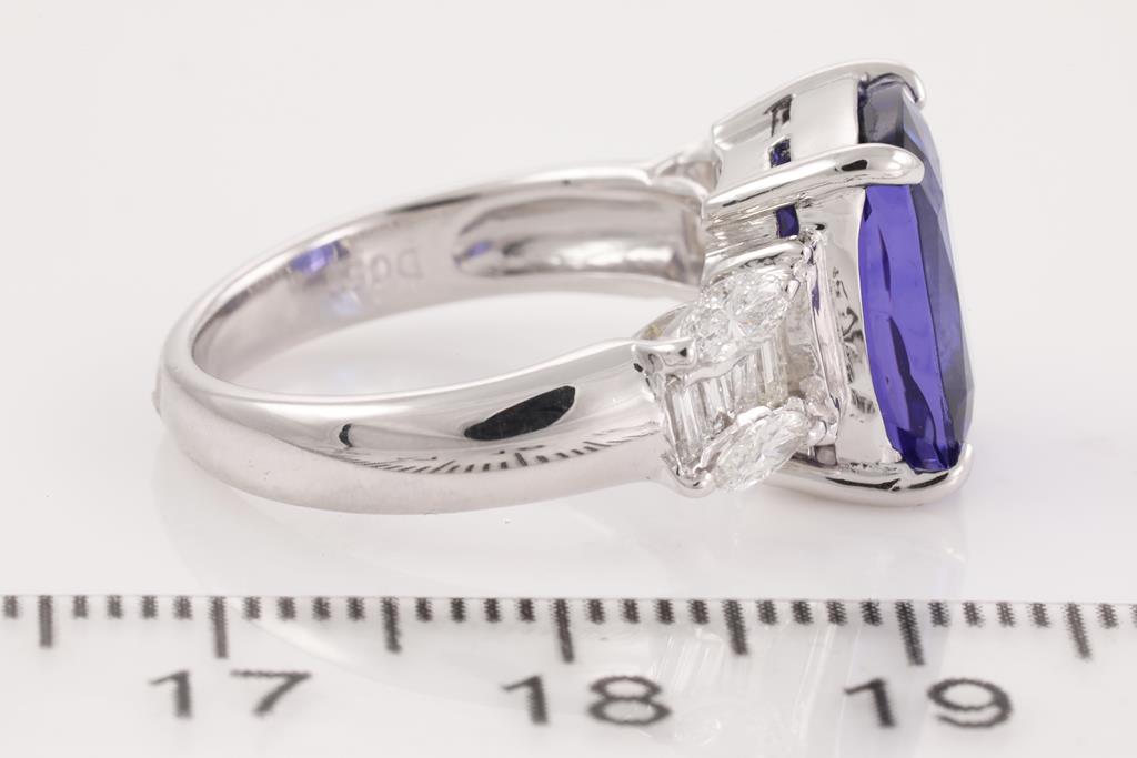 Tanzanite and Diamond ring with a rectangular cushion cut Tanzanite of 5.63ct and Diamonds totalling 0.53cts (Estimated grading: G VS-SI). Platinum. Ring size l - can be resized up by a maximum of 3 sizes, down by a ring clip only. Weight: 8.1g. With certificate #414600. (Pre-owned)