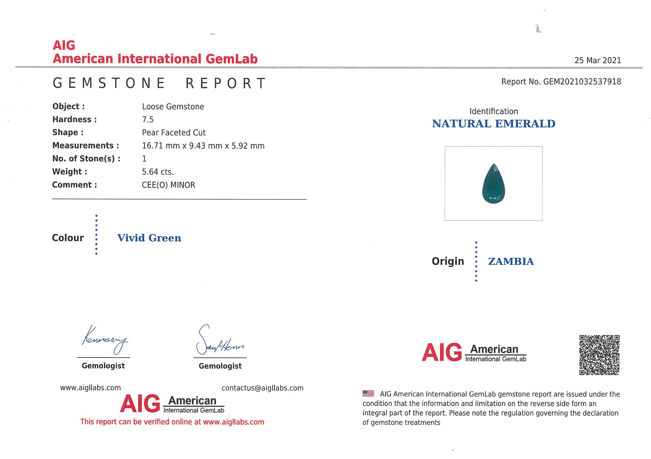 A loose pear shape 'Vivid green' Emerald of 5.64ct. With copy of AIG report #GEM2021032537918. Origin: Zambia. (As new)