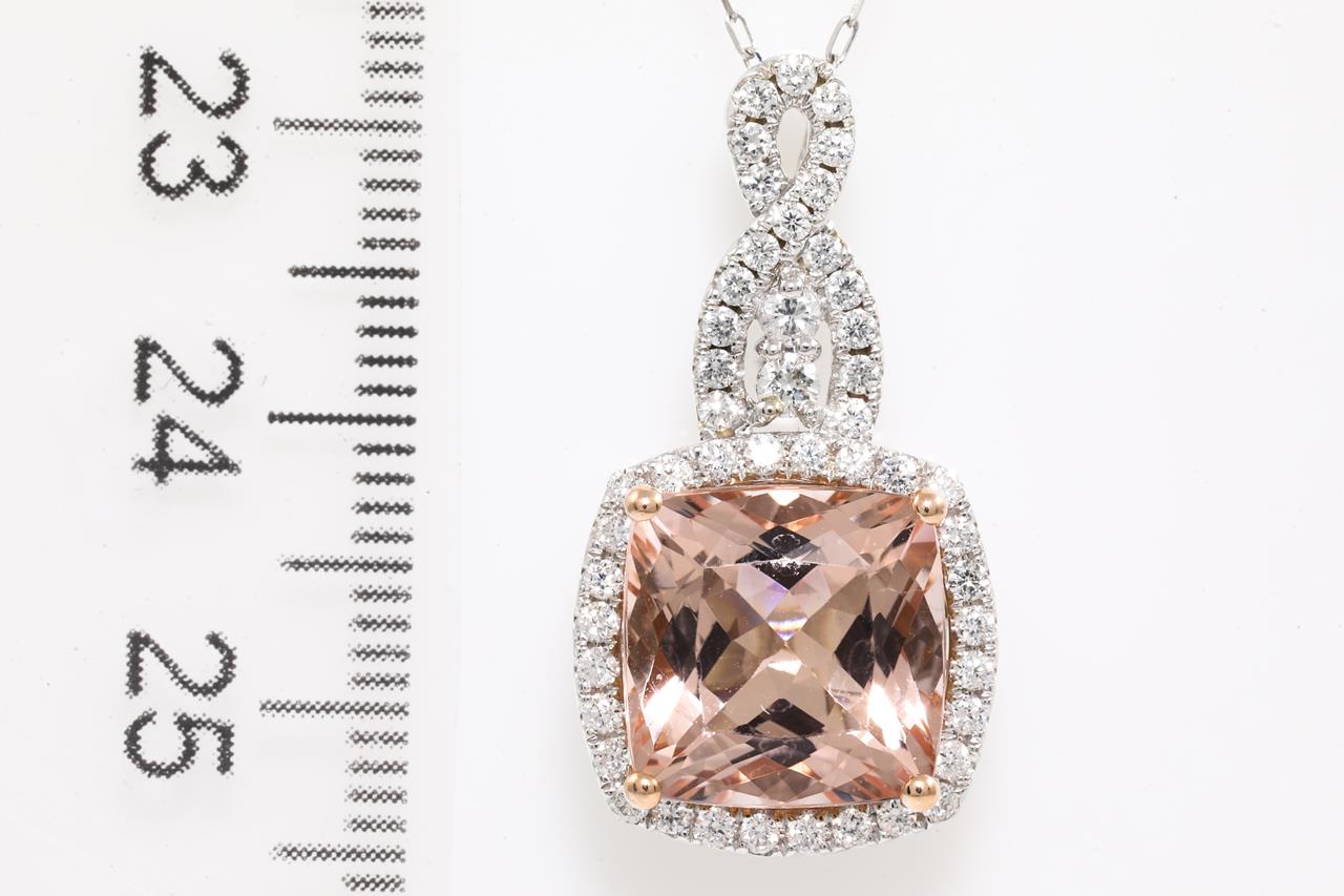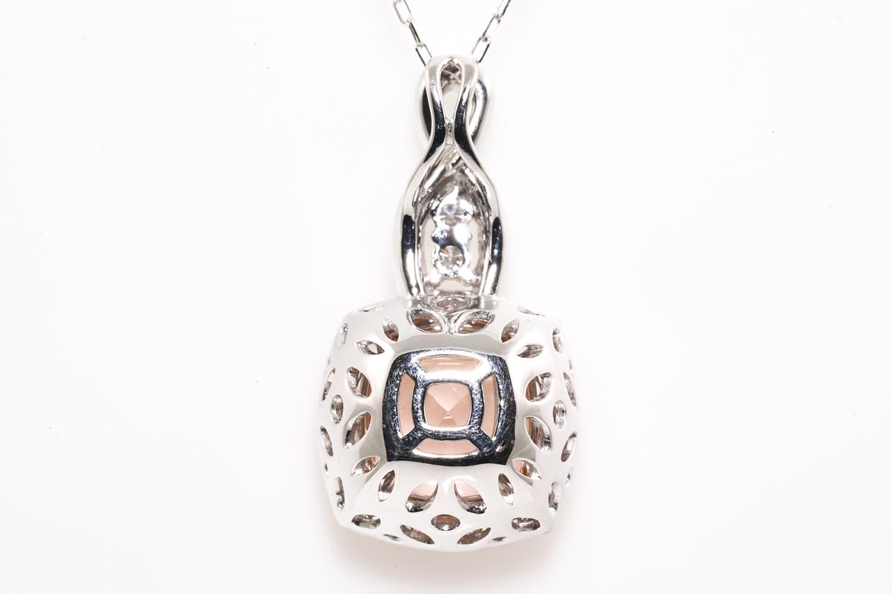 Morganite and Diamond Pendant with a cushion cit Morganite of 5.64ct and Diamonds totalling 0.56cts (Estimated grading: G SI). 14ct white gold with 45cm chain. Weight: 6.1g (Pre-owned)