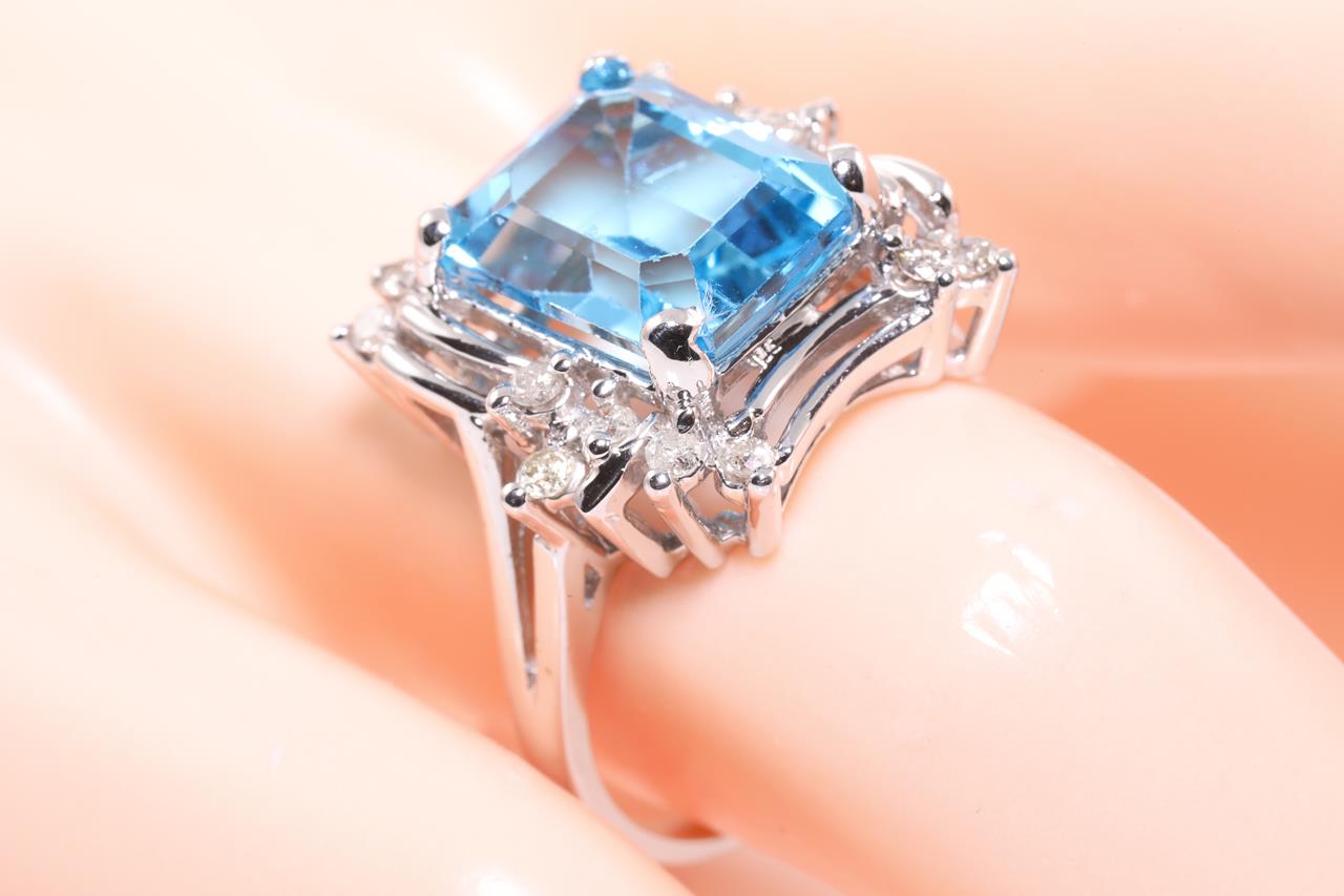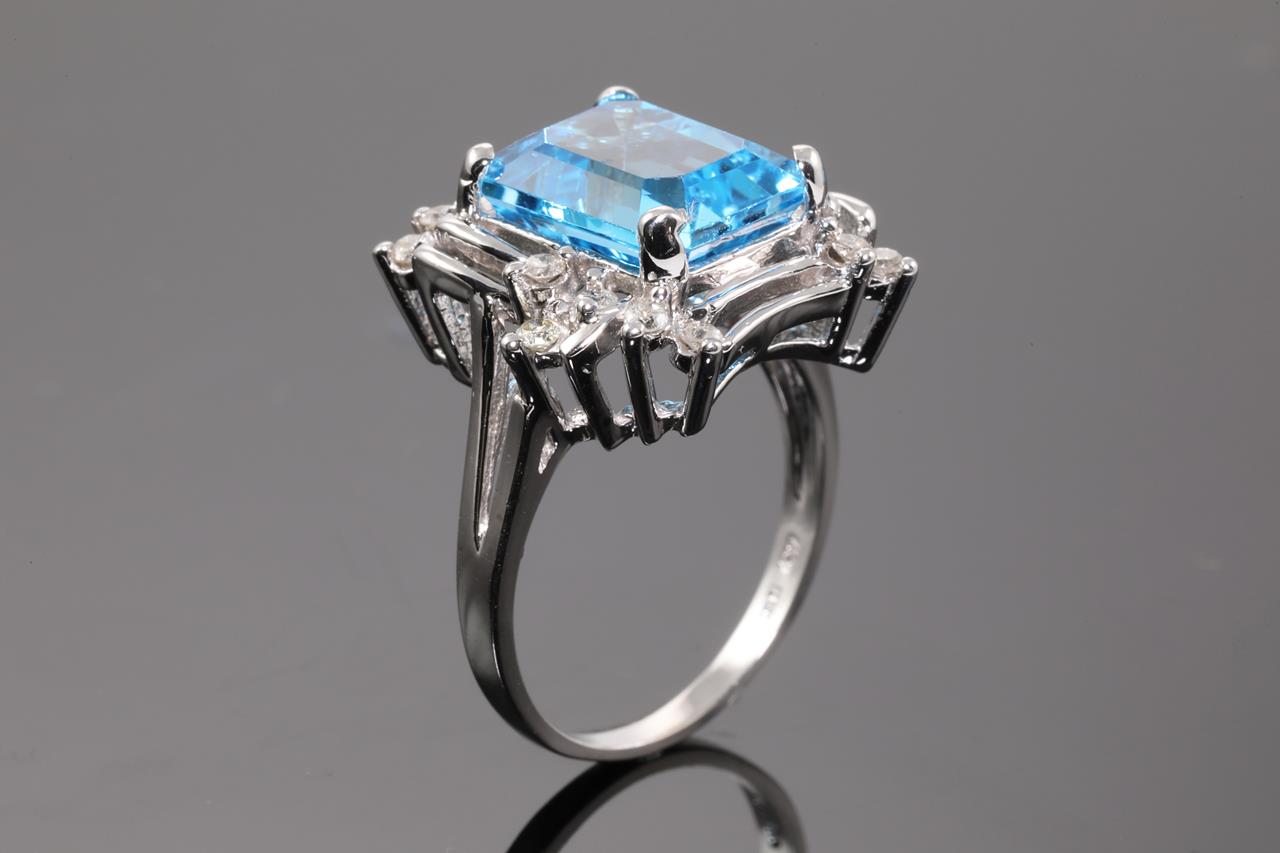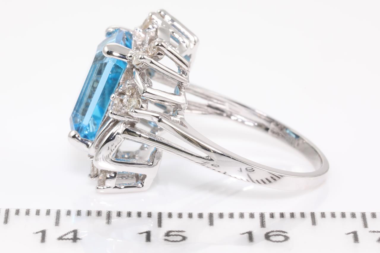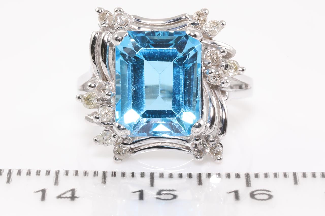 Topaz and Diamond Ring with a Emerald cut blue Topaz of approximately 5.65ct and round Diamonds totalling approximately 0.25cts. 10ct white gold. Ring size N. Weight 5.3g. (Pre-owned)