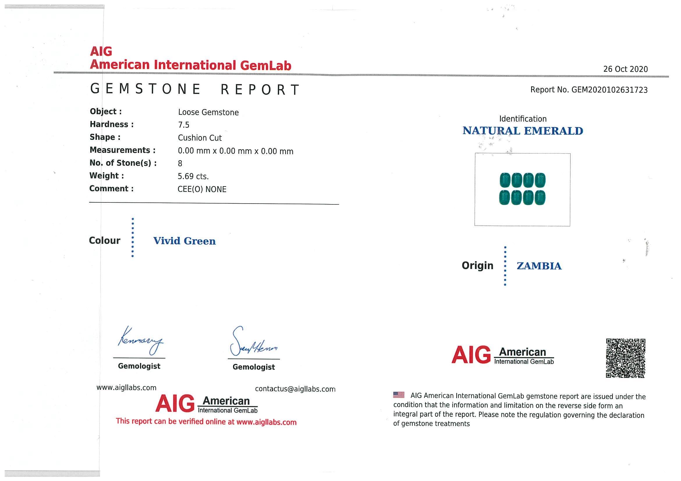 A loose parcel of cushion cut Emerald totalling 5.69cts (with AIG report #GEM2020102631723). (New)