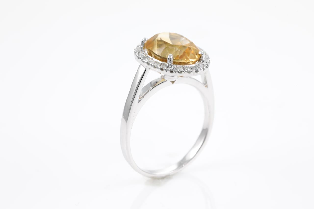 Citrine and Diamond ring with an oval Citrine of approximately 5.70ct and Diamonds totalling approximately 0.39cts (Estimated grading: H SI-P2). 9ct white gold. Ring size R - ring resizing is not recommended. Weight: 6.4g. (Pre-owned)