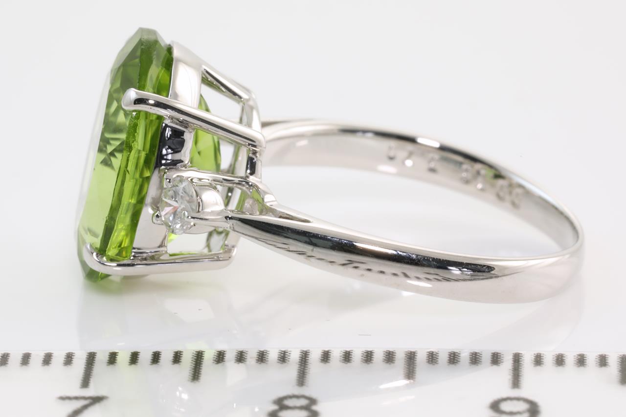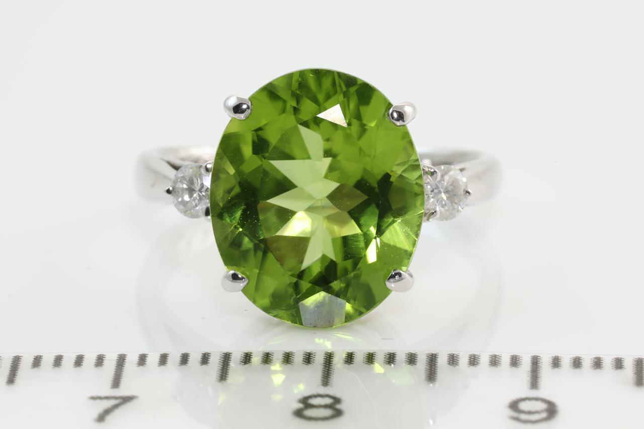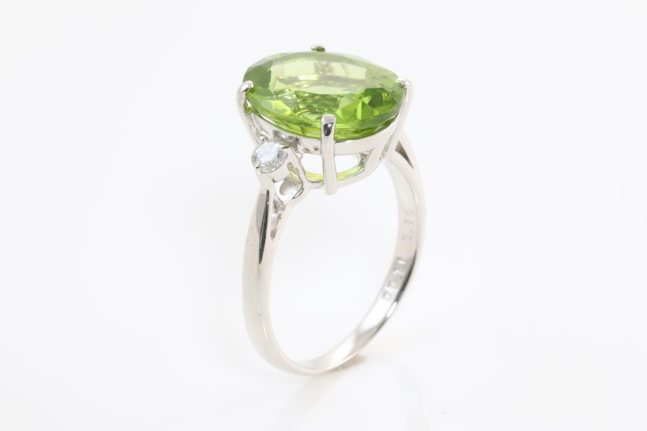 Peridot and Diamond ring with oval shape Peridot of 5.70ct and Diamonds totalling 0.16cts. 18ct white gold. Ring size: K1/2 - ring resizing up is not recommended, can only be resized down with ring clip. Weight: 4.3g (Pre-owned)