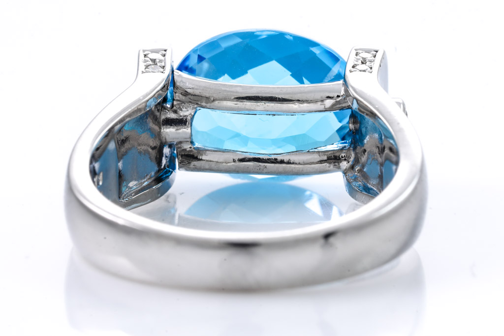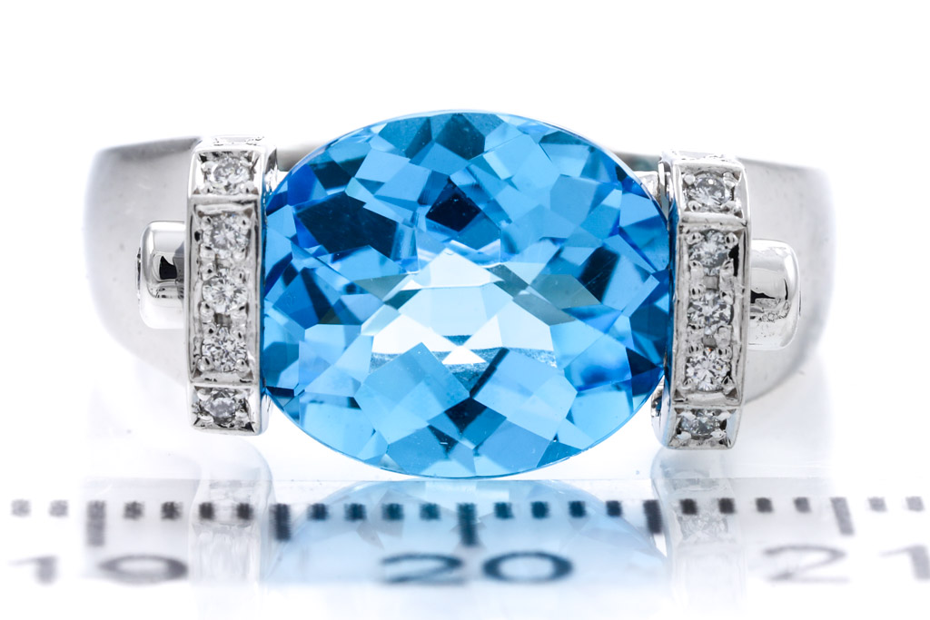 Topaz and Diamond ring with oval shape blue Topaz of 5.73ct and round Diamonds totalling 0.19cts. Platinum. Ring size N - ring resizing is not recommended. Weight: 12g. (Pre-owned)