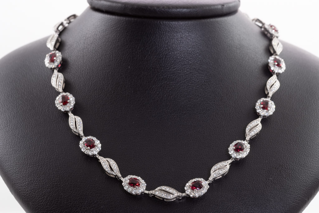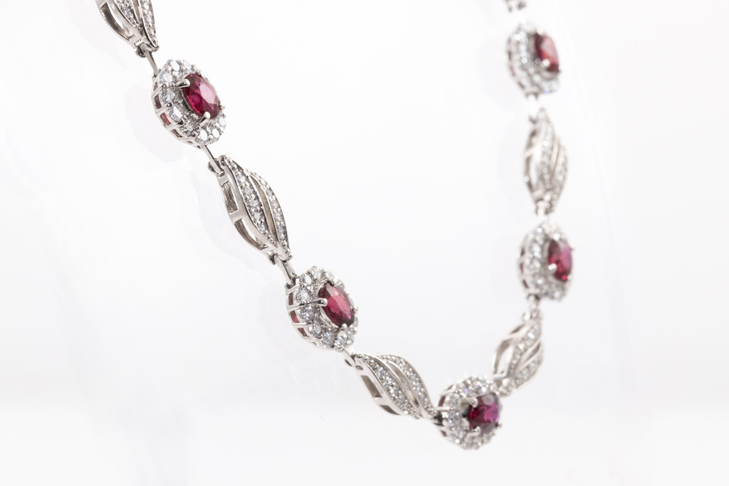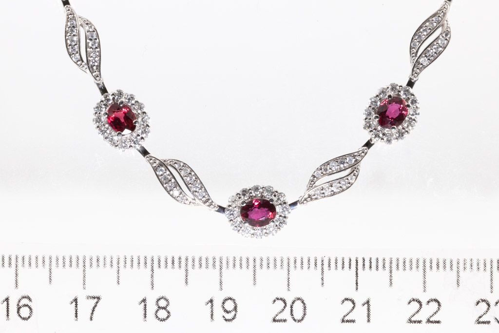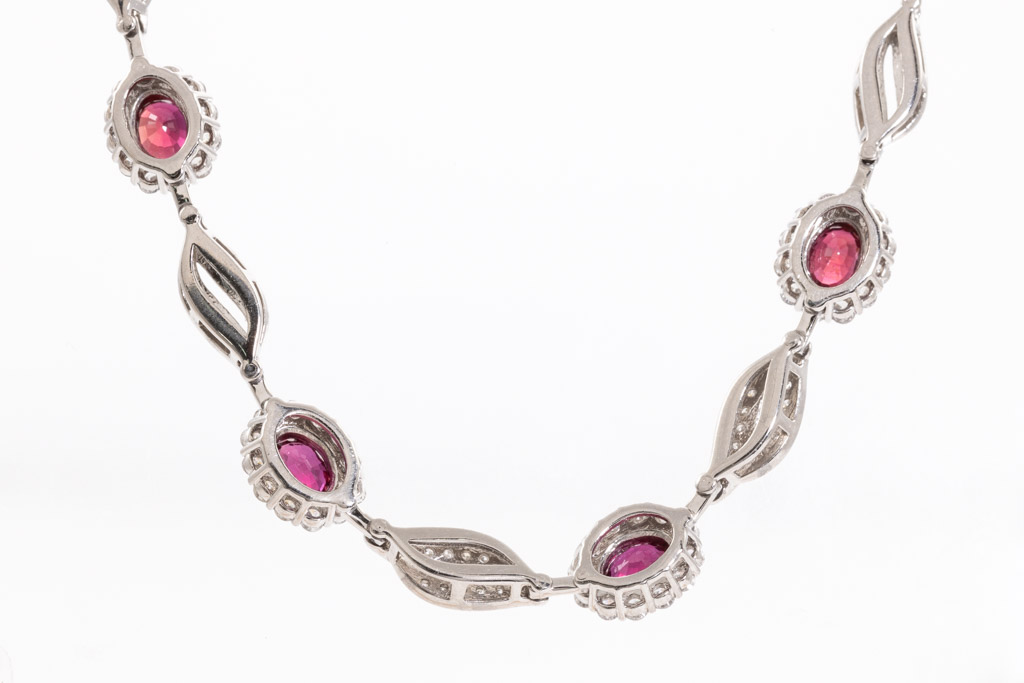 Ruby and Diamond necklace with 11 Mozambique oval shape unheated Rubies totalling 5.75cts (With 11 GIA Ruby Origin Reports) and round Diamonds totalling 4.04cts (Estimated grading: G-H SI). Platinum. Length: 44cm. Weight: 37.3g. (Pre-owned)