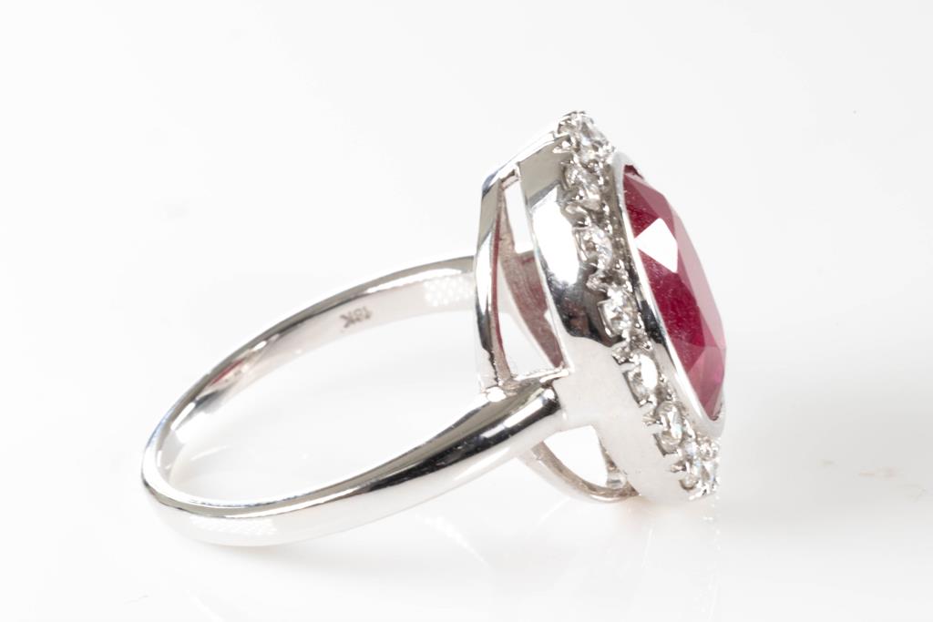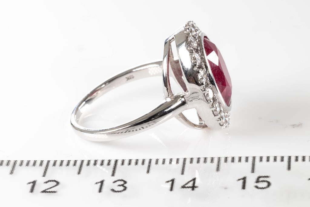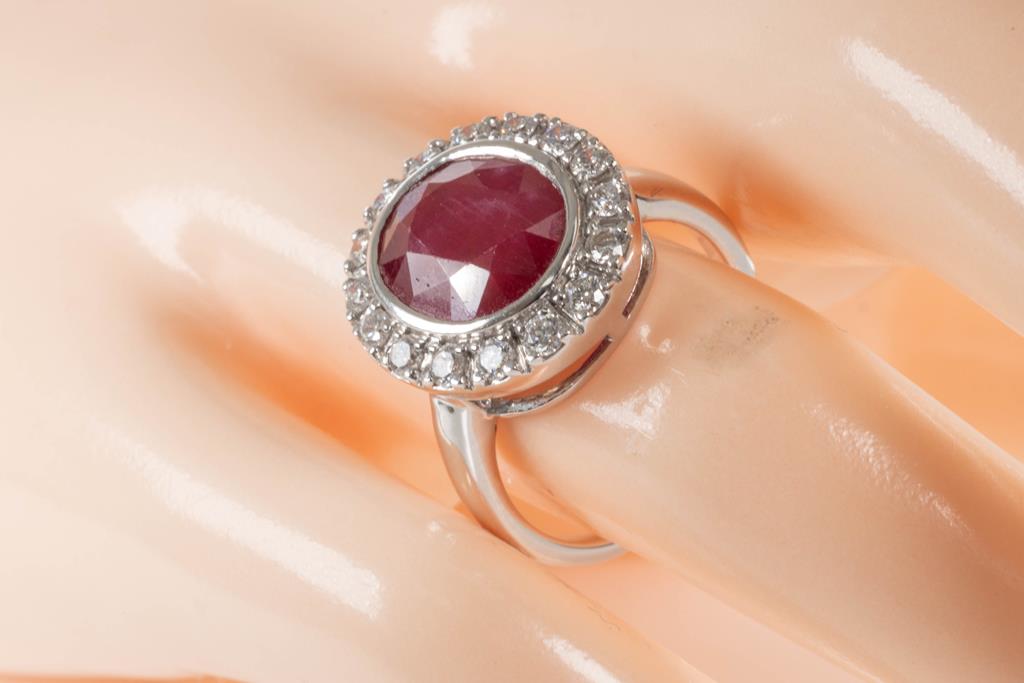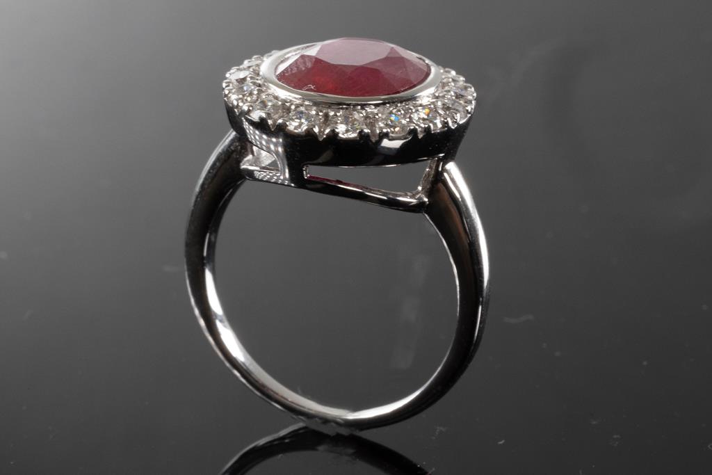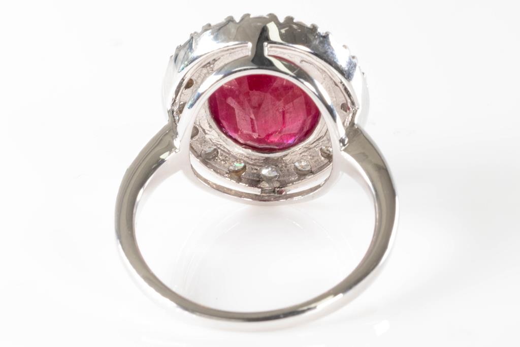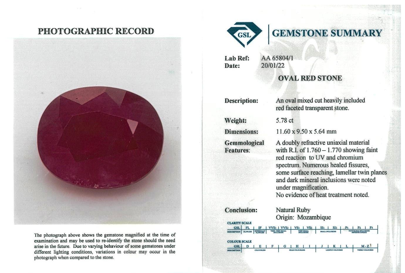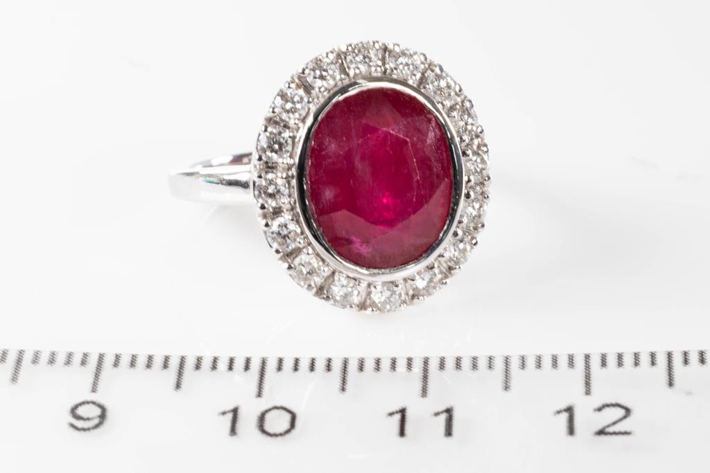 Ruby and Diamond ring with oval unheated Mozambique Ruby of 5.78ct (with GSL report #AA65804/1), and round Diamonds totalling approximately 0.76cts (Estimated grading G-H SI). 18ct white gold. Ring size M. Weight 6.9g. (Pre-owned)