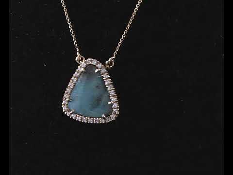 Opal pendant with freestyle solid boulder opal of approximately 5.85cts and round Diamonds totalling approximately 0.44cts (Estimated grading F VS). 9ct yellow gold with attached 9ct yellow gold chain. Length: 43cm. Weight 5.2g. With valuation. (Pre-owned)