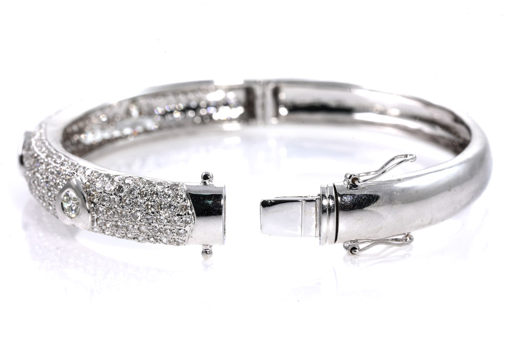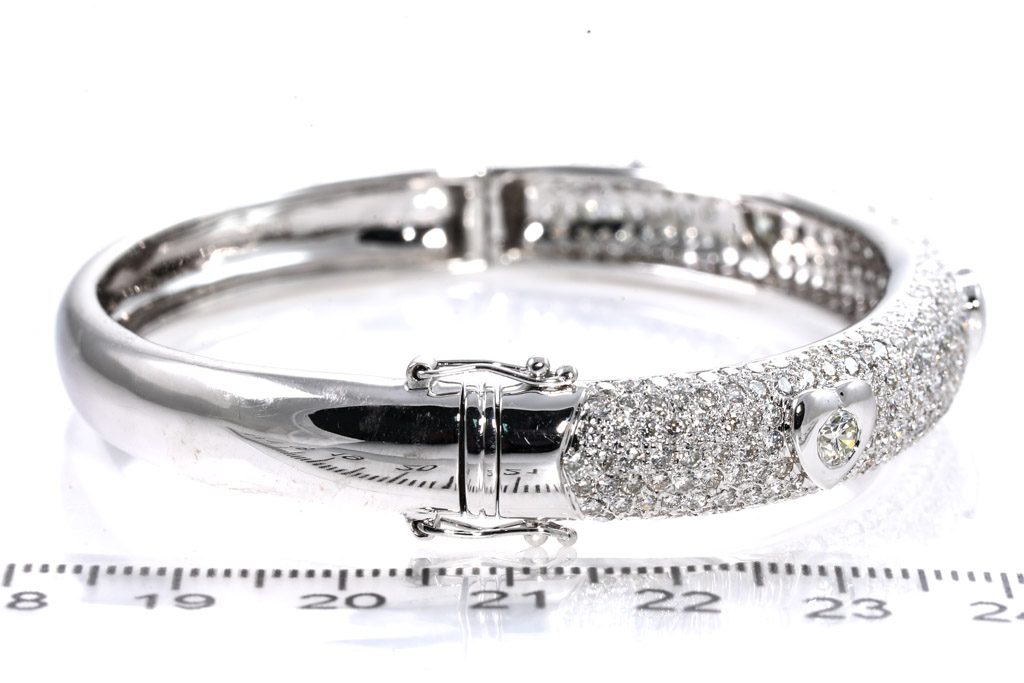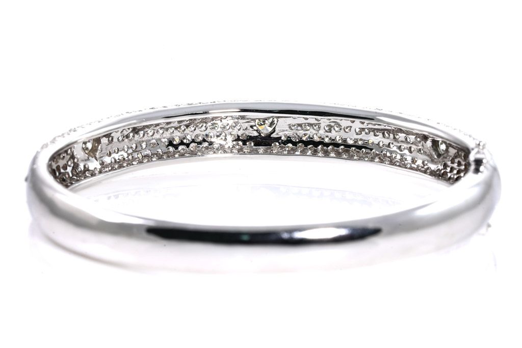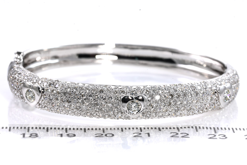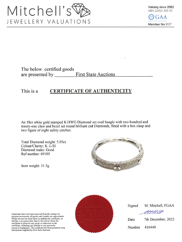 Diamond oval bangle with round Diamonds totalling 5.85cts (Estimated grading: K-L SI). 18ct white gold. Circumference: 17cm. Weight: 31.5g. With Certificate 416440. (Pre-owned)