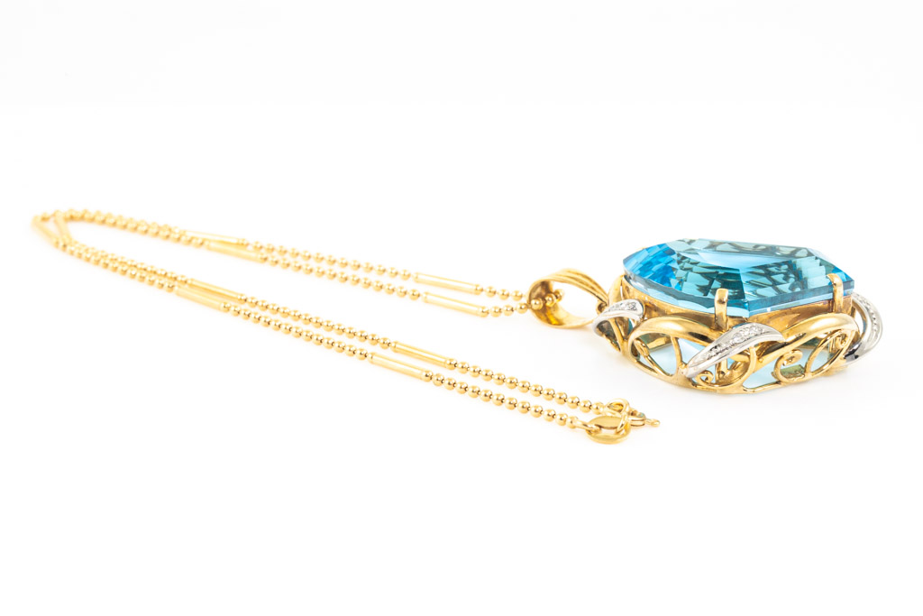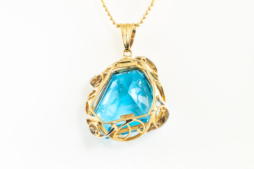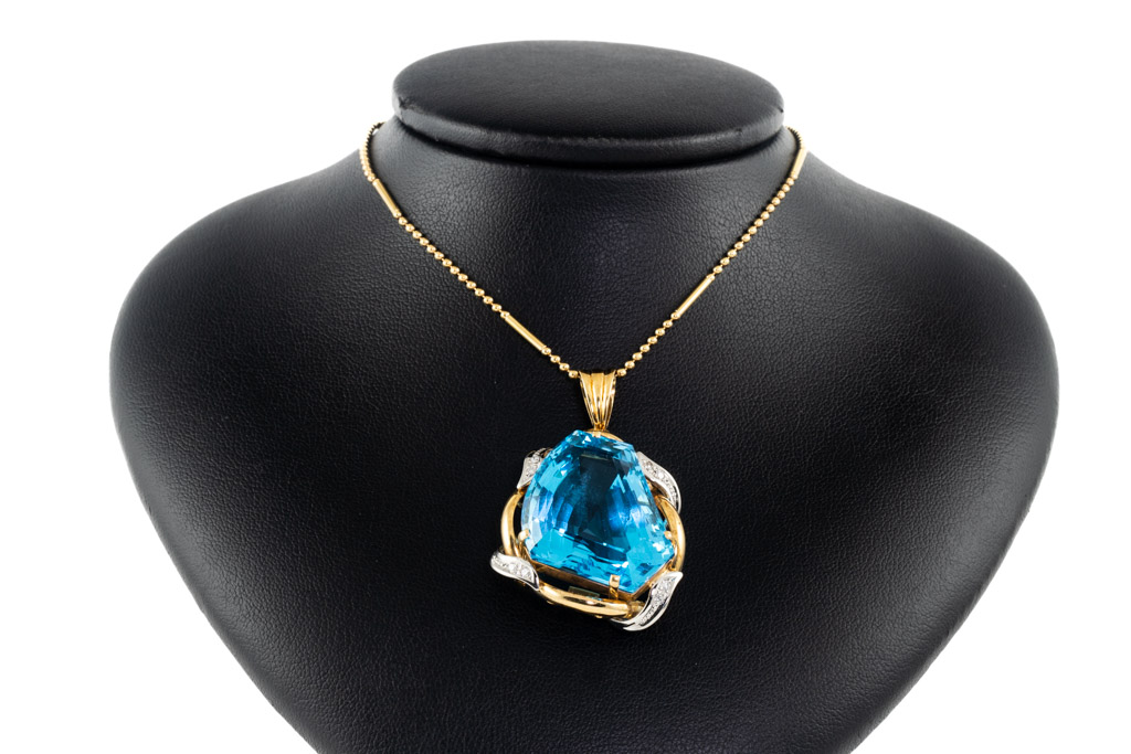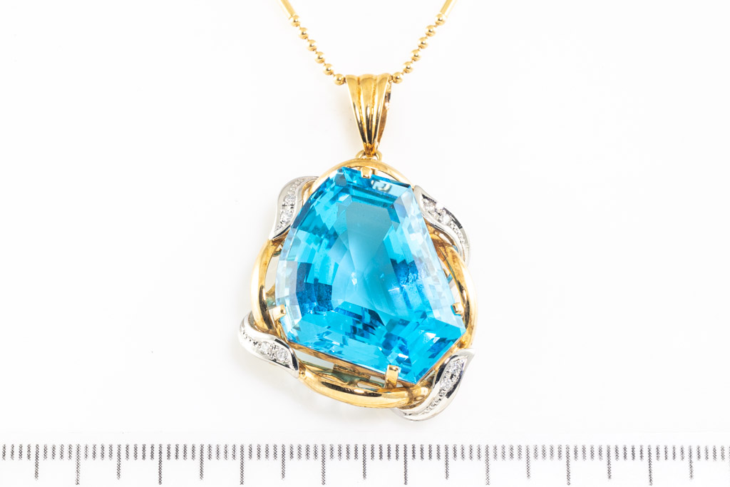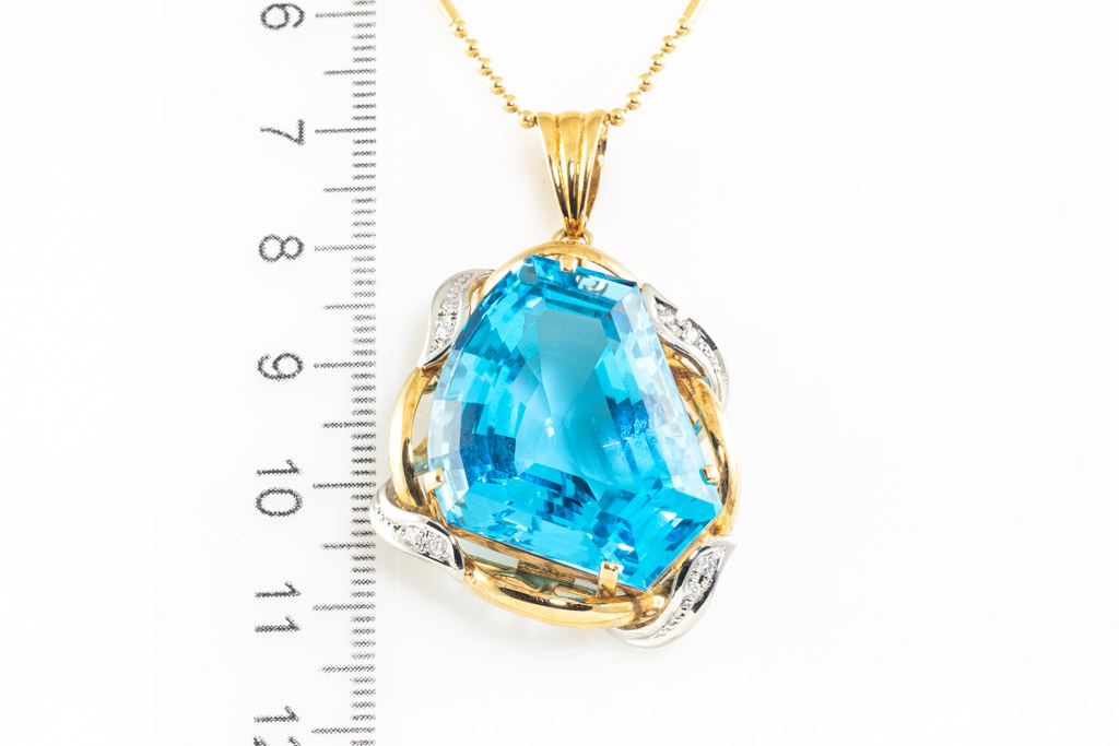 Topaz and Diamond pendant with fancy cut blue Topaz of 58.76ct and round Diamonds totalling 0.12cts. 18ct yellow gold and platinum with 40cm 18ct yellow gold chain. Weight 25.6g. (Pre-owned)