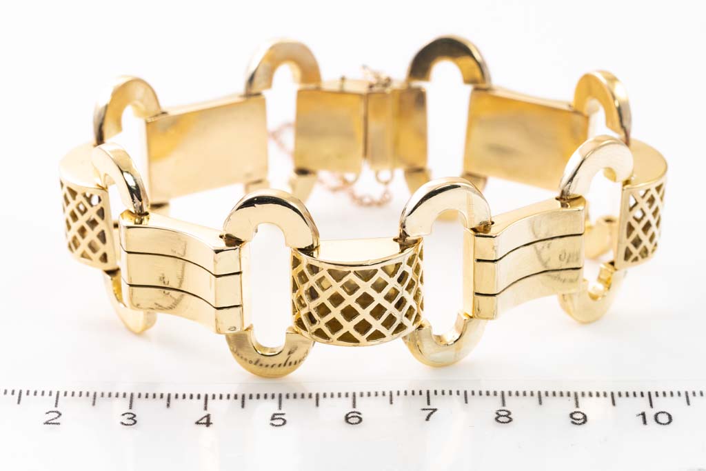 18ct yellow gold bracelet with safety chain. Length: 20cm. Weight 58.8g. (Pre-owned)