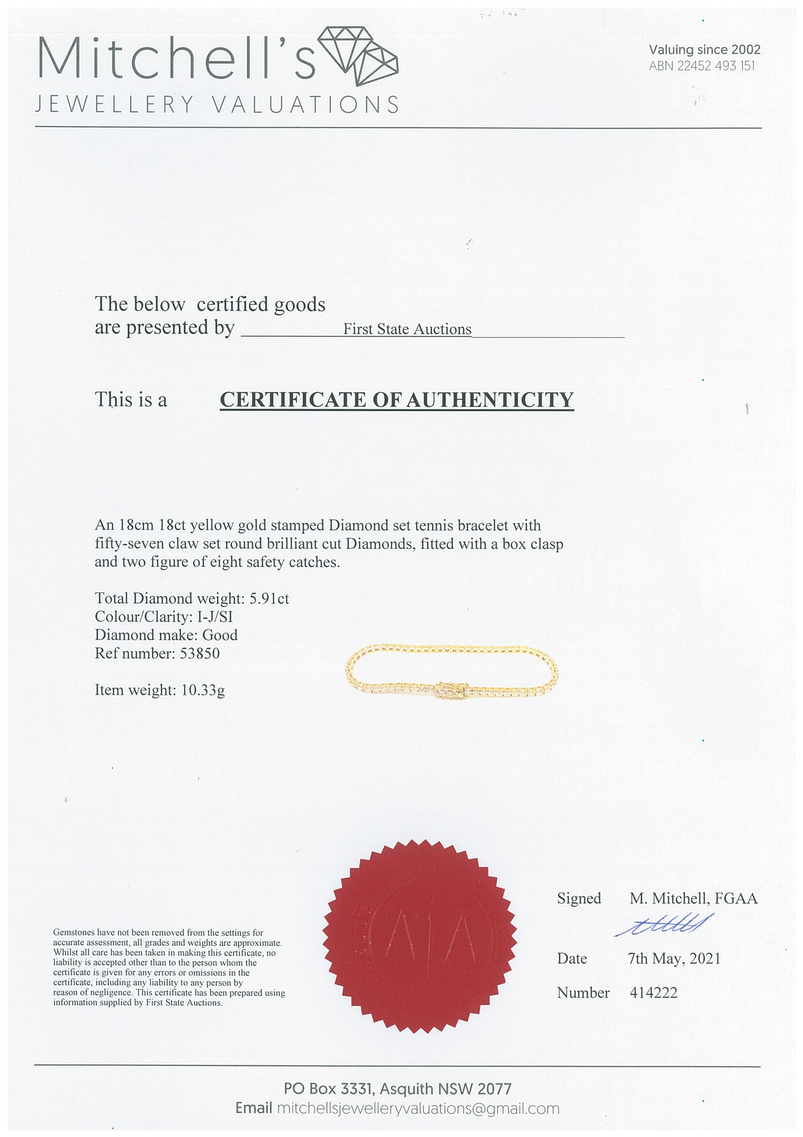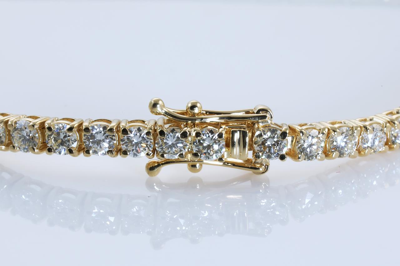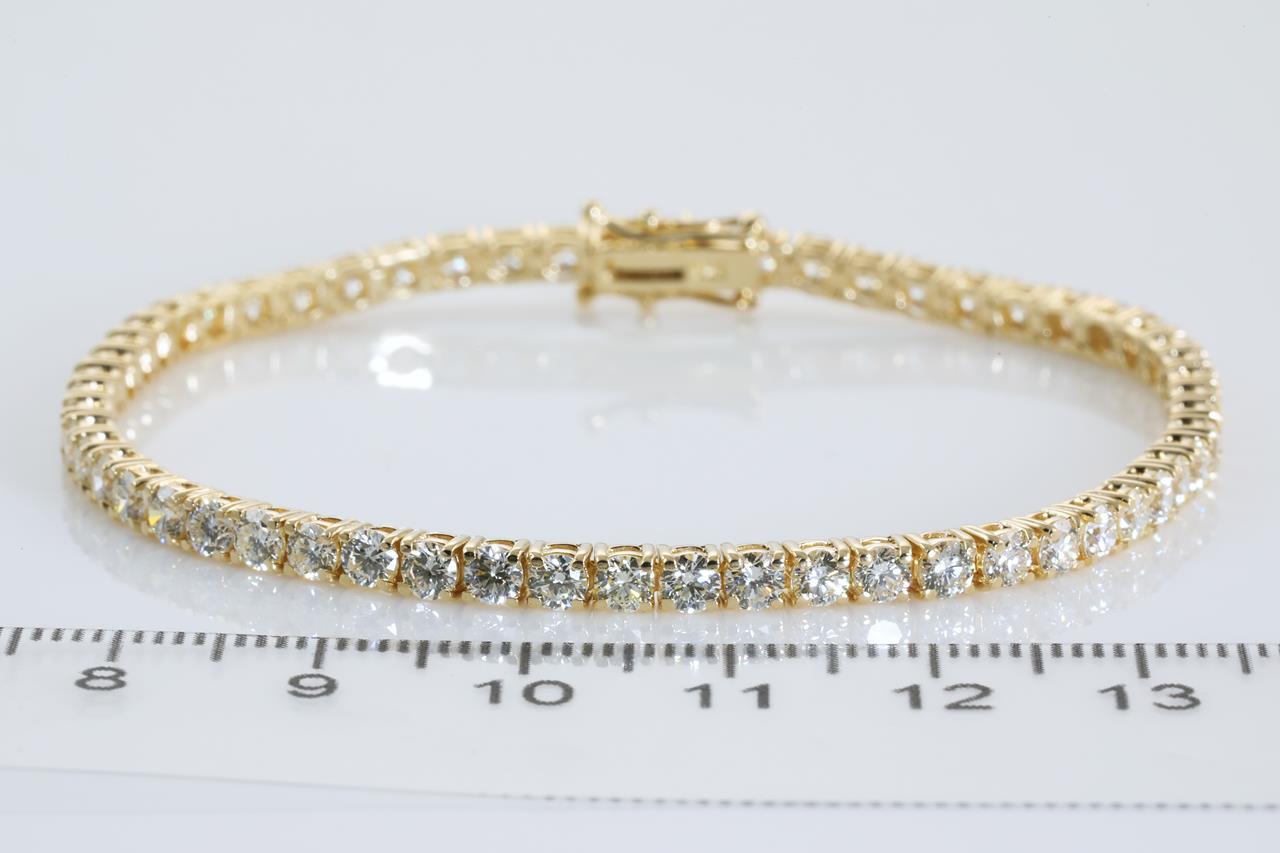 Diamond tennis bracelet with 57 round Diamonds totalling 5.91cts (Estimated grading: I-J SI). 18ct yellow gold. Length: 18cm. Weight: 10.3g. With certificate #414222. (New)
