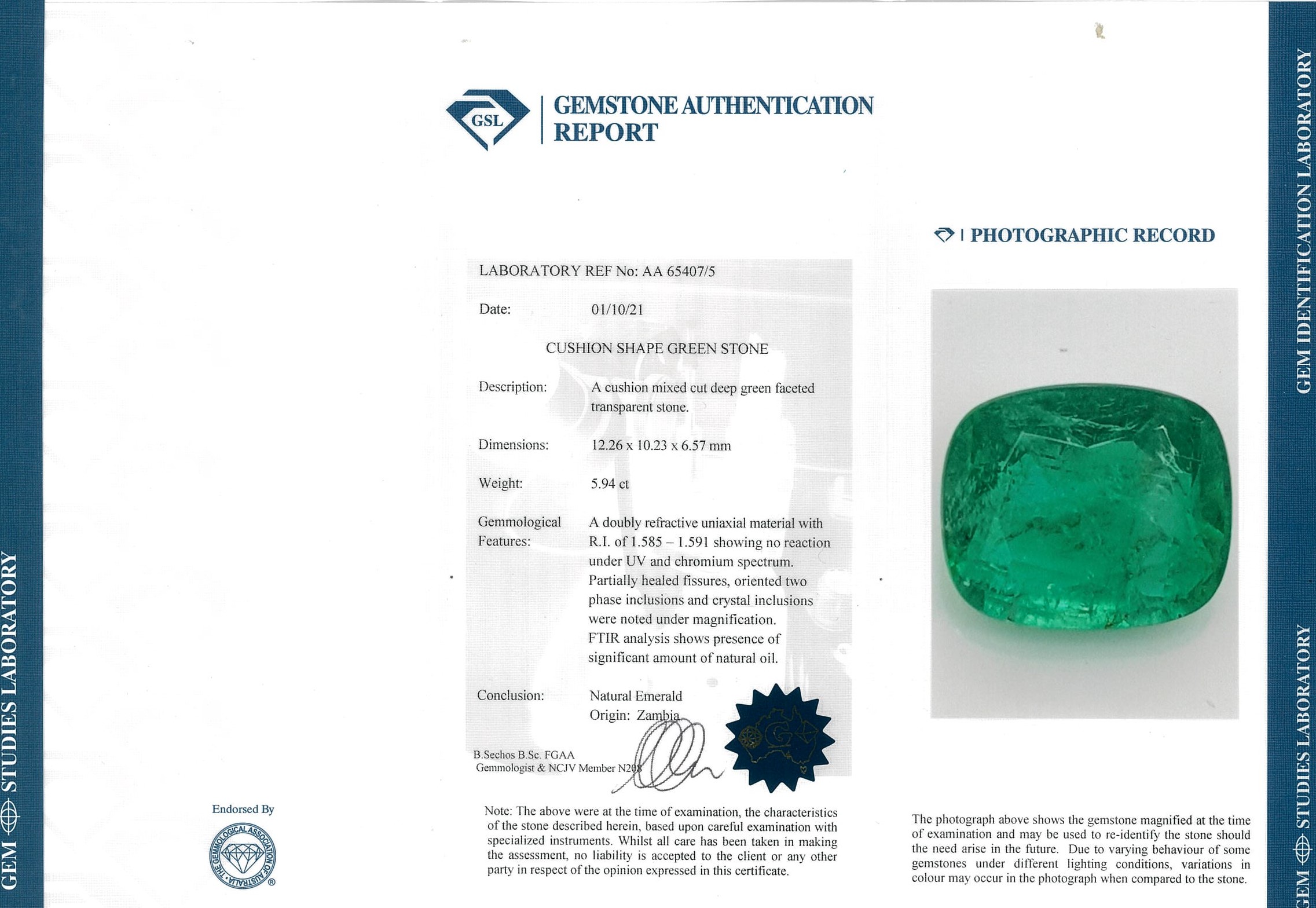A Loose cushion cut Zambian Emerald of 5.94cts. (with GSL report AA65407/5). (As New)