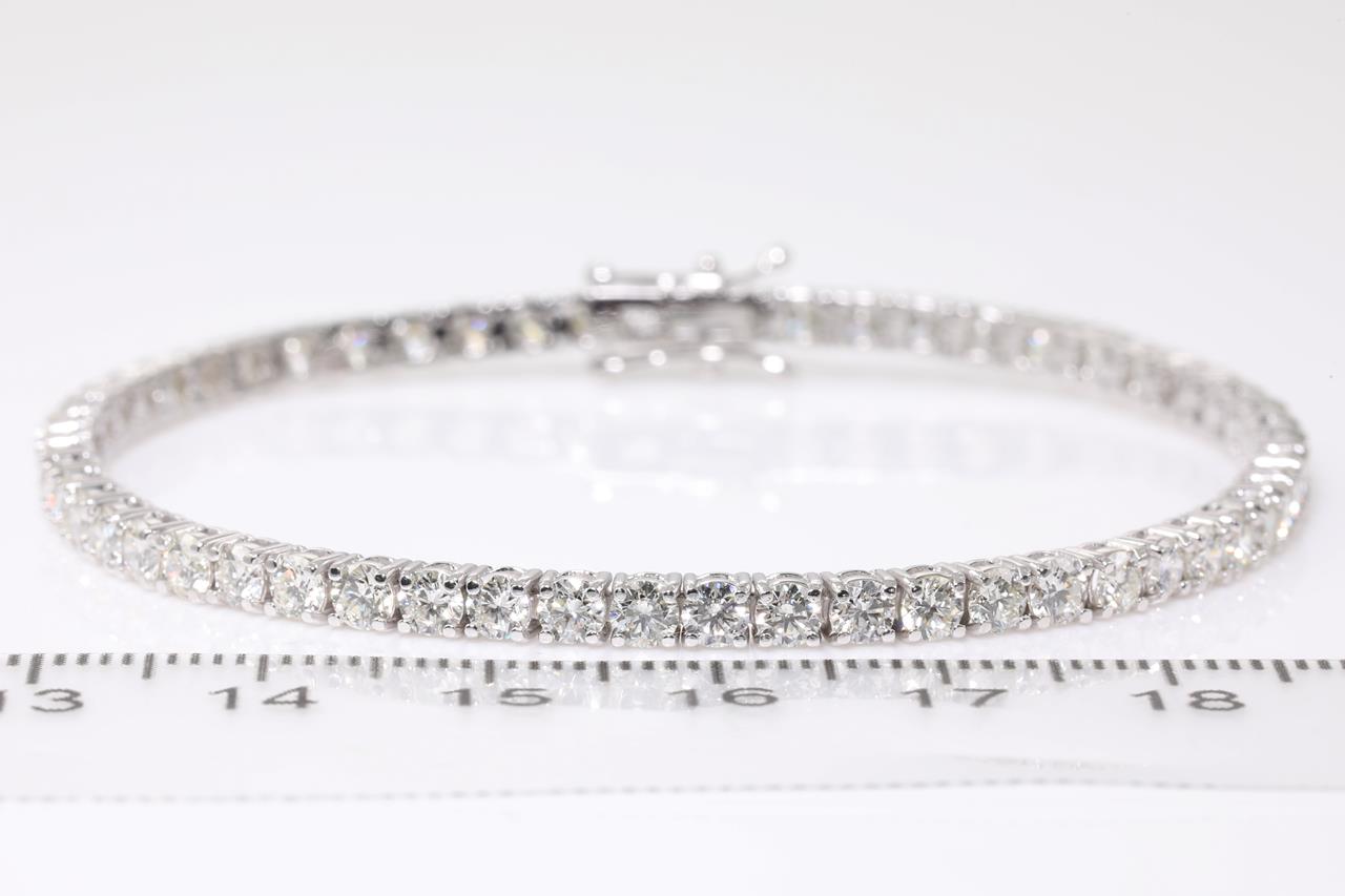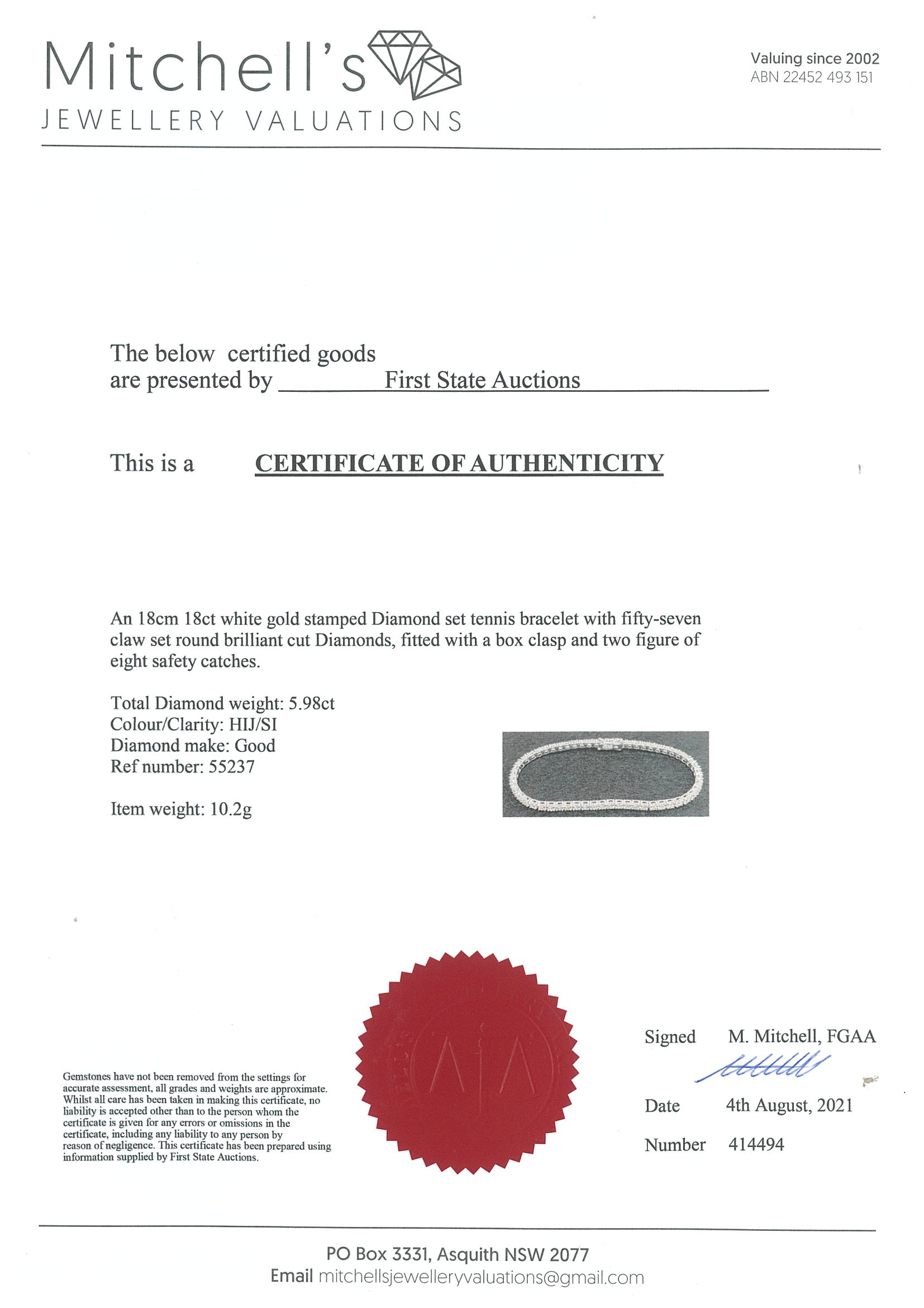 Diamond tennis bracelet with 57 round Diamonds totalling 5.98cts (Estimated grading: HIJ SI). 18ct white gold. Length: 18cm. Weight: 10.2g. With certificate #414494. (New)