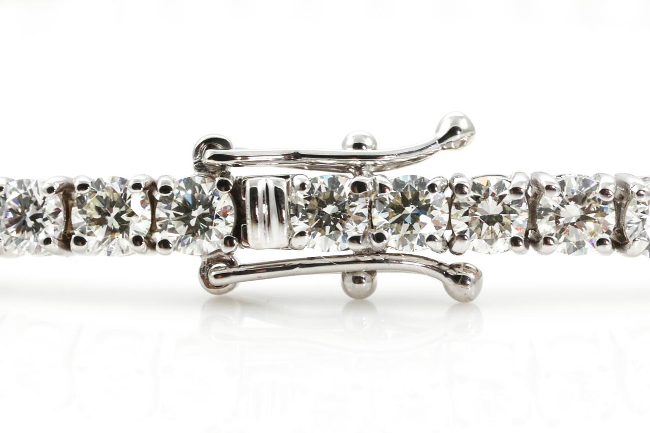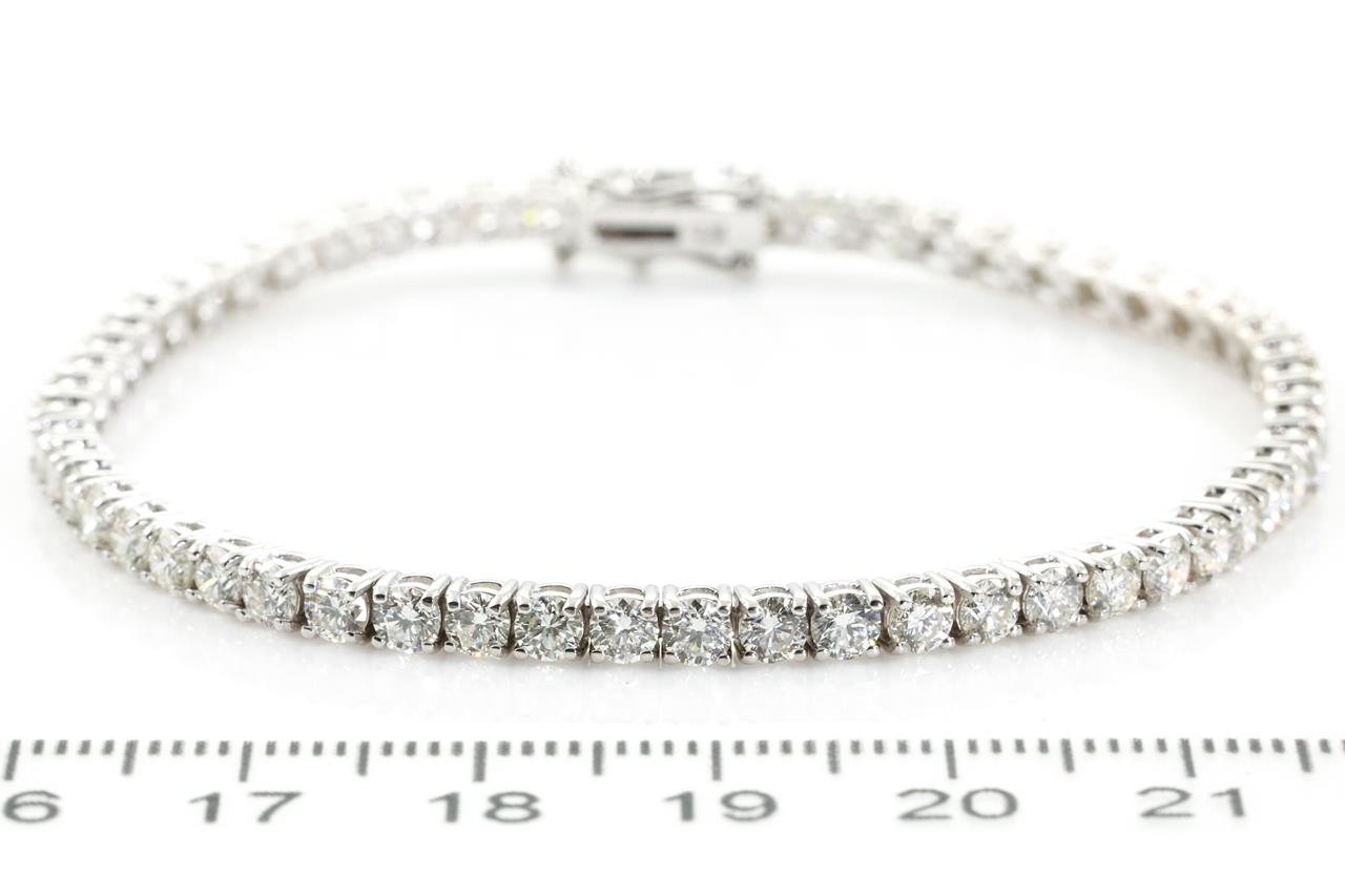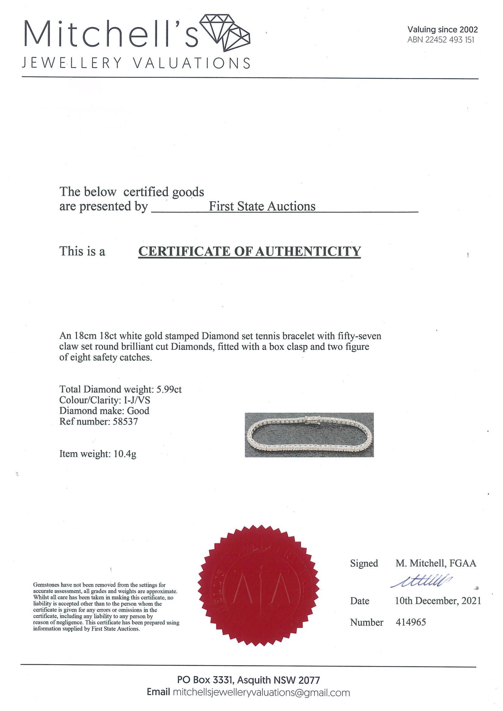 Diamond tennis bracelet with 57 round Diamonds totalling 5.99cts (Estimated grading: I-J VS). 18ct white gold. Length: 18cm. Weight: 10.4g. With certificate #414965. (New)