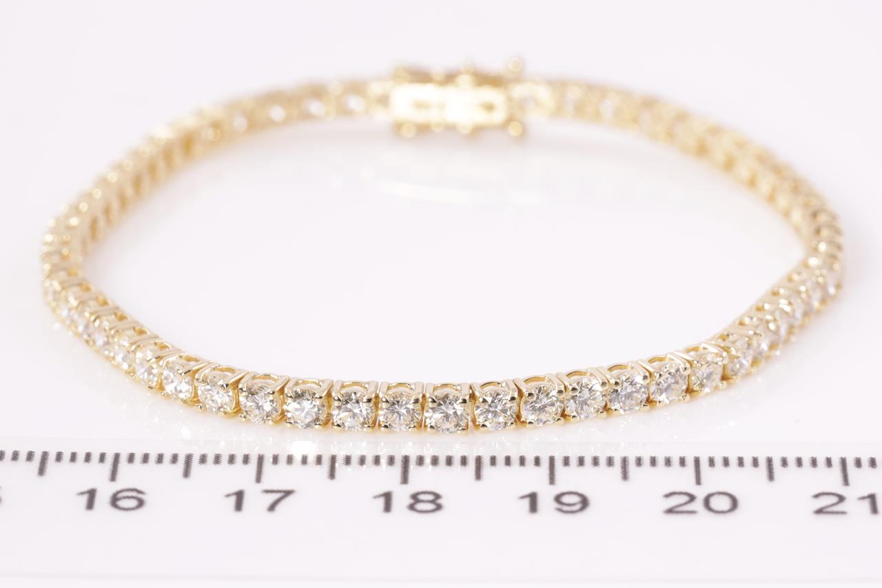 Diamond tennis bracelet with 57 round Diamonds totalling 6.00cts (Estimated grading: J VS). 18ct yellow gold. Length: 18cm. Weight: 10.7g. With certificate #414883. (New)