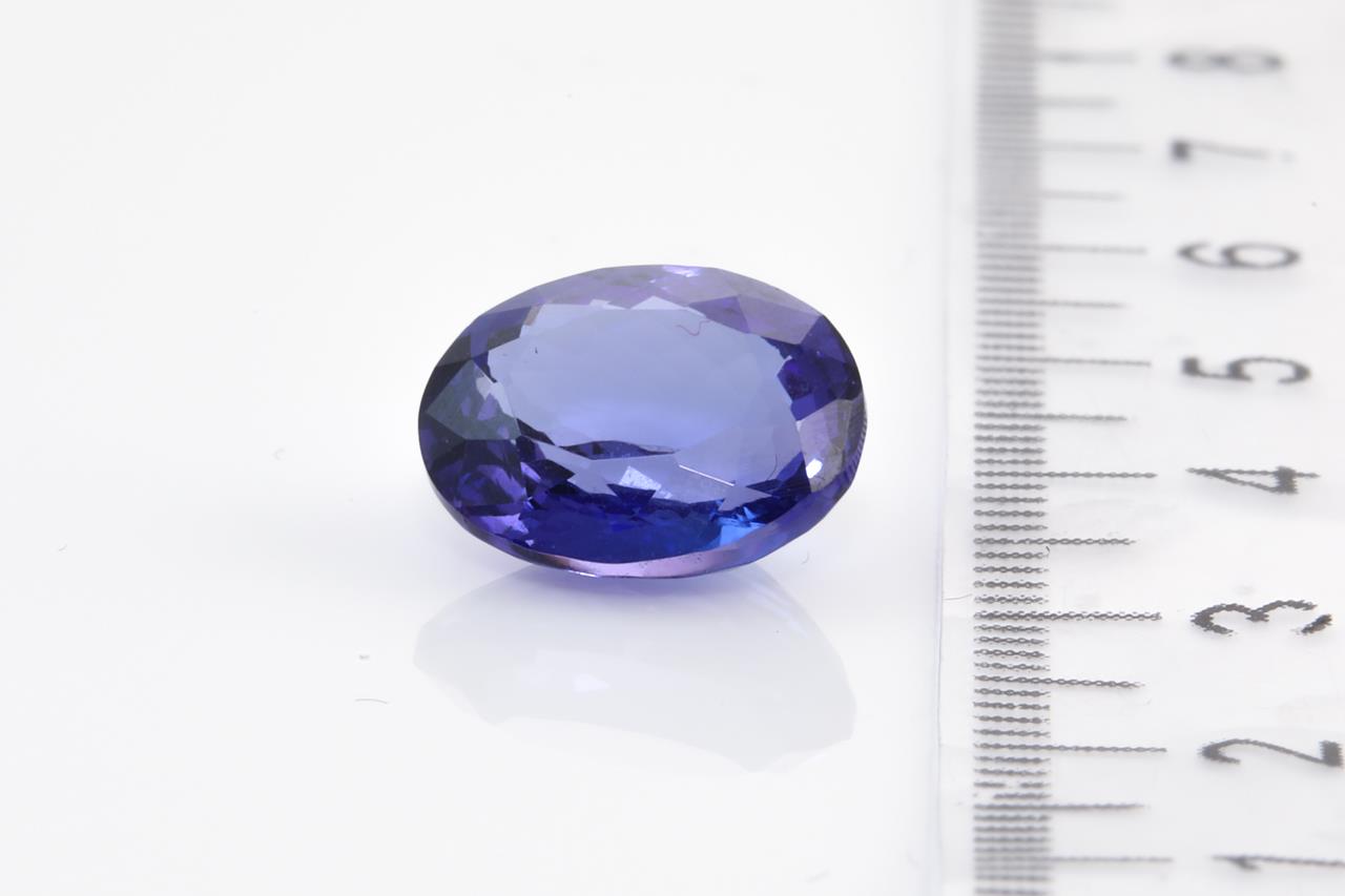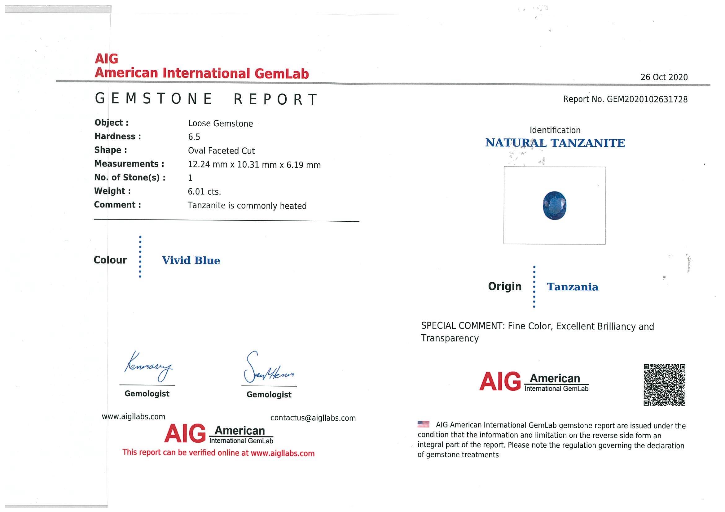 A loose oval cut Natural Tanzanite of 6.01ct (with AIG report #GEM2020102631728). Size: 12.2 x 10.3 x 6.1mm. (New)