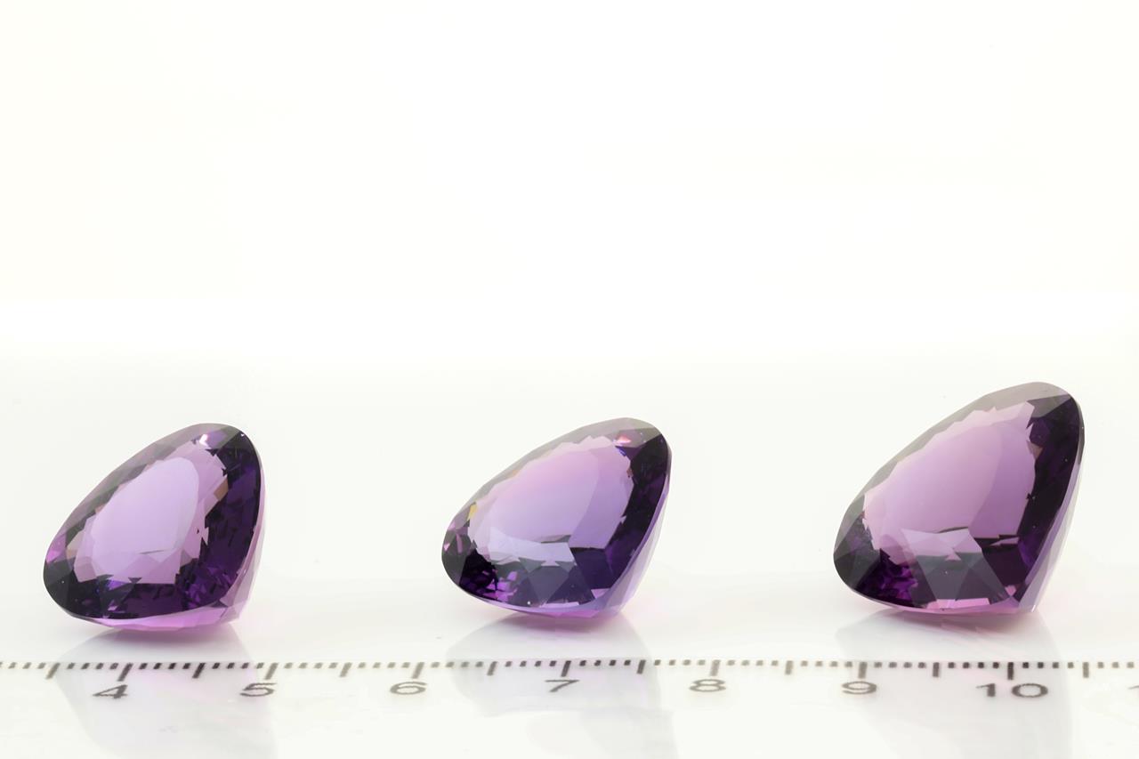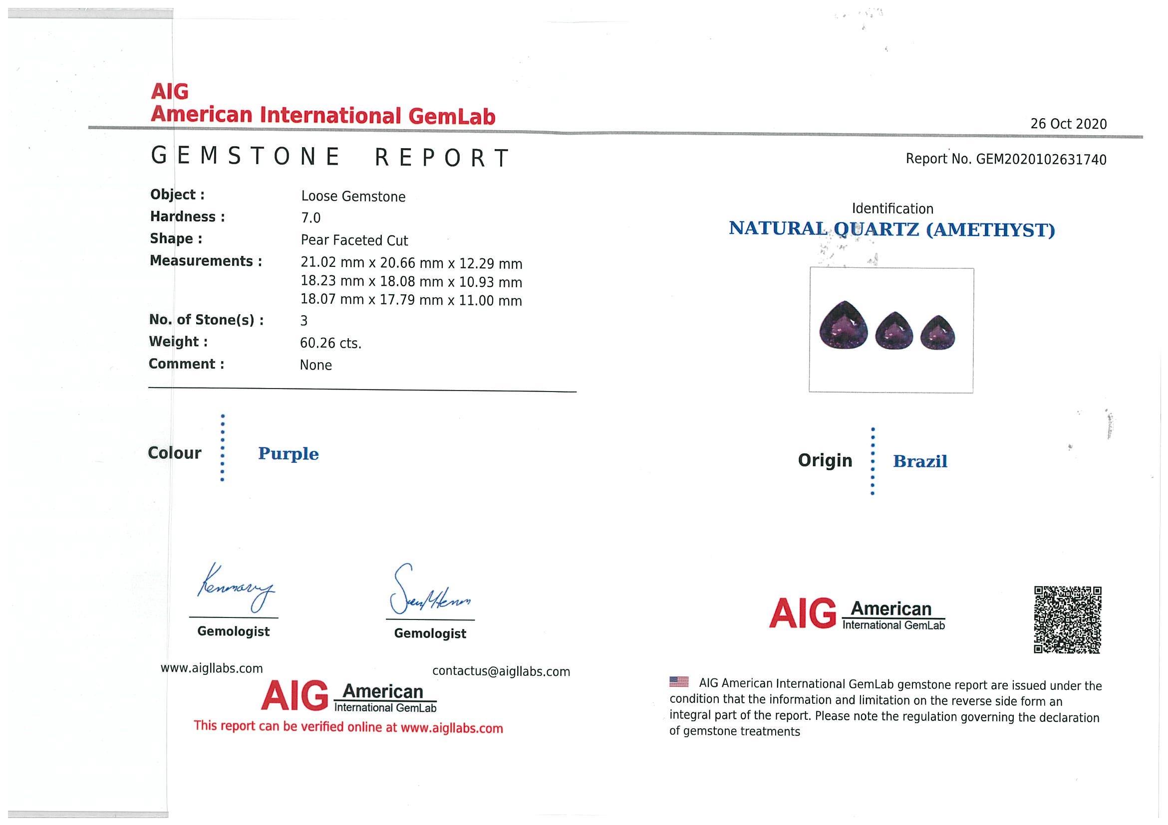 A loose parcel of pear cut Amethyst totalling 60.26cts (with AIG report #GEM2020102631740). Size: 21.0 x 20.6 x 12.2mm; 18.2 x 18.0 x 10.9mm; 18.0 x 17.7 x 11.0mm (New)